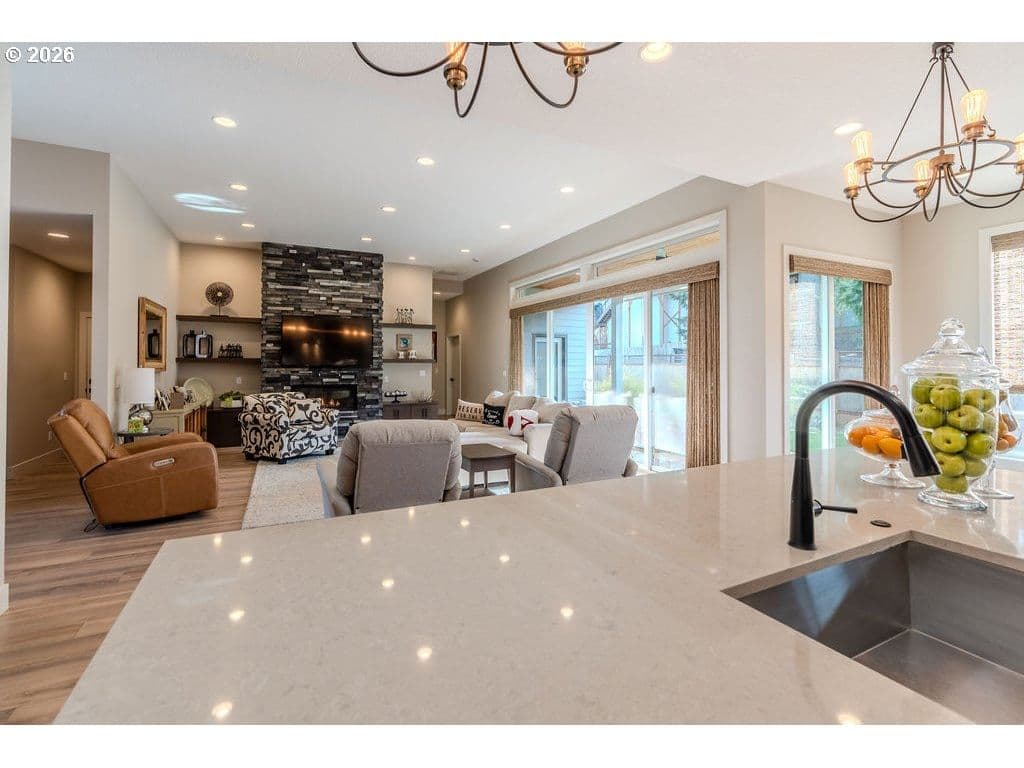 Step into this spacious, well-maintained home designed for both everyday comfort and effortless entertaining. The open-concept layout is highlighted by soaring 12-foot ceilings, abundant natural light, and a stunning floor-to-ceiling stone gas fireplace that anchors the main living space. The chef’s kitchen is a true showstopper, featuring an oversized island, quartz countertops, stainless steel Frigidaire appliances, a gas range with double oven, and a dedicated wet bar—perfect for hosting and gatherings.The private owner’s suite, thoughtfully separated from the secondary bedrooms, offers a peaceful retreat with generous space, a sliding barn door, and luxurious heated bathroom floors for added comfort. Throughout the home, you’ll find upgrades galore, reflecting pride of ownership and attention to detail.Outdoor living is just as impressive with a large, beautifully maintained backyard, covered patio, and multi-zone front and back sprinkler system. The epoxy-floor garage provides ample storage and a clean, finished look. Located in a highly sought-after neighborhood, this home is just minutes from a nearby park and splash pad, adding to its appeal.An entertainer’s delight with standout features, modern finishes, and exceptional functionality—this home truly has it all.
