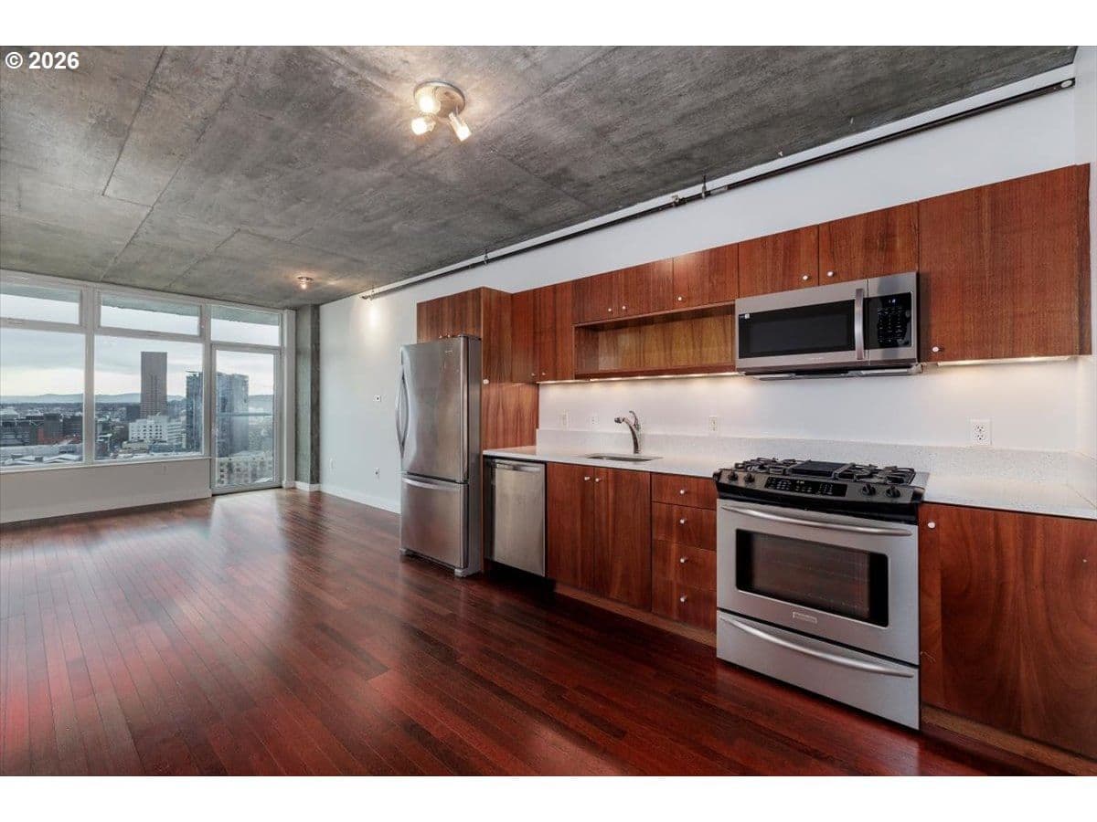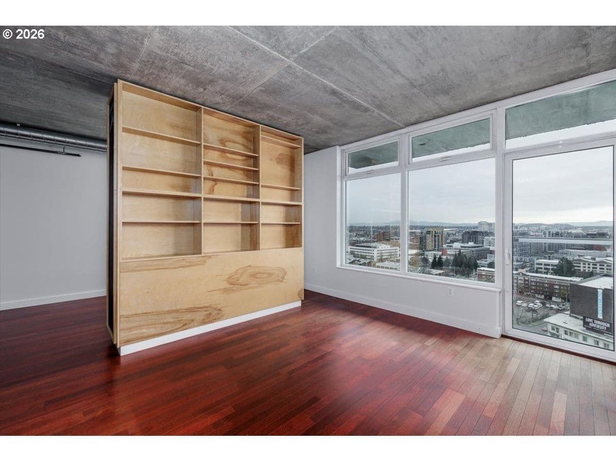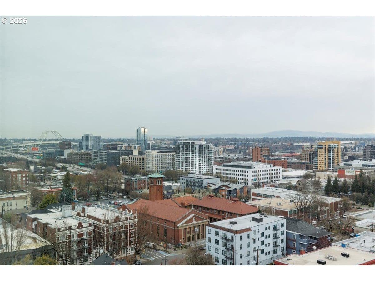 Improved Price! Exceptional East-facing unit on the 15th floor at The Civic, featuring the largest one-bedroom floor plan. Enjoy breathtaking views of the city, mountains, and Portland's iconic skyline and city lights. Amazing built-ins added to create additional space for Den/office/books. The modern kitchen is quipped with stainless steel appliances, quartz countertops, gas cooking, pantry and a brand-new microwave. Fresh interior paint and a newer washer/dryer(2024) add to the home's move-in ready appeal.Deeded parking space included. Enjoy 24/7 concierge service and secure building access. Just blocks from Zupan's, NW 23rd and the MAC club. Easy access to public transportation and a walk score of 99.
