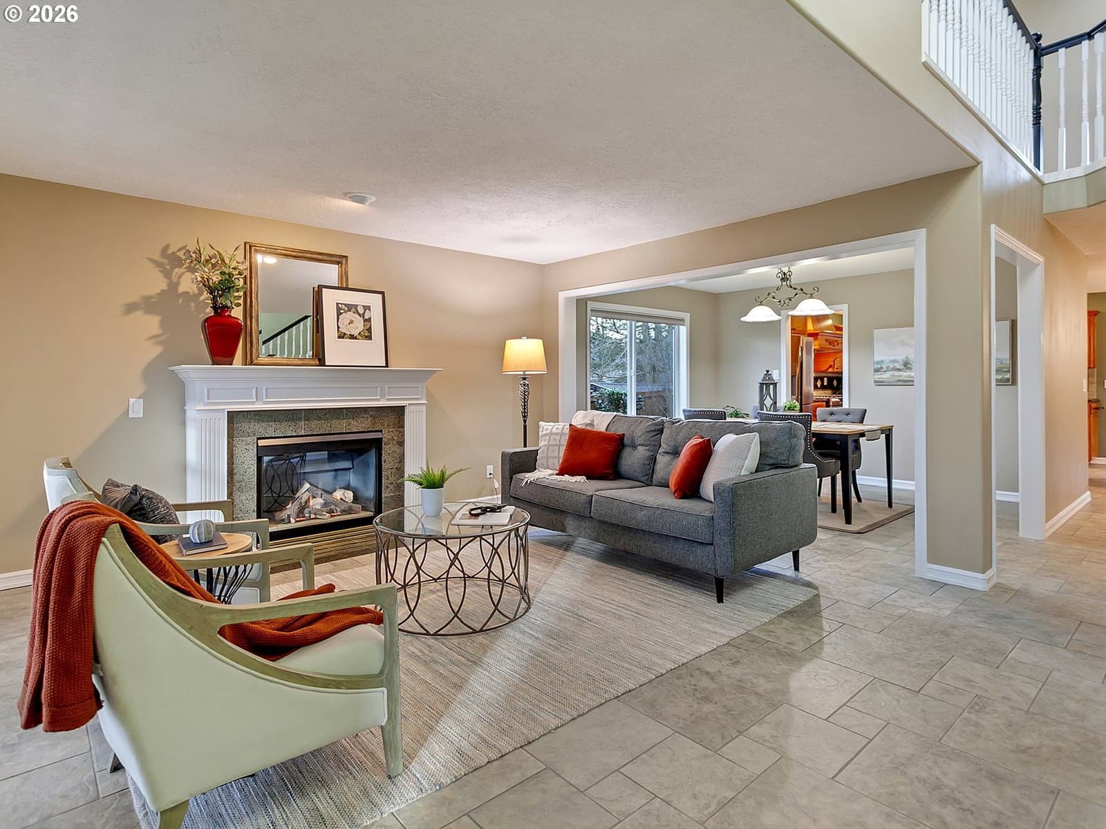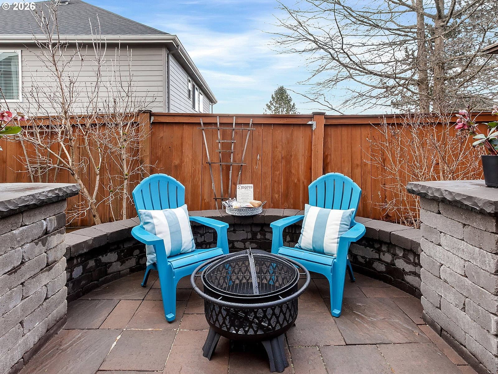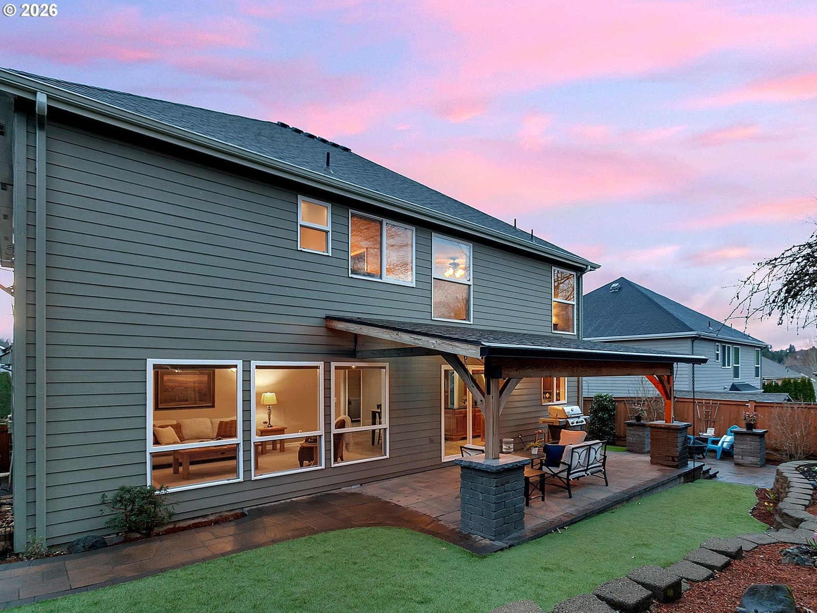 Nestled in a desirable Happy Valley neighborhood, this beautifully maintained two-story home offers an open, light-filled floor plan and an incredible year-round outdoor retreat. The private backyard features a custom covered patio, fire pit area, hot tub, drip irrigation and low-maintenance artificial turf, perfect for entertaining in every season.The kitchen showcases rich cherry cabinetry, granite countertops, a large island, tile floors and a gas range with overhead hood. The open concept kitchen-living area flows seamlessly into the spacious living room with oversized windows and abundant natural light. A formal dining room and cozy sitting room with a gas fireplace create inviting gathering spaces. The main-level office or guest room sits near a convenient half bath for added flexibility.Upstairs offers four bedrooms including a generous primary suite with double sinks, cherry cabinets and granite countertops, jetted tub, separate shower and walk-in closet. A second full bath with double sinks, granite countertops and cherry cabinets and upstairs laundry add everyday convenience.A two-car garage with built-ins provides ample storage. Flat RV parking with 30-amp hookup accommodates up to a 30-ft RV, plus two powered storage sheds. There is also a generator inlet plug on the RV pad for connecting a whole house generator and interlock kit on the electrical panel as required by code when connecting a generator. Located on a quiet cul-de-sac near parks, trails, shopping and community amenities. Updates include newer roof with owned solar panels, tankless water heater, furnace and custom patio cover. Bridge City Community Management