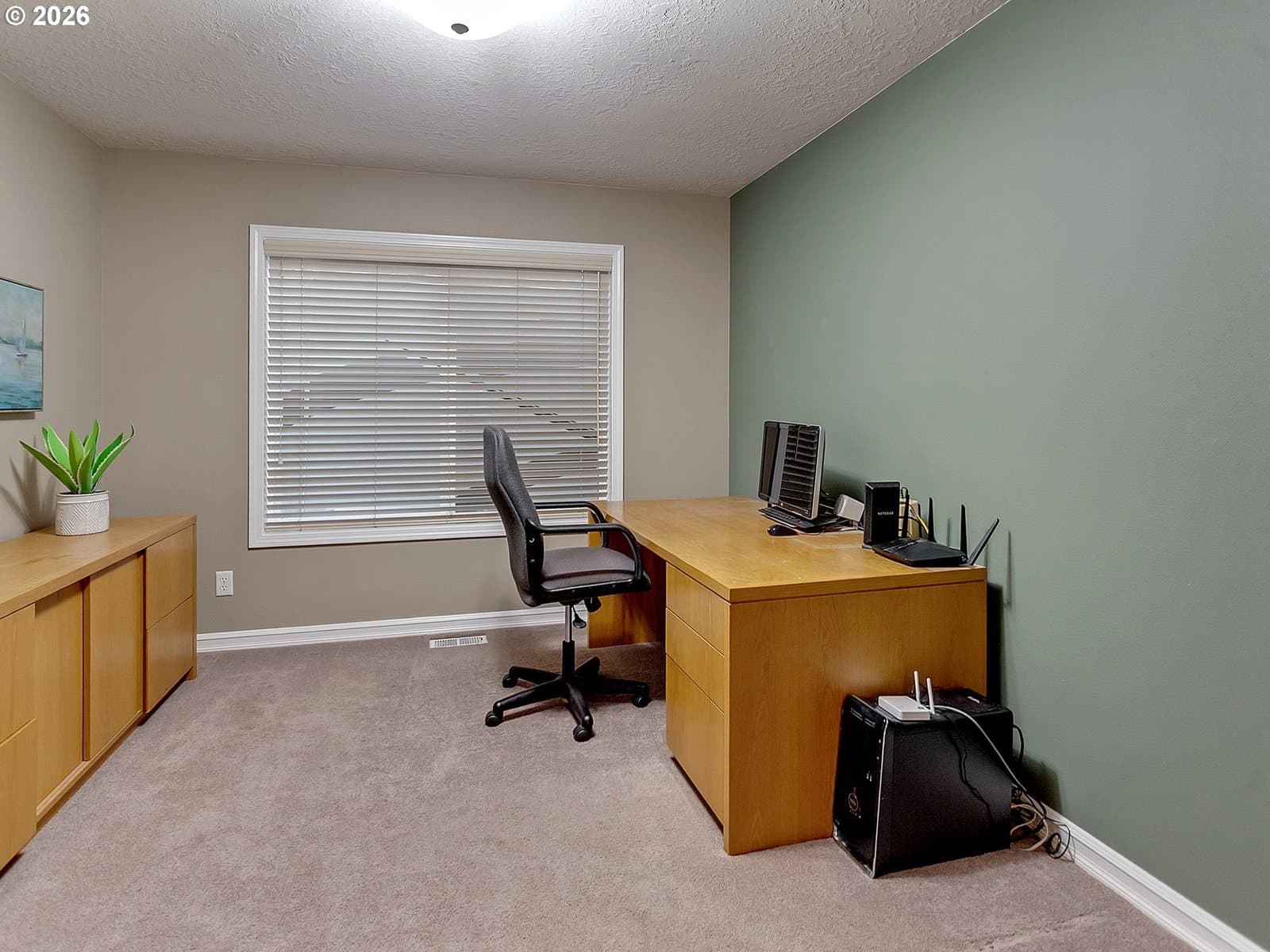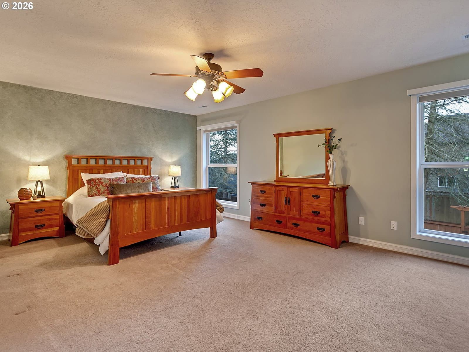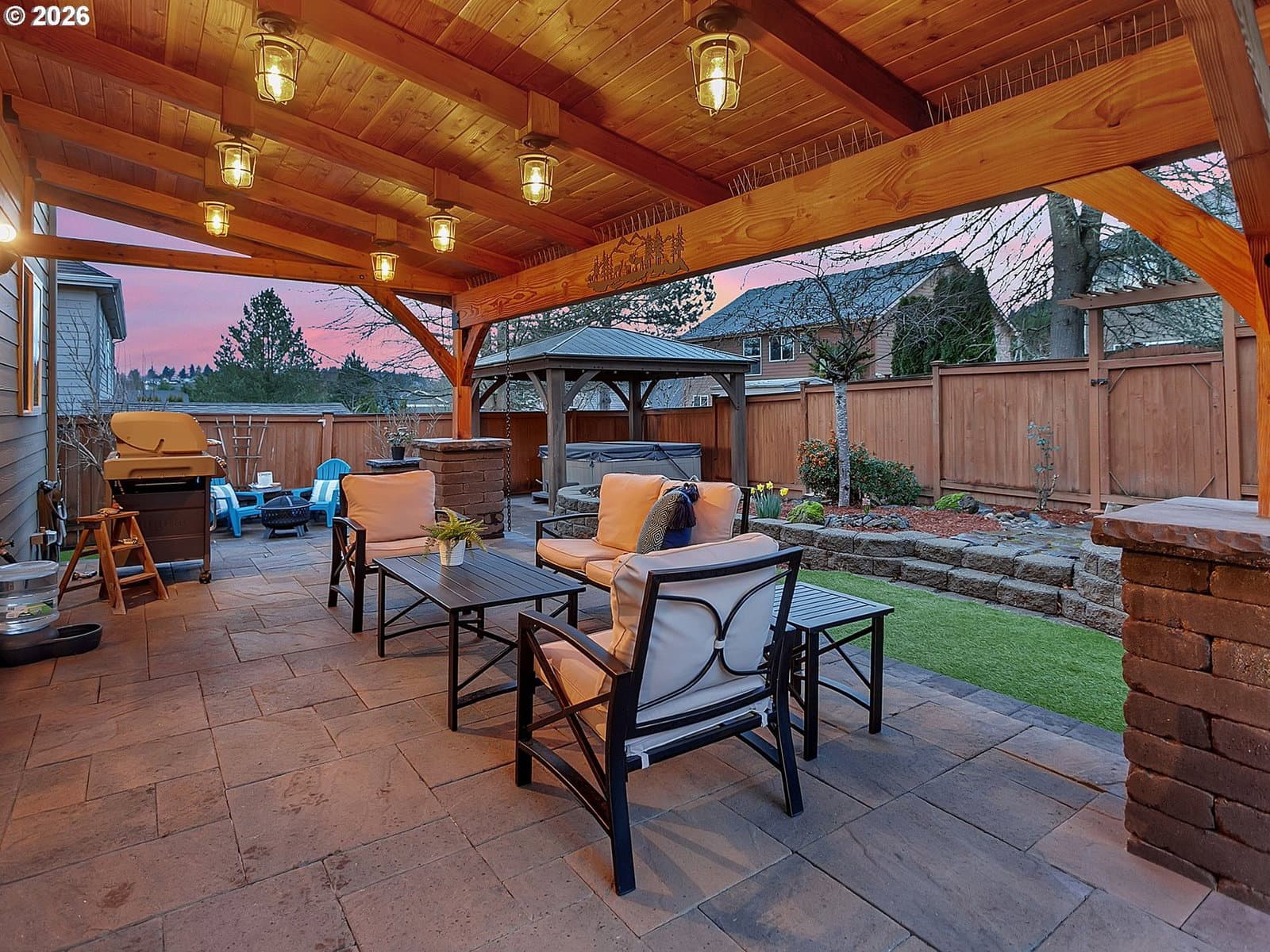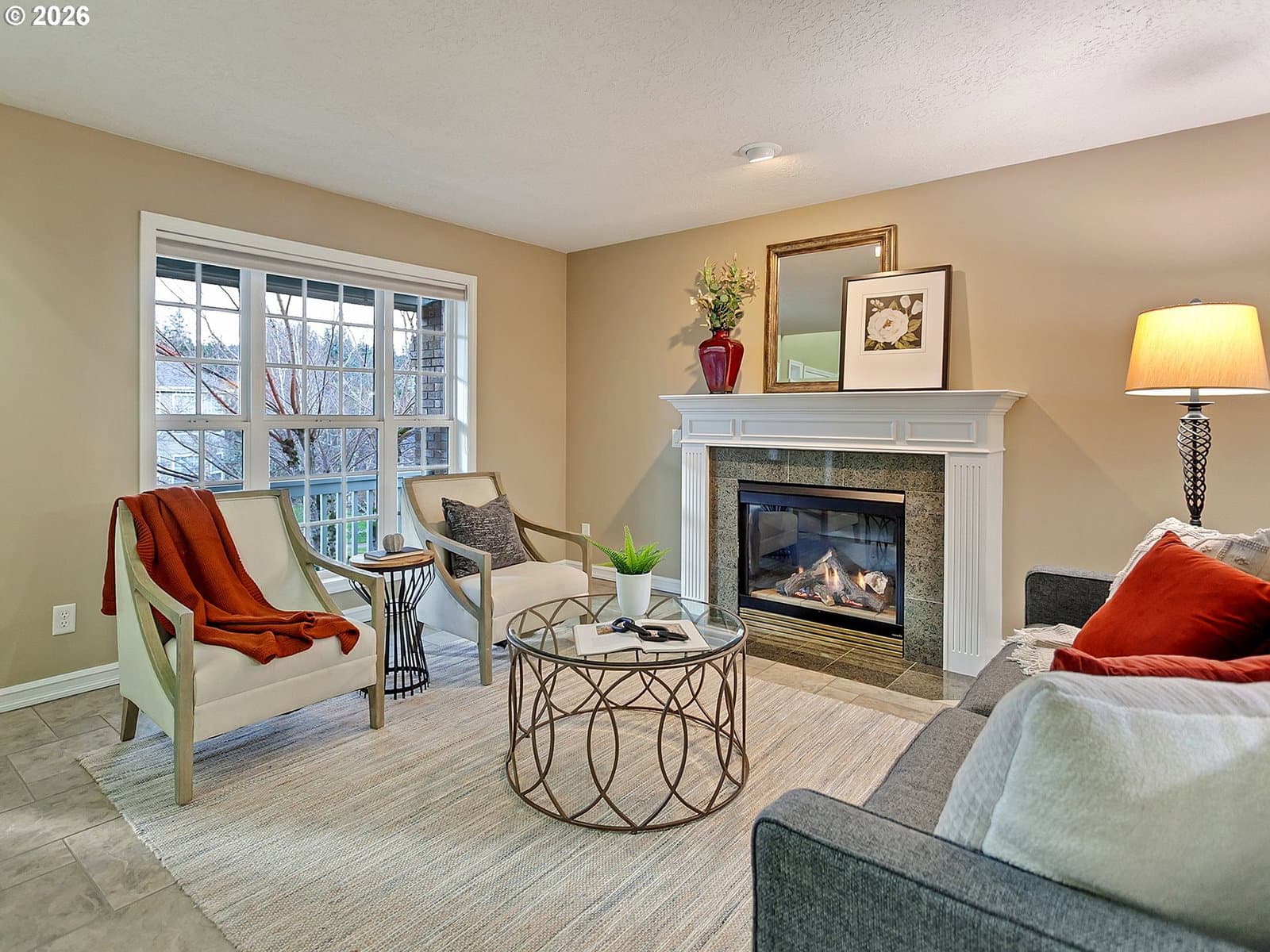 Nestled in a desirable Happy Valley neighborhood, this beautifully maintained two-story home offers an open, light-filled floor plan and an incredible year-round outdoor retreat. The private backyard features a custom covered patio, fire pit area, hot tub, drip irrigation and low-maintenance artificial turf, perfect for entertaining in every season.The kitchen showcases rich cherry cabinetry, granite countertops, a large island, tile floors and a gas range with overhead hood. The open concept kitchen-living area flows seamlessly into the spacious living room with oversized windows and abundant natural light. A formal dining room and cozy sitting room with a gas fireplace create inviting gathering spaces. The main-level office or guest room sits near a convenient half bath for added flexibility.Upstairs offers four bedrooms including a generous primary suite with double sinks, cherry cabinets and granite countertops, jetted tub, separate shower and walk-in closet. A second full bath with double sinks, granite countertops and cherry cabinets and upstairs laundry add everyday convenience.A two-car garage with built-ins provides ample storage. Flat RV parking with 30-amp hookup accommodates up to a 30-ft RV, plus two powered storage sheds. There is also a generator inlet plug on the RV pad for connecting a whole house generator and interlock kit on the electrical panel as required by code when connecting a generator. Located on a quiet cul-de-sac near parks, trails, shopping and community amenities. Updates include newer roof with owned solar panels, tankless water heater, furnace and custom patio cover. Bridge City Community Management