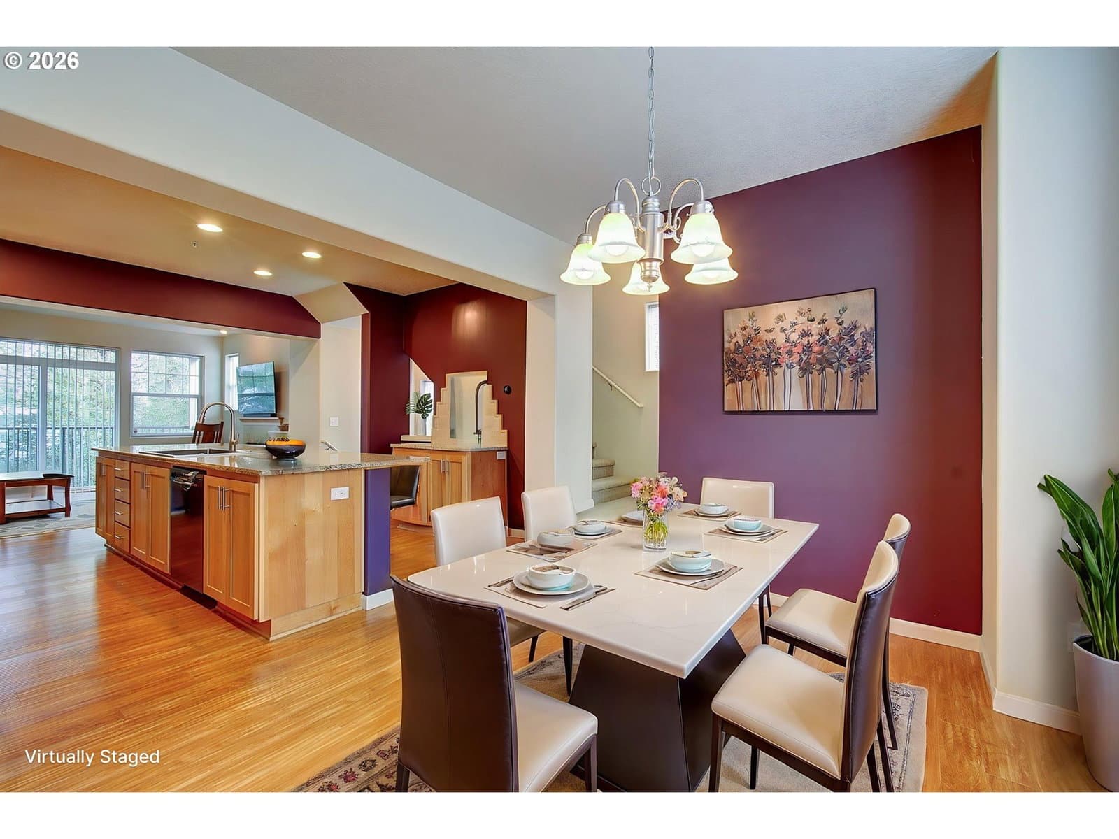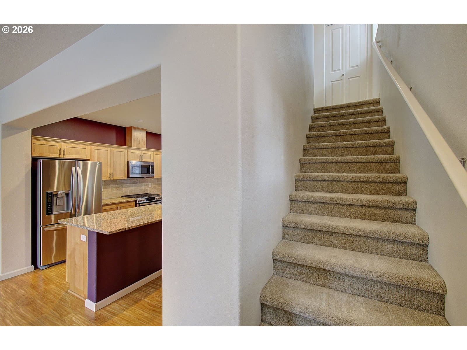 Open House Saturday March 7th! This 2 bedroom, 2.5 bathroom townhouse offers 1,366 square feet with an open main-level layout and numerous upgrades throughout. The kitchen features granite countertops, tile backsplash, stainless steel appliances, Bosch dishwasher, upgraded GE Monogram Series gas range and microwave, under-cabinet lighting, and a large island with deep sink that connects easily to the dining and living areas. The living room includes a gas fireplace and access to a covered balcony deck. Upstairs, the primary bedroom includes coffered ceilings and an attached bathroom with marble countertops, dual vanity, and walk-in shower. A loft area provides flexible space for an office or guest setup, and the laundry area is conveniently located upstairs with new LG washer and dryer included. Additional features include a smart doorbell and thermostat, freshly cleaned carpets, garage storage cabinets, and a deep two-car garage with smart garage door opener. Well maintained and move-in ready with thoughtful upgrades across the home. [Home Energy Score = 7. HES Report at https://rpt.greenbuildingregistry.com/hes/OR10245781]
