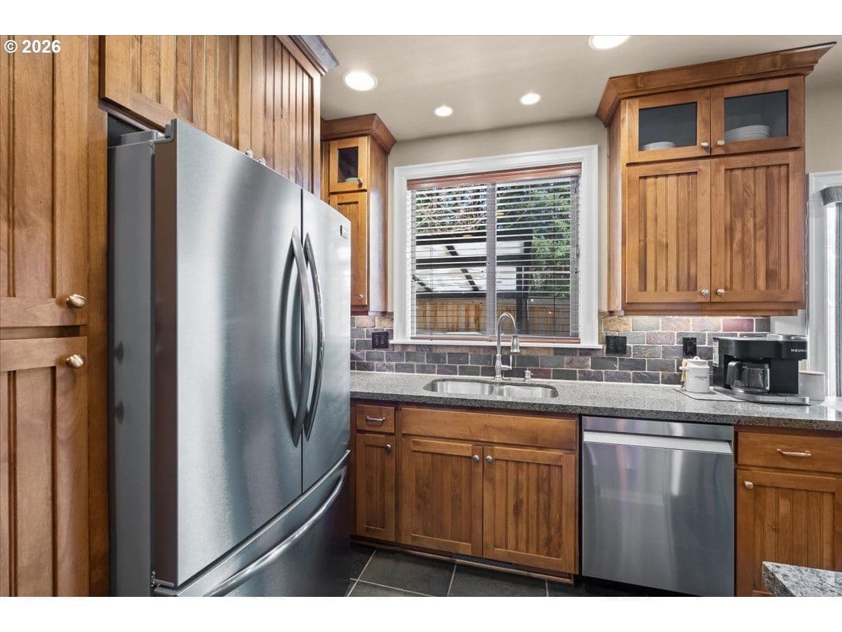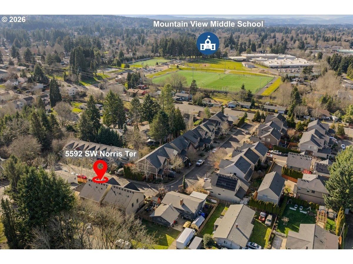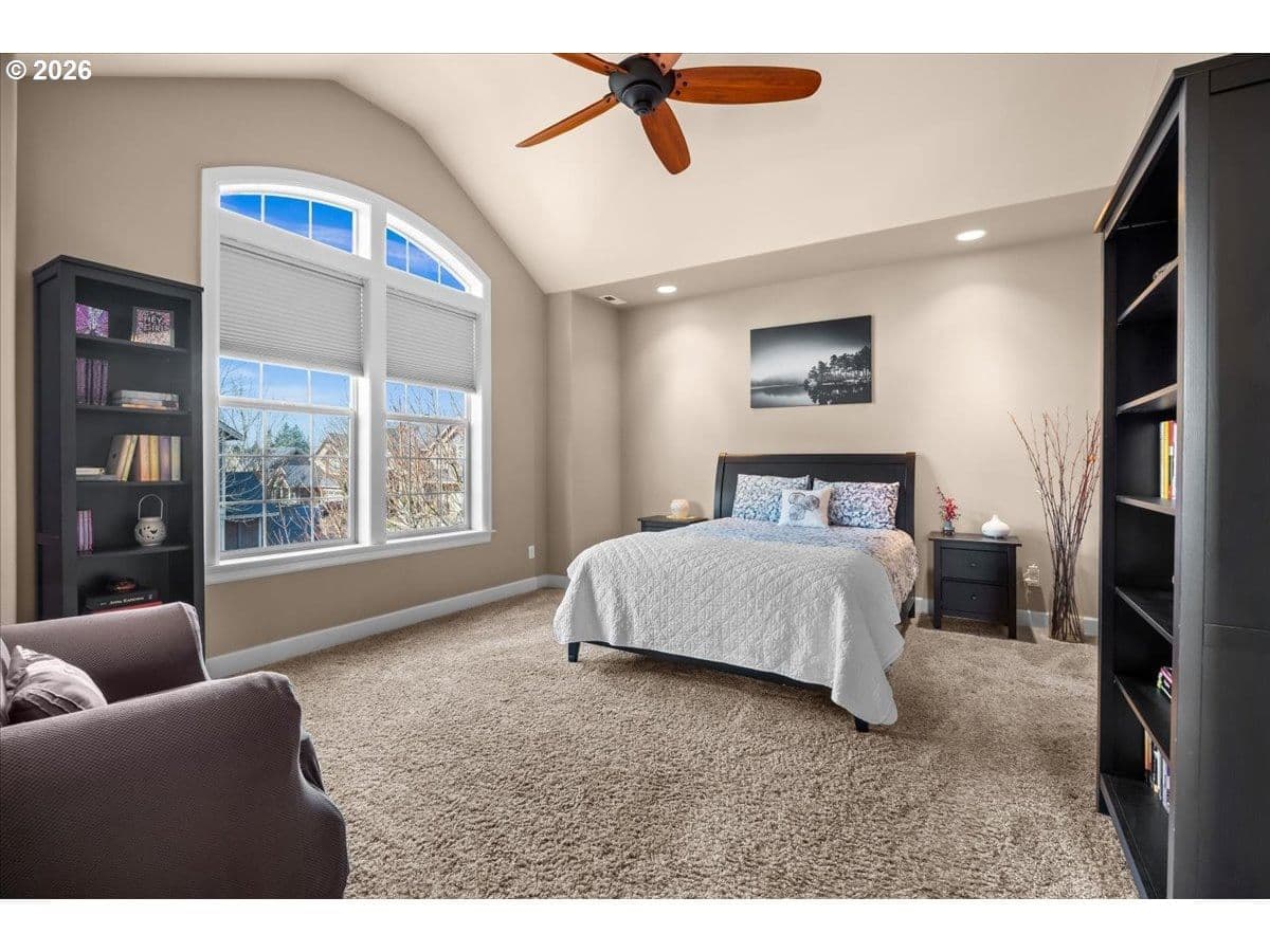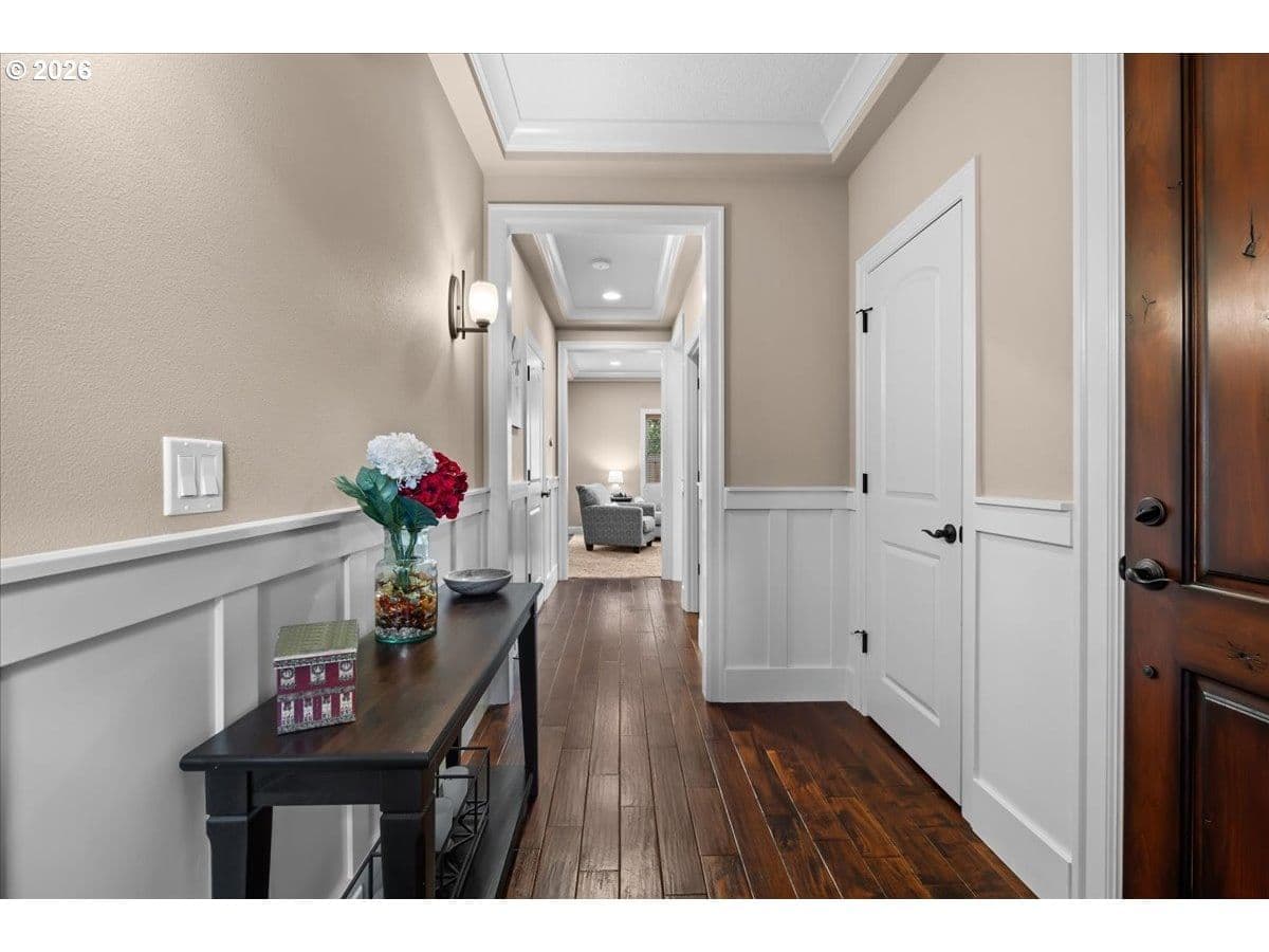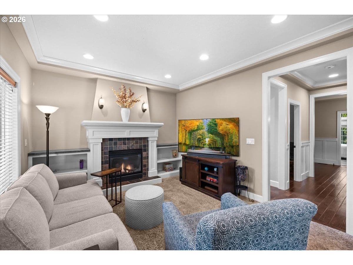 Impeccable craftsmanship and refined finishes define this stunning home, ideally situated in a fantastic location on a quiet dead-end street with easy access to everything you need. Just minutes from Nike campus, intel campuses, shopping & restaurants. Step inside to discover real hardwood floors, wainscot, high ceilings accented by crown molding and recessed lighting, creating an elegant yet welcoming atmosphere throughout the home. The chef’s kitchen is beautifully appointed with gas cooking, stainless steel appliances, slab granite countertops, gorgeous cabinetry, and an inviting adjacent breakfast bar — perfect for both everyday living and entertaining. The living room offers warmth and comfort with custom built-ins surrounding a cozy gas fireplace, making it the heart of the home. Retreat to the relaxing spacious owner's suite featuring a spa-inspired bath with a walk-in shower, dual vanities, and a generous walk-in closet. In addition upstairs, you’ll find a spacious loft area that functions beautifully as a second living space, media room, sitting area, or home office. Two additional bedrooms and a full bathroom with double sinks provide comfort and convenience, while the upstairs laundry adds everyday ease and functionality. A main-level bedroom provides flexibility for guests, multi-generational living. Enjoy a private backyard setting — ideal for summer evenings, morning coffee, or quiet relaxation. With timeless finishes, thoughtful design, real hardwood flooring, and an exceptional location in desirable Cooper Mountain, this home truly offers the perfect blend of comfort, quality, and convenience.