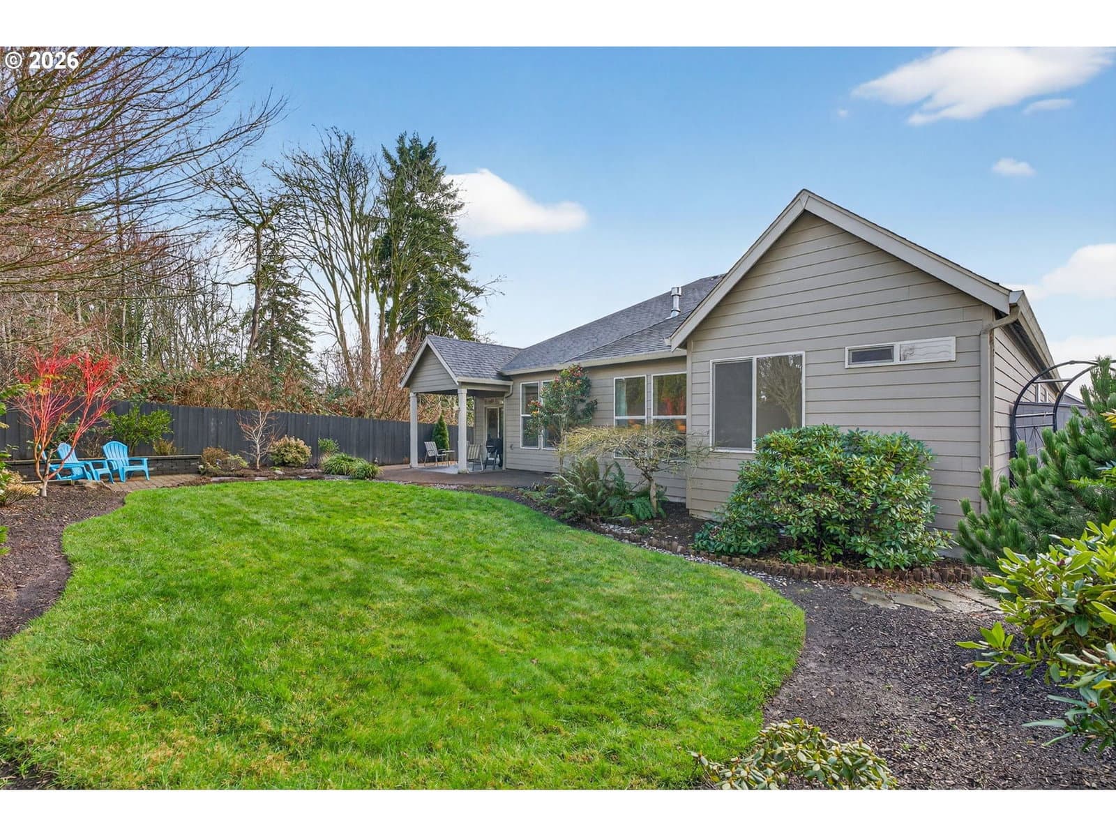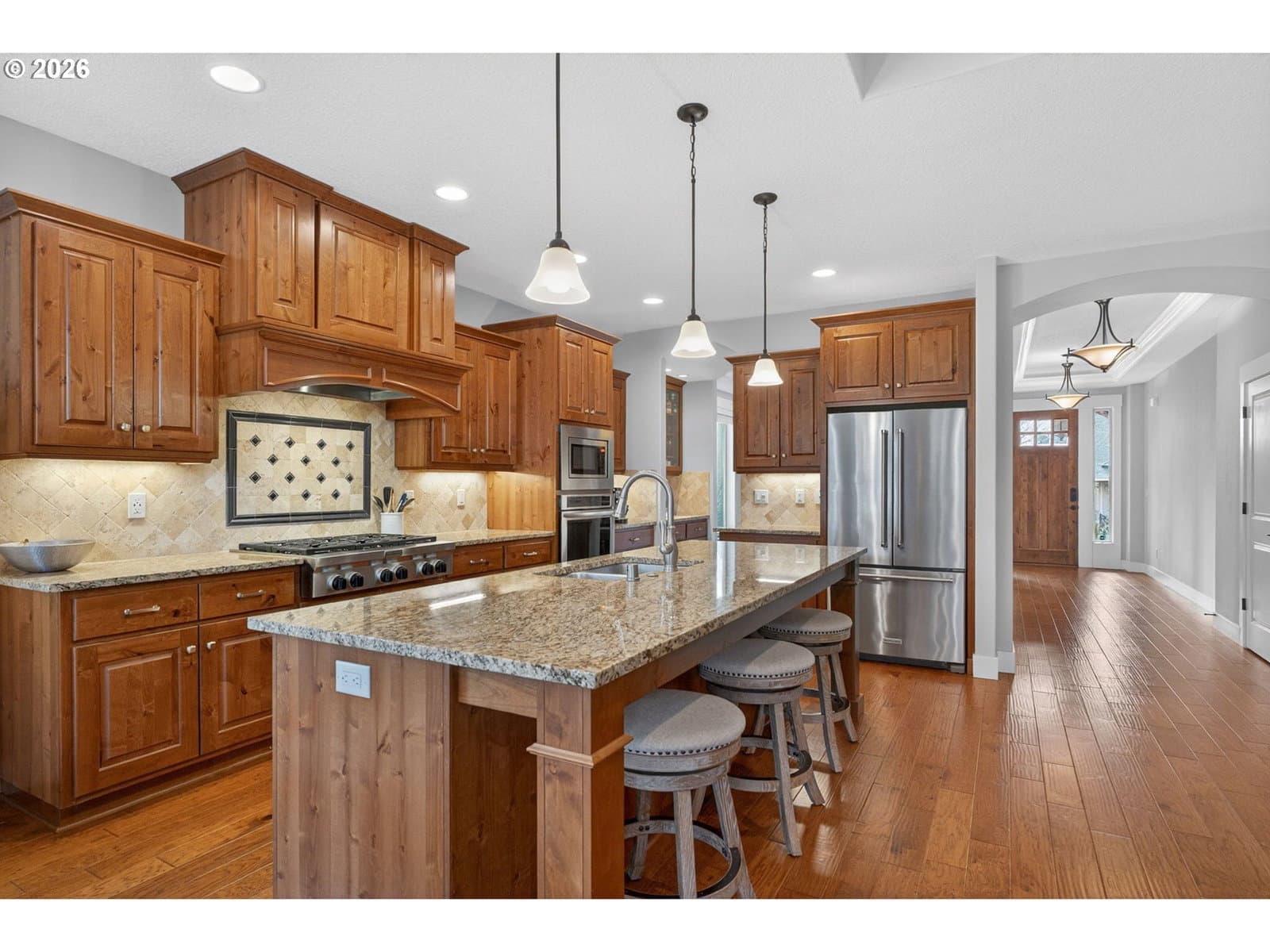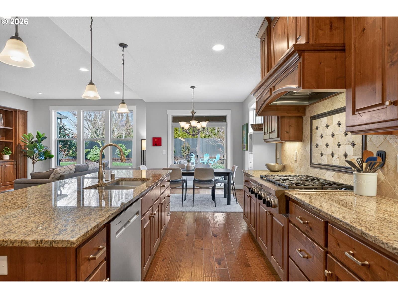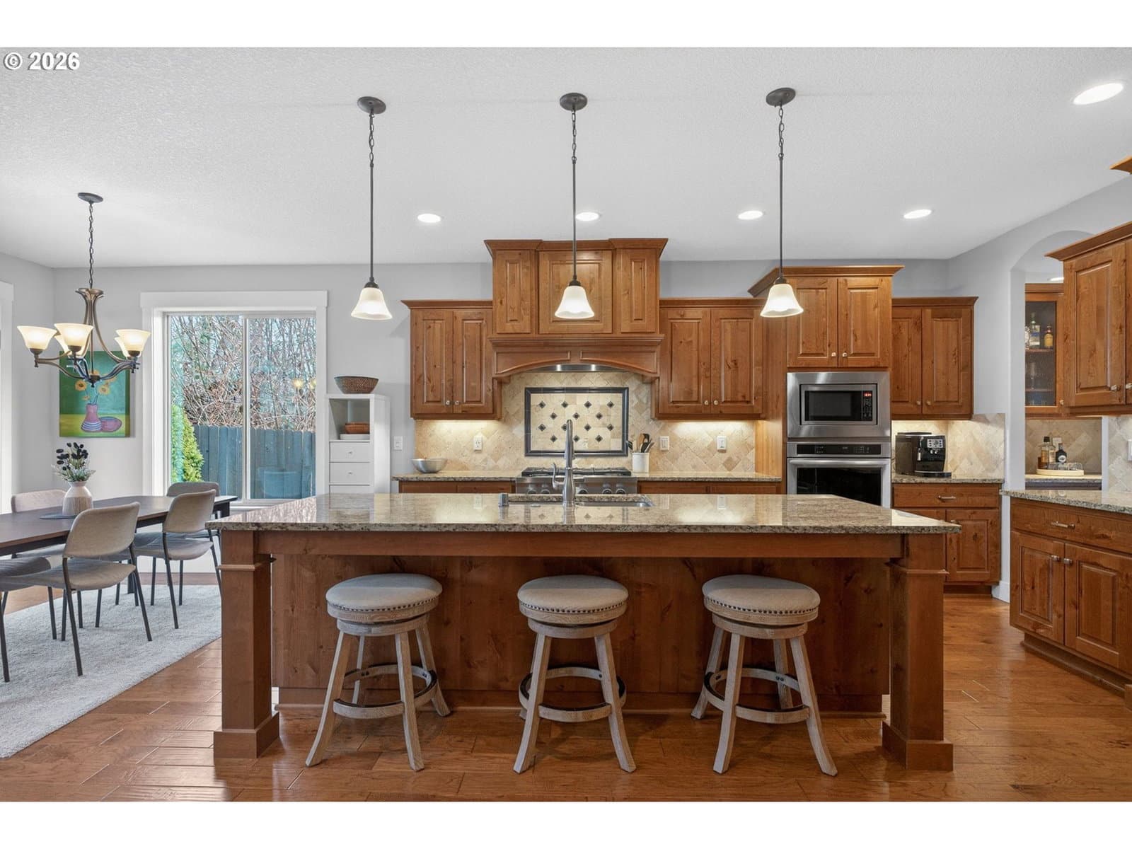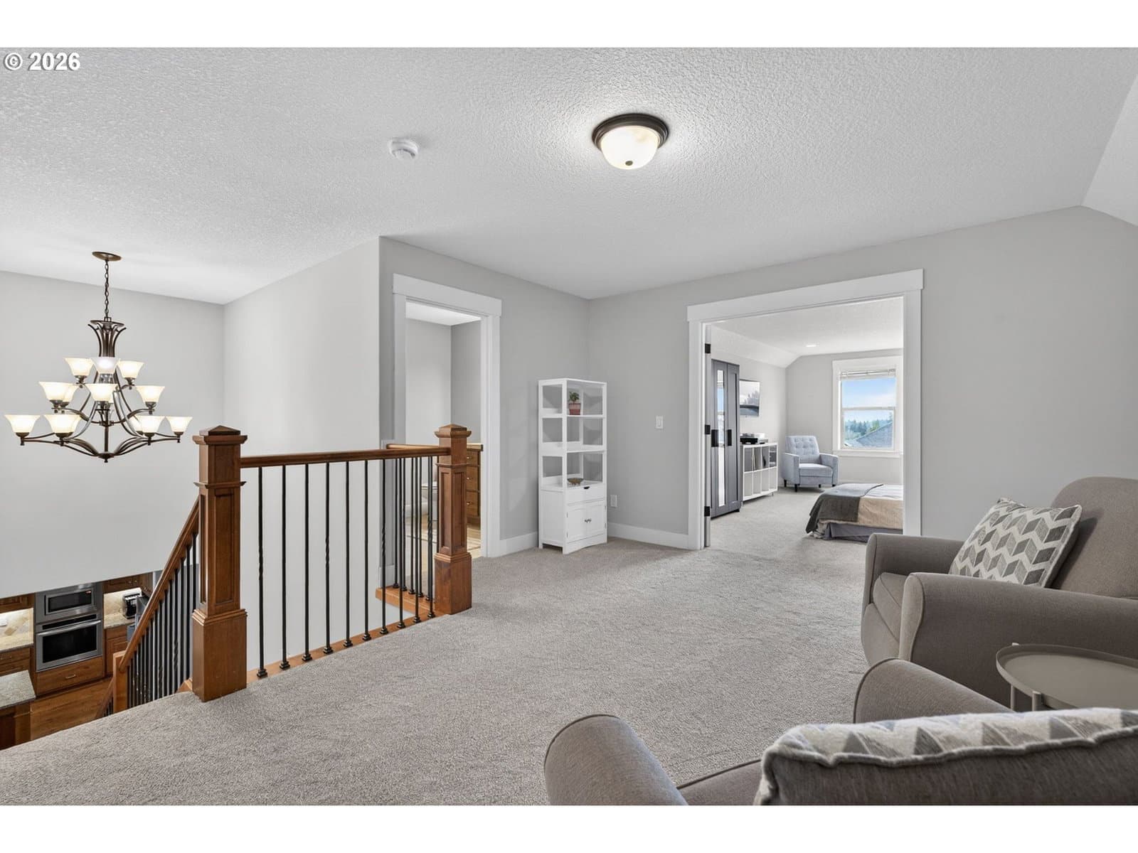 This thoughtfully designed home, tucked at the end of a quiet no-through street, is the perfect blend of style and functionality. With the Primary Suite and two additional bedrooms on the main floor, this is single level living with the bonus of a full suite on the upper level. As you enter, a dedicated office space is off the wide hallway leading to the great room, anchored by a stone floor-to-ceiling fireplace with gas insert. The kitchen is perfect for entertaining with its large island with seating, gas cooktop, butler's pantry and walk-in pantry. The dining area off the kitchen leads out to the private back yard, and the adjacent formal dining room (currently used as a reading room) features wainscoting and a view of the neighboring acreage. The main level Primary Suite looks out to the manicured back yard, and features two walk-in closets with custom closet systems, elegant light fixture that accents the tray ceiling with ambient lighting, en-suite bathroom with walk-in shower with dual shower heads and soaking tub. Two additional bedrooms, a full bath, and a dedicated mud room / laundry room with bench seating and coat hooks round out the main level. The upper level is a self-contained living space with a generous bedroom, loft sitting area, and full bath — a natural fit for dual living or a guest suite. A spacious three-car garage completes this exceptional home. The neighboring acreage provides added privacy and a serene backdrop, while shopping, dining, freeway access, and nearby medical campuses keep everyday conveniences within easy reach.