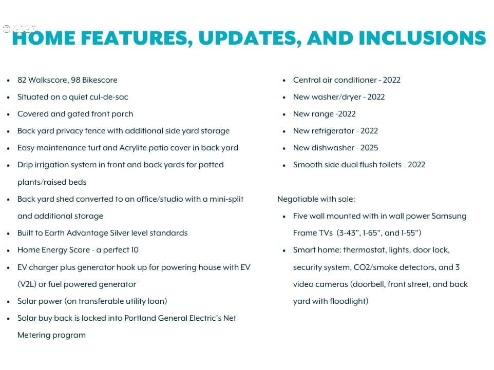 Conveniently located on a quiet street with no through traffic, this thoughtfully updated home offers the perfect balance of comfort and efficiency. With an 82 Walk Score and 98 Bike Score, you’re just blocks from neighborhood restaurants, shops, groceries, food carts, parks, and transit. This home is is equipped with newer appliances, central air conditioning, solar panels, an Electric Vehicle charger, and a generator hookup. The large primary suite features an attached bathroom with dual sinks, a tiled shower, and a walk-in closet. Enjoy privacy in your fully fenced back yard with an Acrylite patio awning, side yard storage, and drip irrigation for potted plants or raised beds, plus a detached office/studio with additional storage. Built to Earth Advantage Silver standards, this energy efficient home is the embodiment of easy city living! [Home Energy Score = 10. HES Report at https://rpt.greenbuildingregistry.com/hes/OR10055851]