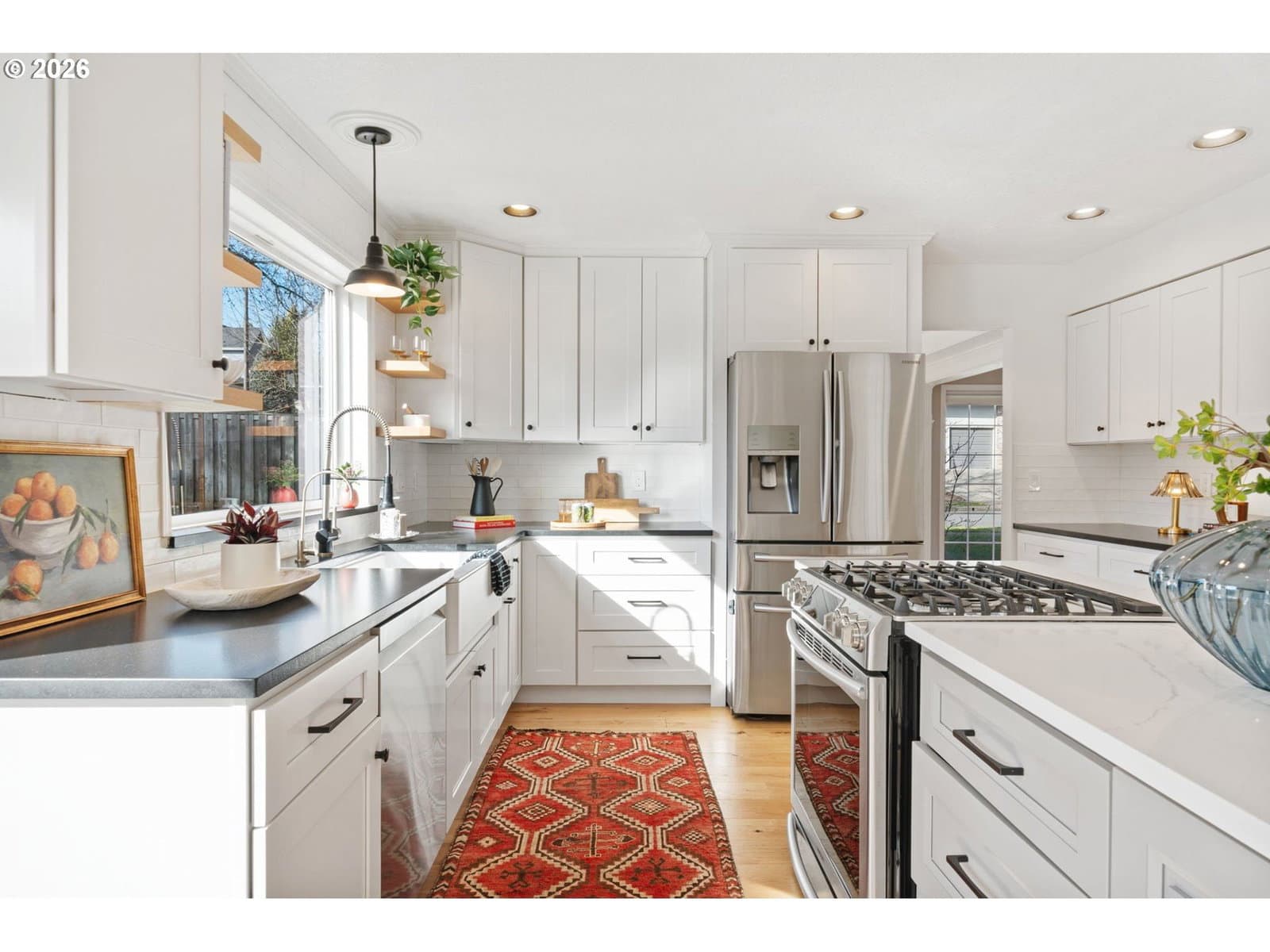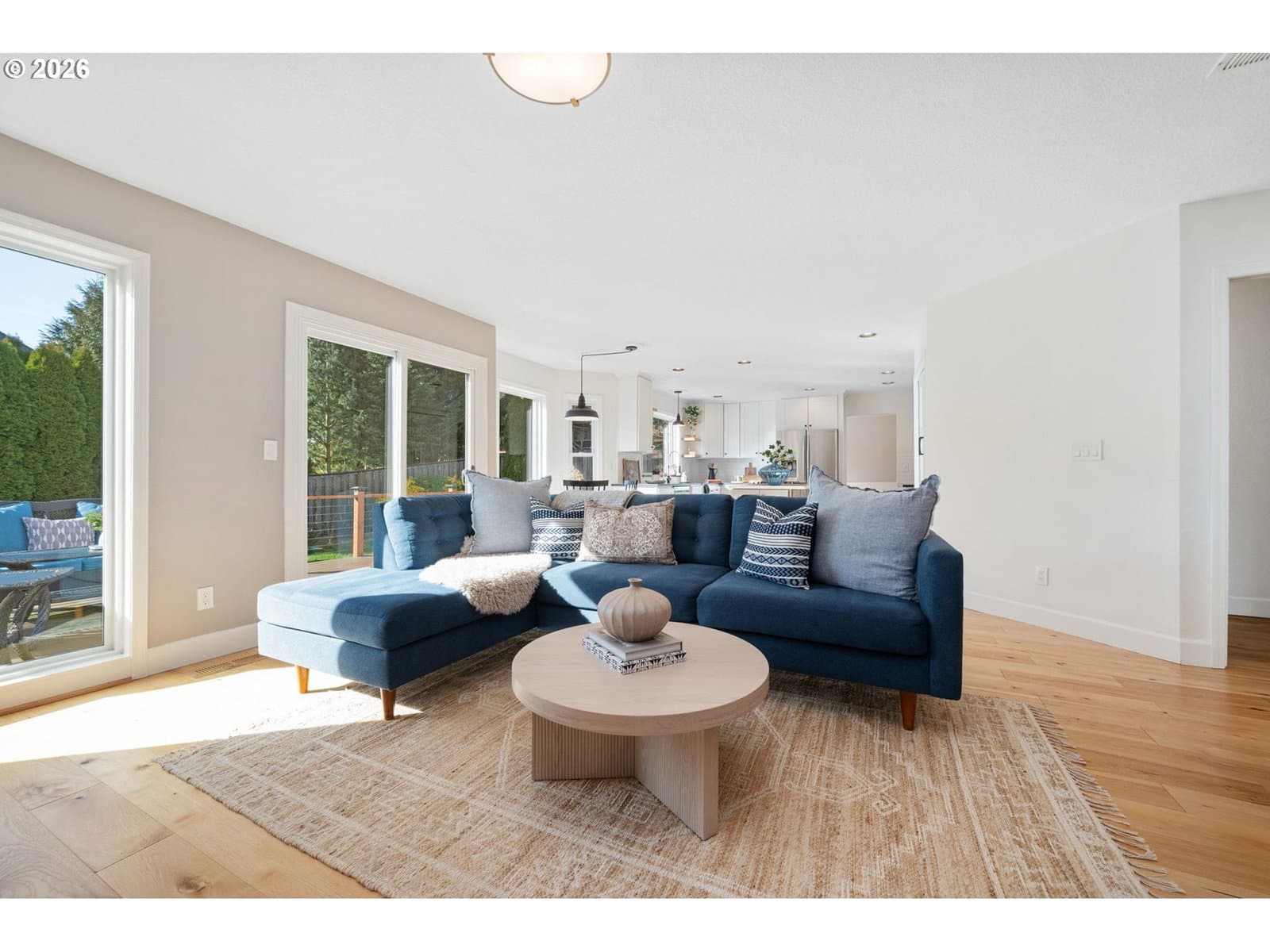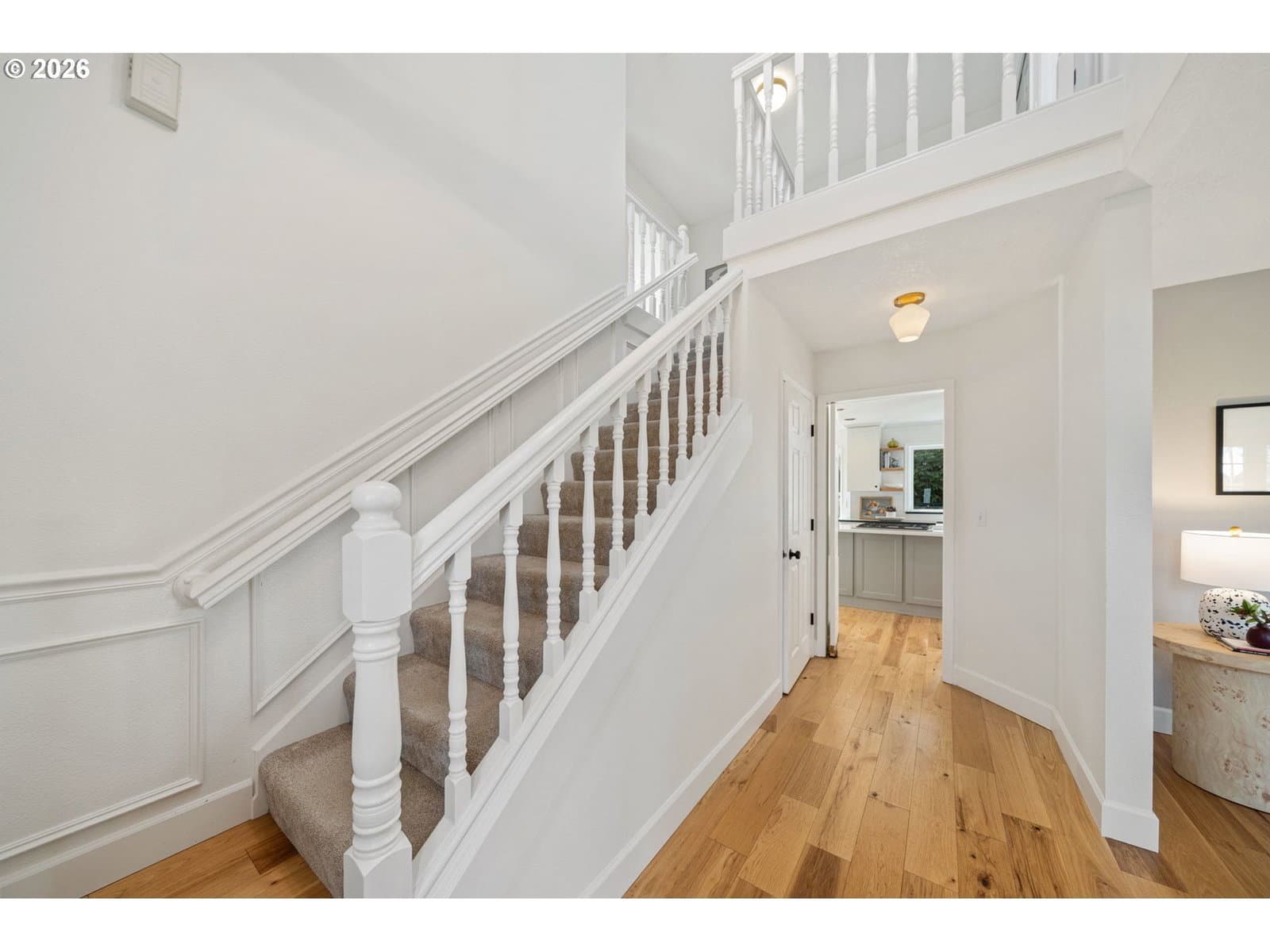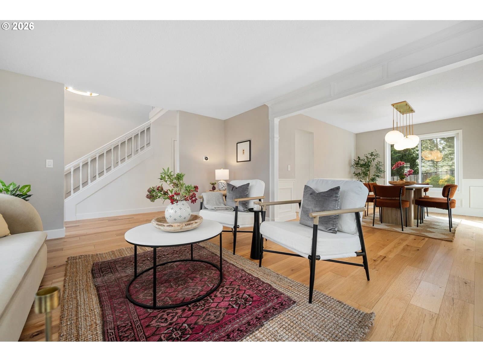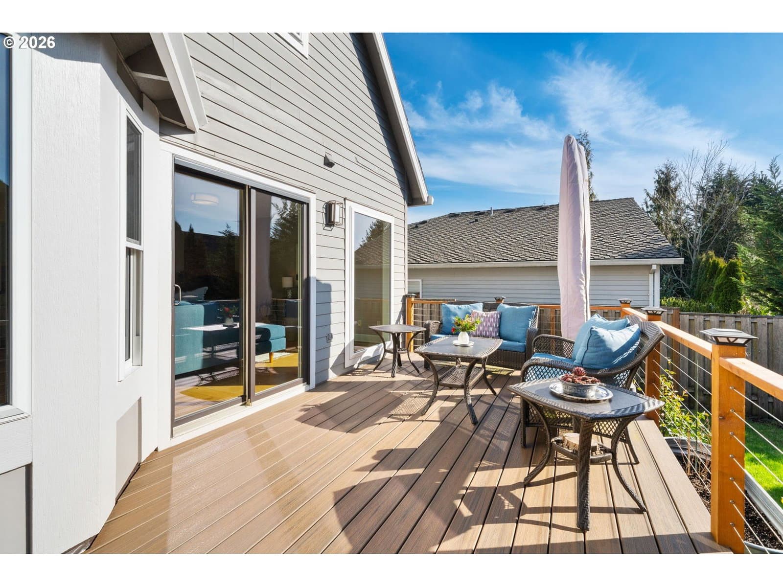 Located on a quiet cul-de-sac in West Linn’s Hidden Springs neighborhood, this well-maintained 4-bedroom, 2.5-bath home offers 2,389 square feet of comfortable living on a flat, fenced corner lot. Known for its established streets and convenient access to parks, pathways, and everyday amenities, Hidden Springs offers a peaceful residential setting with excellent connectivity, and is extremely close to top-rated neighborhood schools - both Trillium Creek Primary and Rosemont Ridge Middle Schools are under 0.3 miles away. The corner-lot placement provides added privacy and flexibility for outdoor use. The main level features a classic circular floor plan with formal living and dining rooms, flowing into the beautifully remodeled kitchen and family room. Completed in 2020, the kitchen showcases quartz countertops, bright shaker cabinetry with cooktop island, and updated appliances—creating a clean, timeless aesthetic. The family room is anchored by a cozy wood-burning stove with brick hearth and opens to a private backyard and deck, ideal for indoor-outdoor living. This space functions as the true gathering area of the home. Upstairs includes four bedrooms and two full bathrooms, with the primary suite thoughtfully separated for added privacy and offering a functional layout ready for future personalization. Major updates include a 50-year roof (2015), crawl space upgrades (2015), new windows, siding, and exterior paint (2017), wide-plank hardwood floors (2018), kitchen remodel and new furnace and A/C (2020), and deck improvements. (2024). Conveniently located near downtown West Linn and Lake Oswego, with easy access to major commuter routes. A well-cared-for home offering comfort today and opportunity to personalize over time.