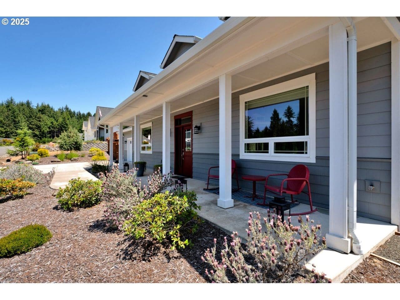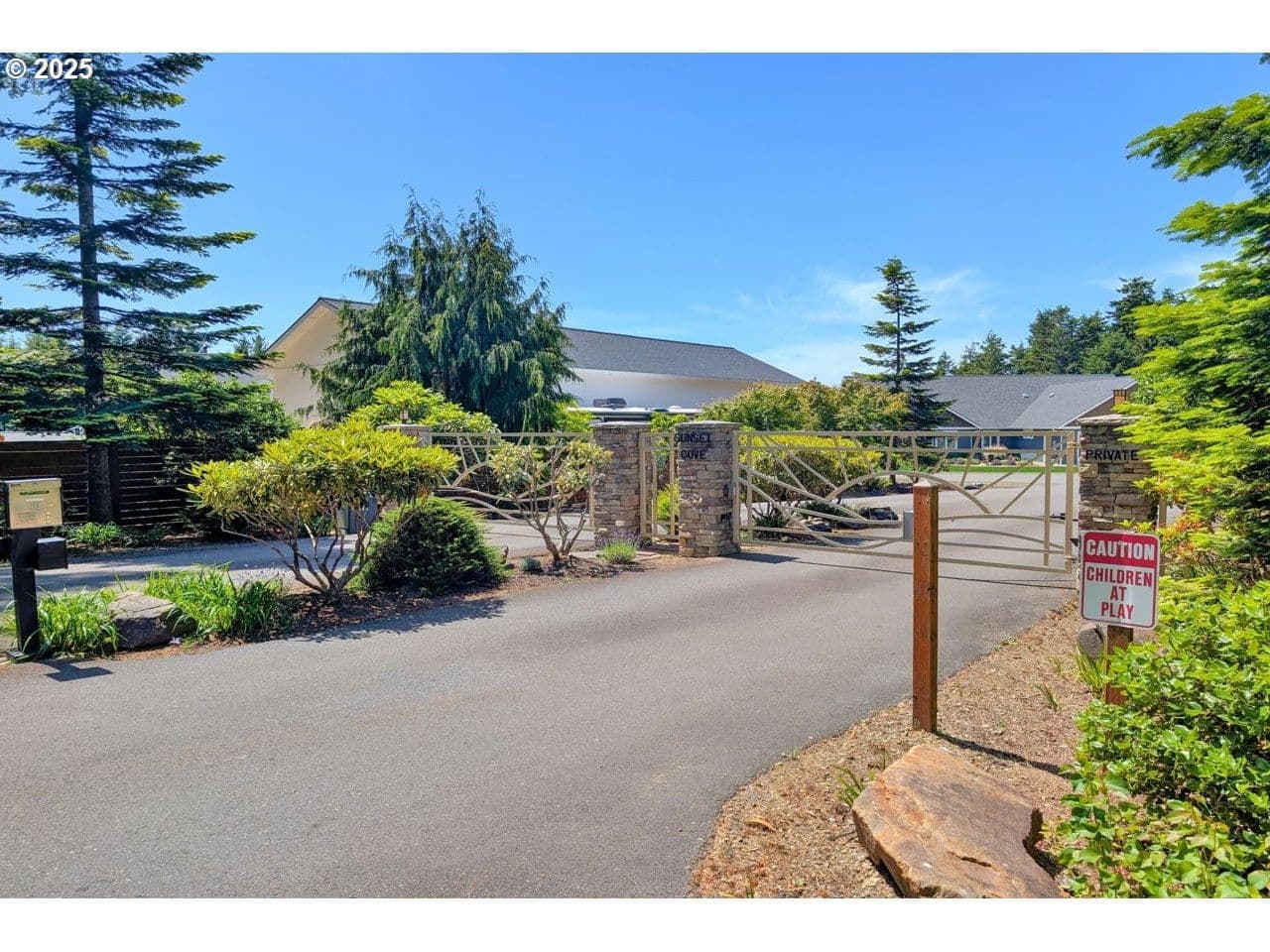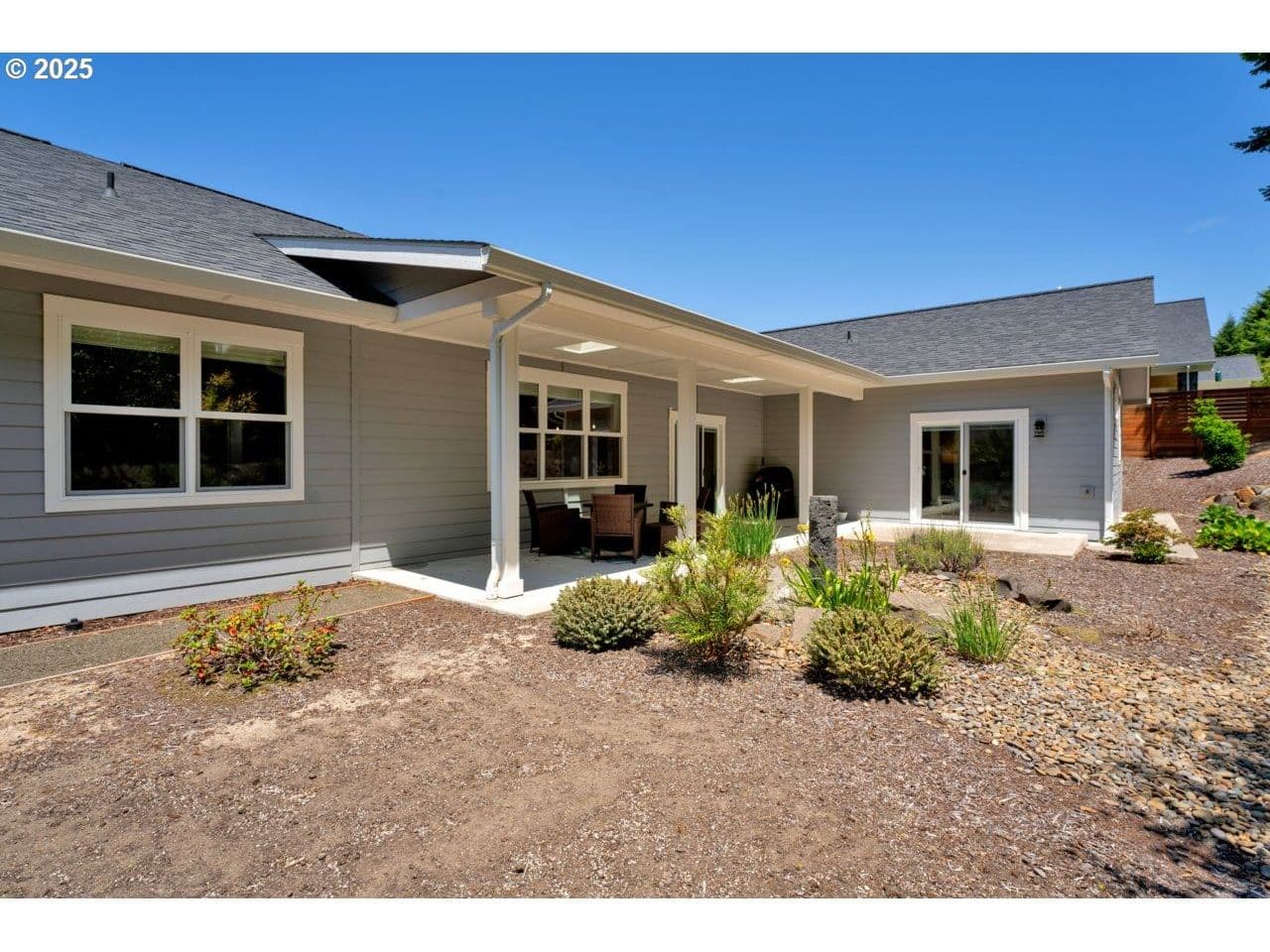 Like new home in the gated, private Woahink Lake neighborhood of Sunset Cove. Great views of the lake and a shared community dock give you endless opportunities to delight in one of Florence's most popular lakes, while only ten minutes from town. When you aren't at the lake, savor your half acre lot that includes Fuji apple trees, blueberry bushes and an array of quality landscaping. The privacy of the covered back patio will give you a space to enjoy all year long. Inside you'll find a fully furnished home that exudes a modern color scheme and consistent decor throughout. The open floor plan with vaulted ceilings and electric fireplace is the perfect setting for the end of a day on the lake or a cozy evening in on a rainy day. Spacious primary suite with patio access and roomy walk-in closet on one side of the house and two bedrooms and full bath on the opposite side. A kitchen made for cooking and entertaining with a sizable island that opens to the great room. Come & see why the lake areas of Florence are desired.