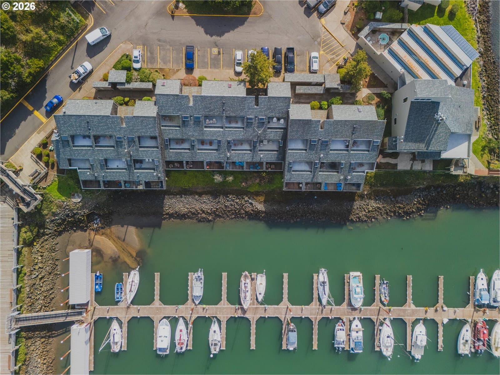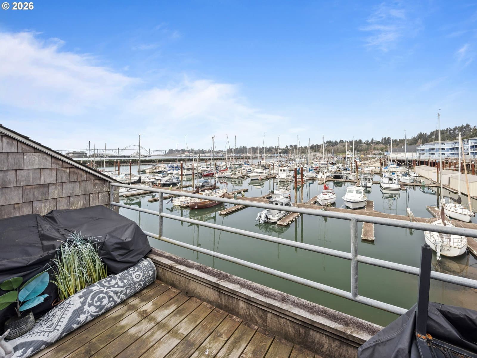 Enjoy easy coastal living in this updated bayfront condo at the Embarcadero in Newport, ideally located in the sought-after C Building. This single-level, ground-floor unit features newer stainless steel appliances, butcher block countertops, and an open layout capturing panoramic views of Yaquina Bay, the ocean, and the Yaquina Bay Bridge—often protected from coastal winds. The one bedroom, one bathroom condo includes washer and dryer hookups, and HOA dues cover utilities plus access to amenities like a saltwater pool, hot tubs, fitness room, and crabbing docks, making it a perfect full-time residence, getaway, or investment opportunity.