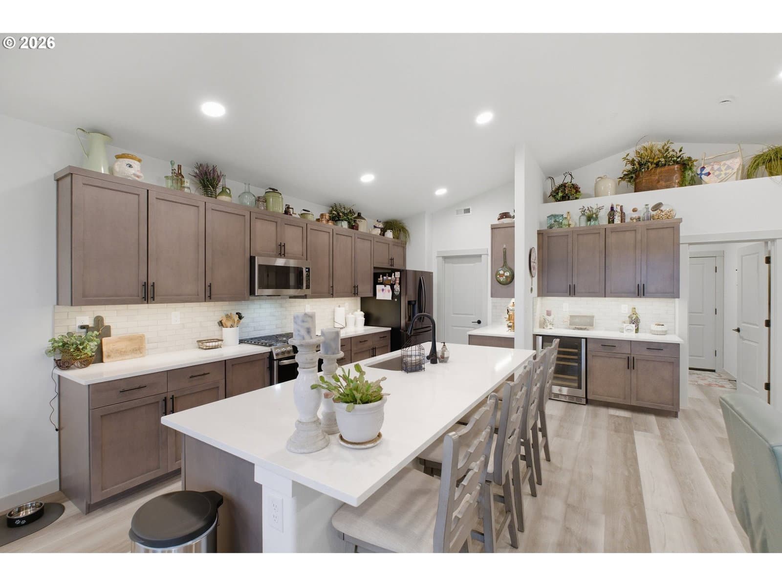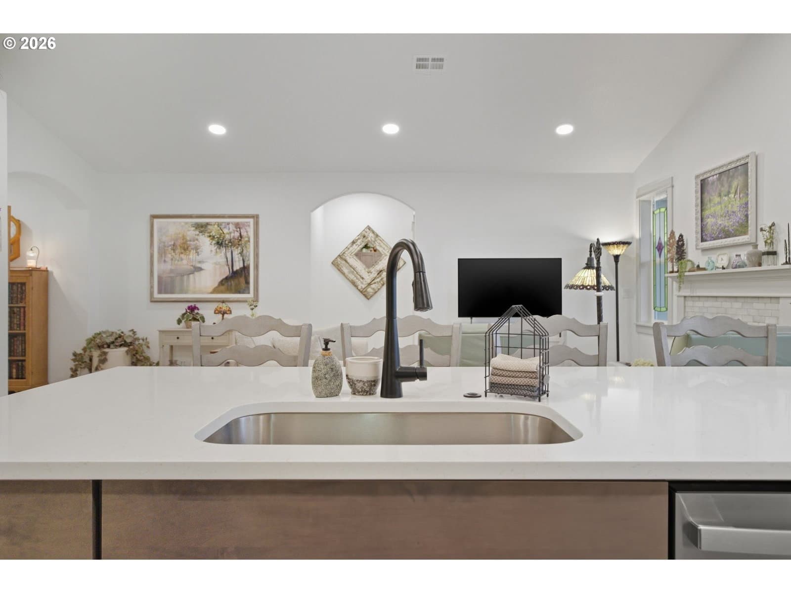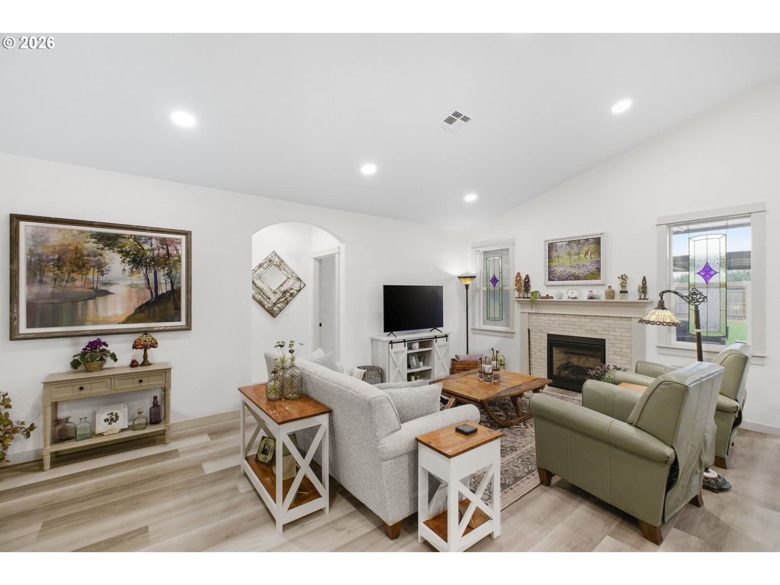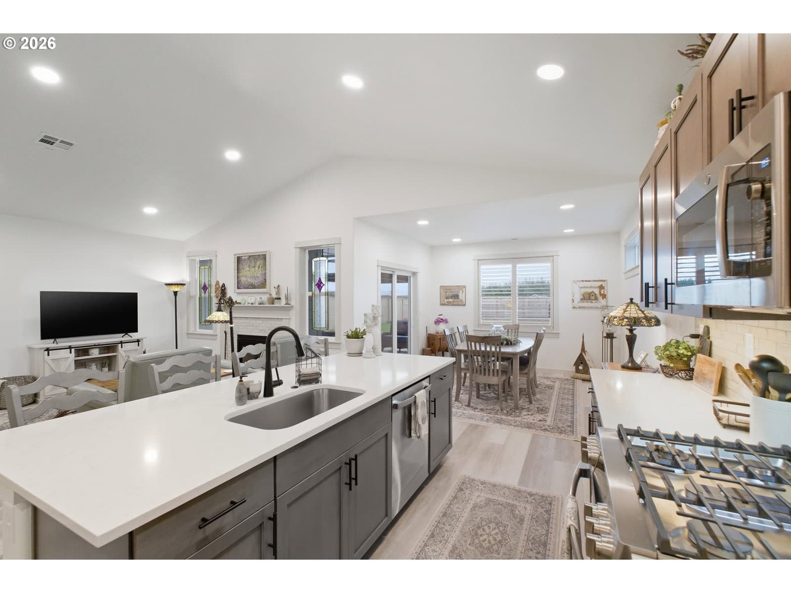Welcome to this beautifully built 2024 single-story home offering 3 bedrooms and 2 bathrooms, perfectly designed for modern living and effortless entertaining. Enjoy the ease of open-concept living with durable and stylish LVP flooring throughout and a warm, inviting gas fireplace anchoring the main living space.The kitchen features sleek quartz countertops, ample cabinetry with pull out drawers, and a spacious pantry, making both everyday meals and hosting a breeze. Large windows frame gorgeous views and fill the home with natural light, creating a bright and welcoming atmosphere.Step outside to a covered patio overlooking a large, flat backyard—ideal for play, pets, gardening, or future outdoor projects. A charming water fountain feature adds a peaceful touch, perfect for relaxing evenings and morning coffee with a view.With modern finishes, thoughtful layout, and a nearly brand-new build, this home offers comfort, style, and space—inside and out. Truly move-in ready and waiting for you to make it your own.