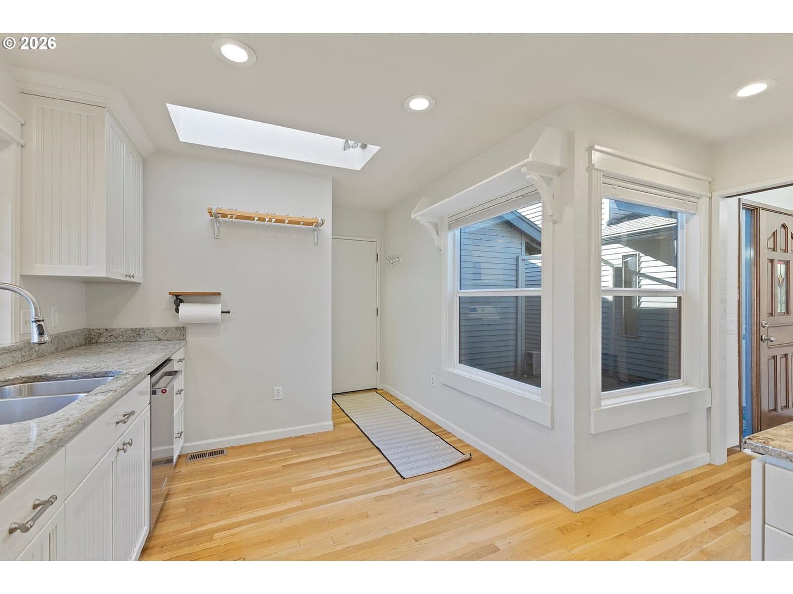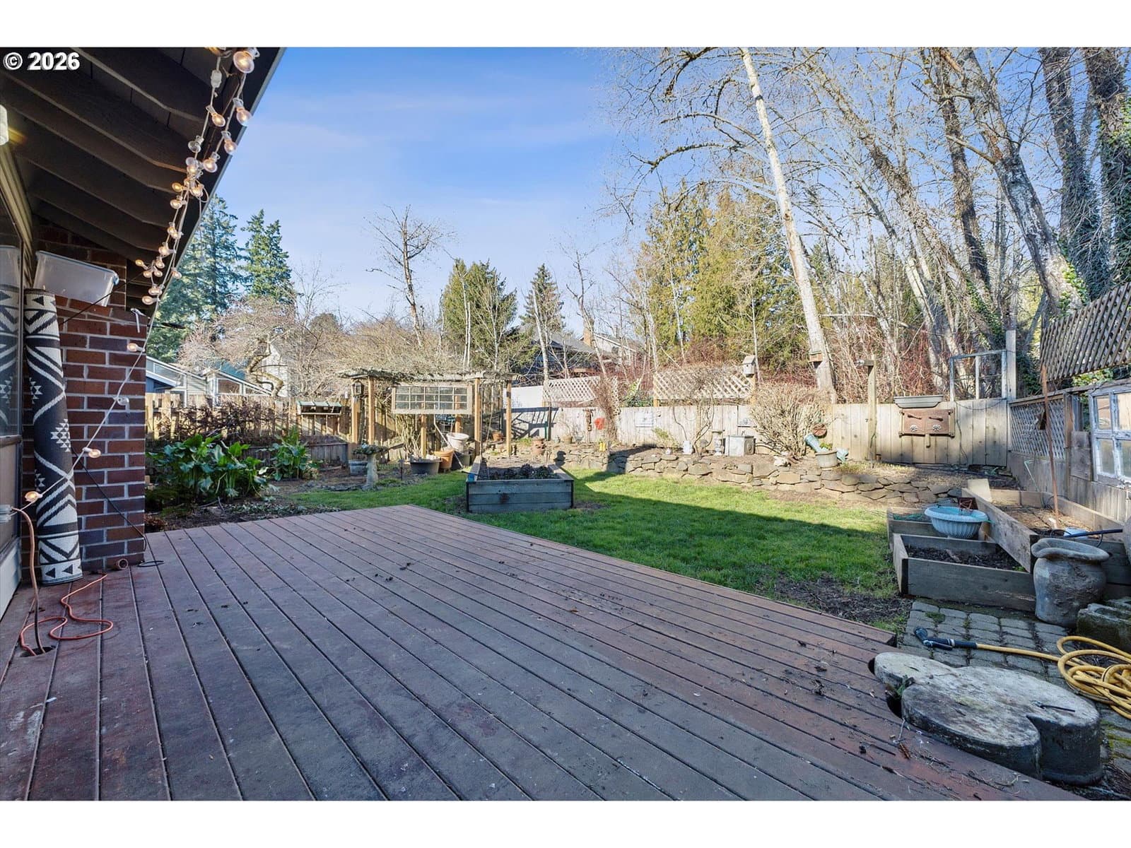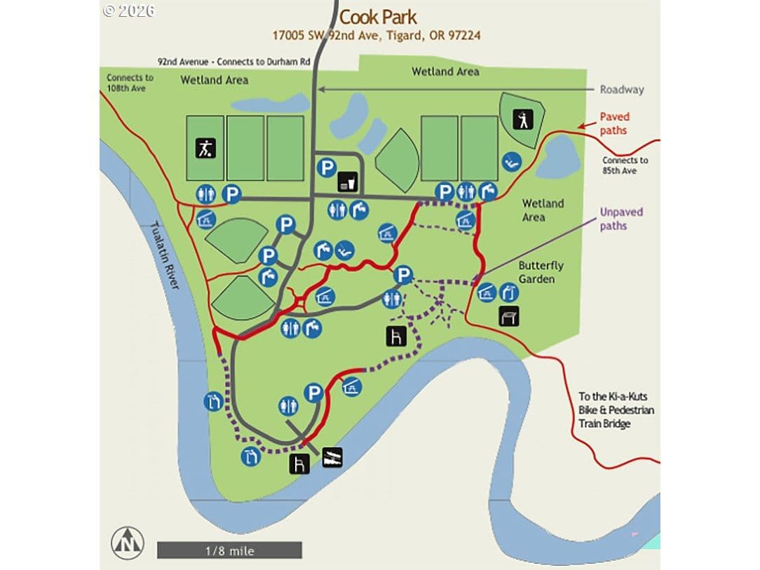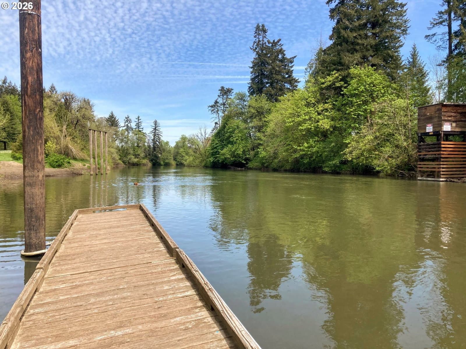 My favorite location in Tigard! Trail to Cook Park, and Tualatin River is right across the street! Cook Park is amazing, 79 acres of trails, boat launch, ball fields, playgrounds, even a trail that goes across river into Tualatin. See video about location. Plus you can walk to school, cafes, Trader Joes, shops and restaurants! House is remodeled with gorgeous kitchen with granite, stainless appliances and gas range, skylight, and hardwood floors! The living room has vaulted ceiling and skylight with fireplace and skylight, dining room has hardwood floor and slider to private backyard with big deck, raised beds and greenspace on side and back plus little creek. Bathrooms are remodeled. This is a wonderful place to live, very quiet and private yet close to everything!!