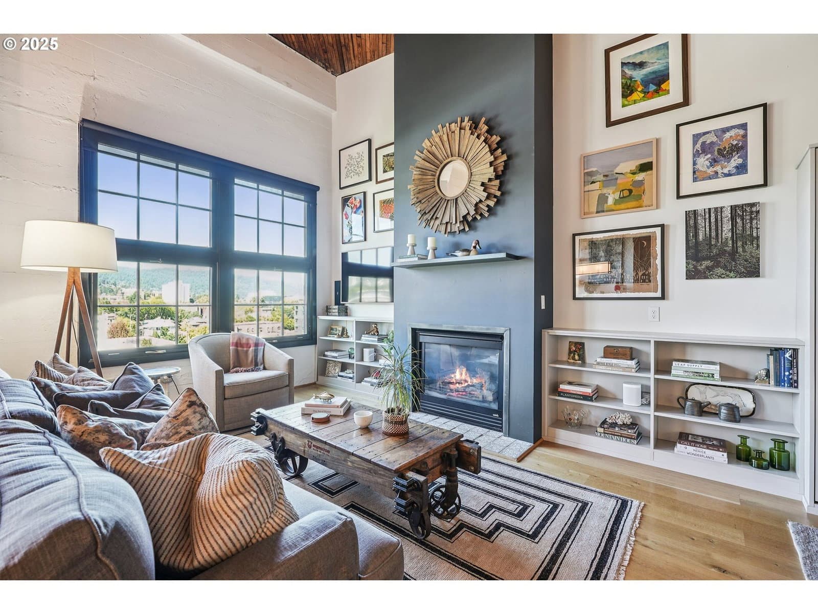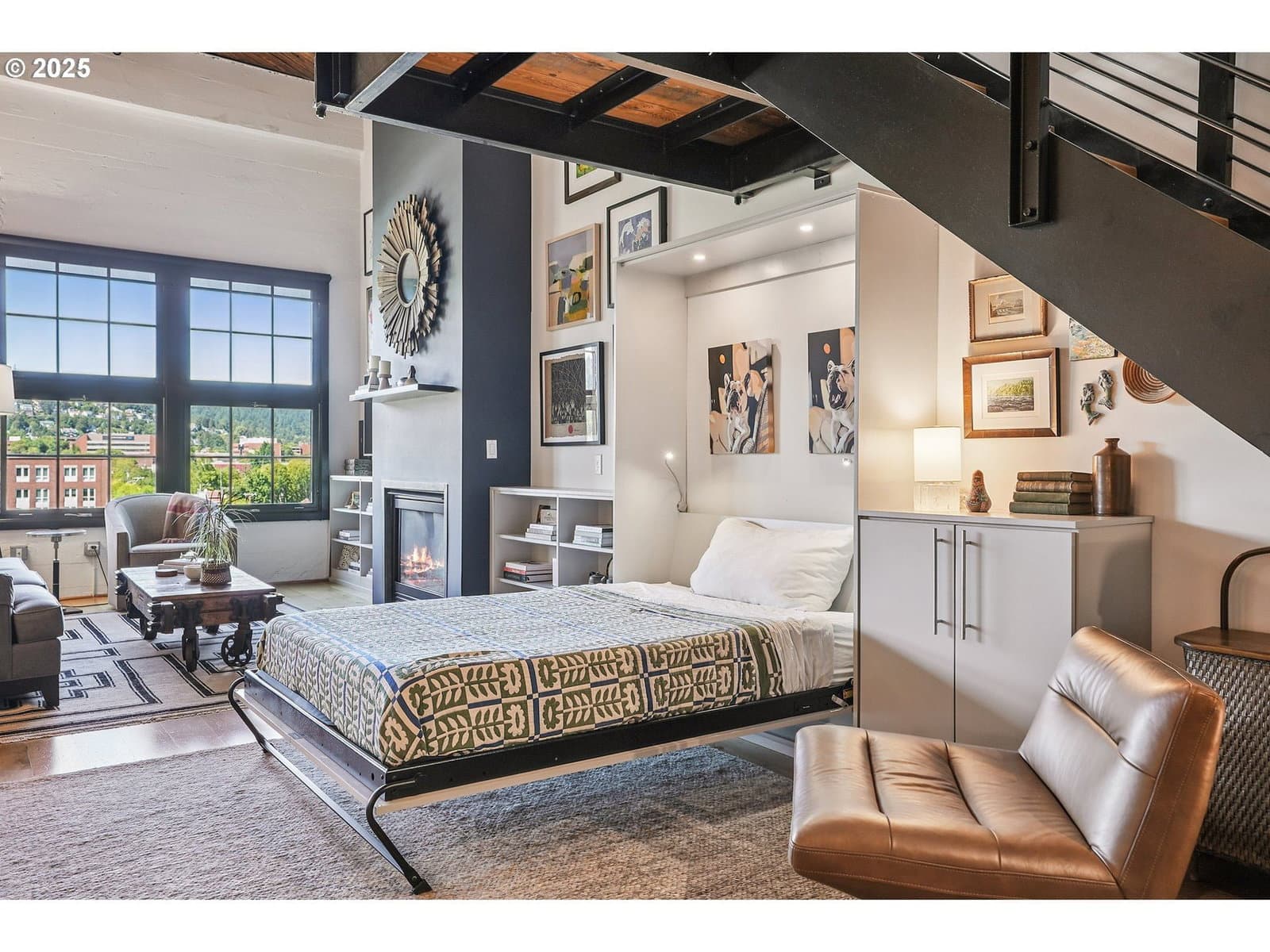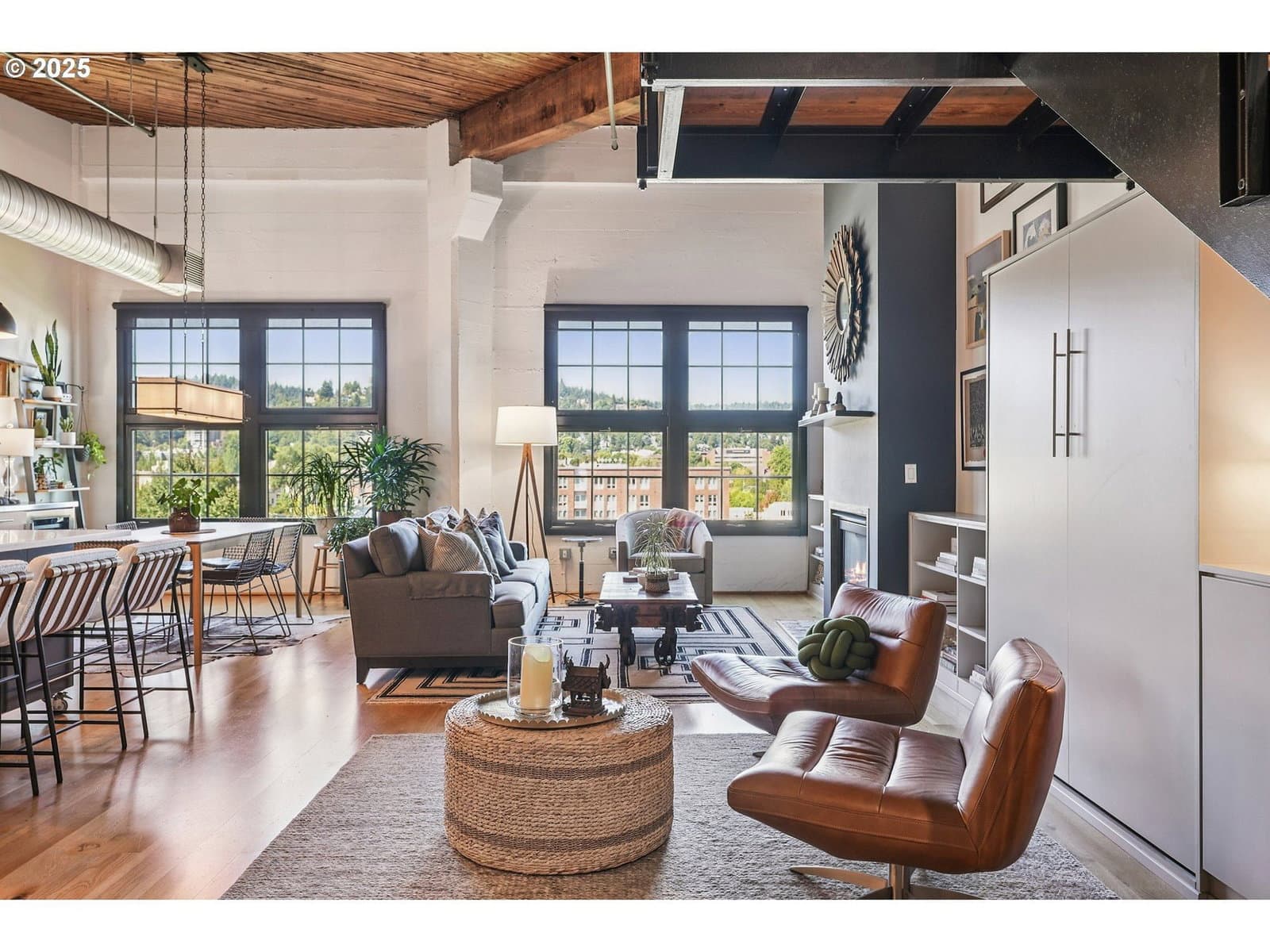 This authentic industrial loft penthouse features soaring ceilings, wood floors, and huge windows that flood the space with natural light. New separately zoned heating and air conditioning units for each level ensure year round comfort. The open-concept main floor is perfect for entertaining, featuring a beautifully updated kitchen with quartz countertops, a gas range with a vented hood, and a spacious kitchen island with seating. A cozy gas fireplace anchors the living area, while a third sleeping area with a custom wall bed and a full bathroom provides flexibility and convenience. Upstairs, the wood floors continue into the private quarters, which include two bedrooms, a large bathroom with a double vanity, a full laundry room, and a spacious walk-in closet. Enjoy expansive views of the neighborhood and West Hills, as well as stunning sunsets and the changing colors of the seasons from the large terrace, primary bedroom, and the main level. The building provides a beautifully landscaped courtyard and a handsome lobby with exposed old-growth beams. Tandem parking for 2 cars and a storage unit are included.
