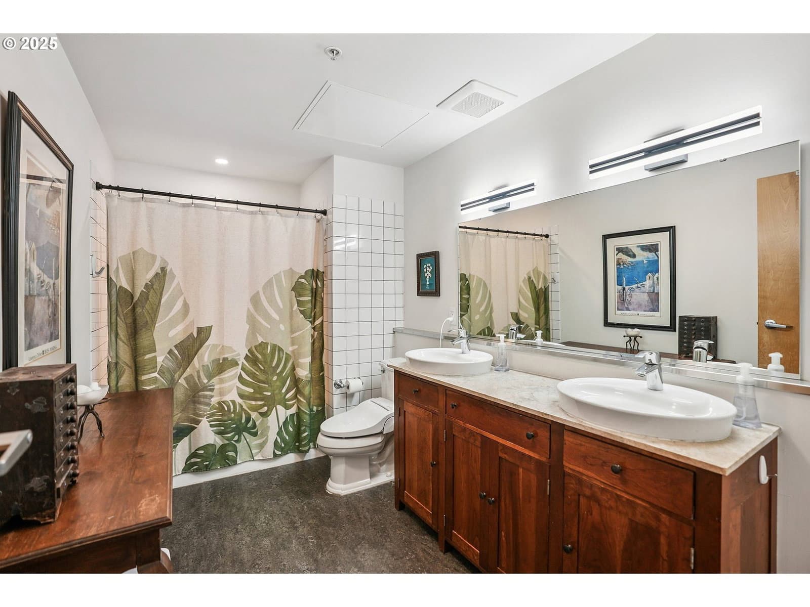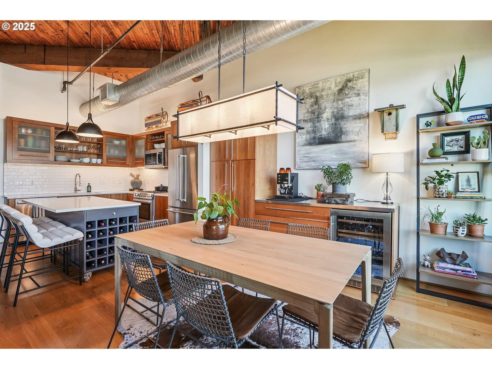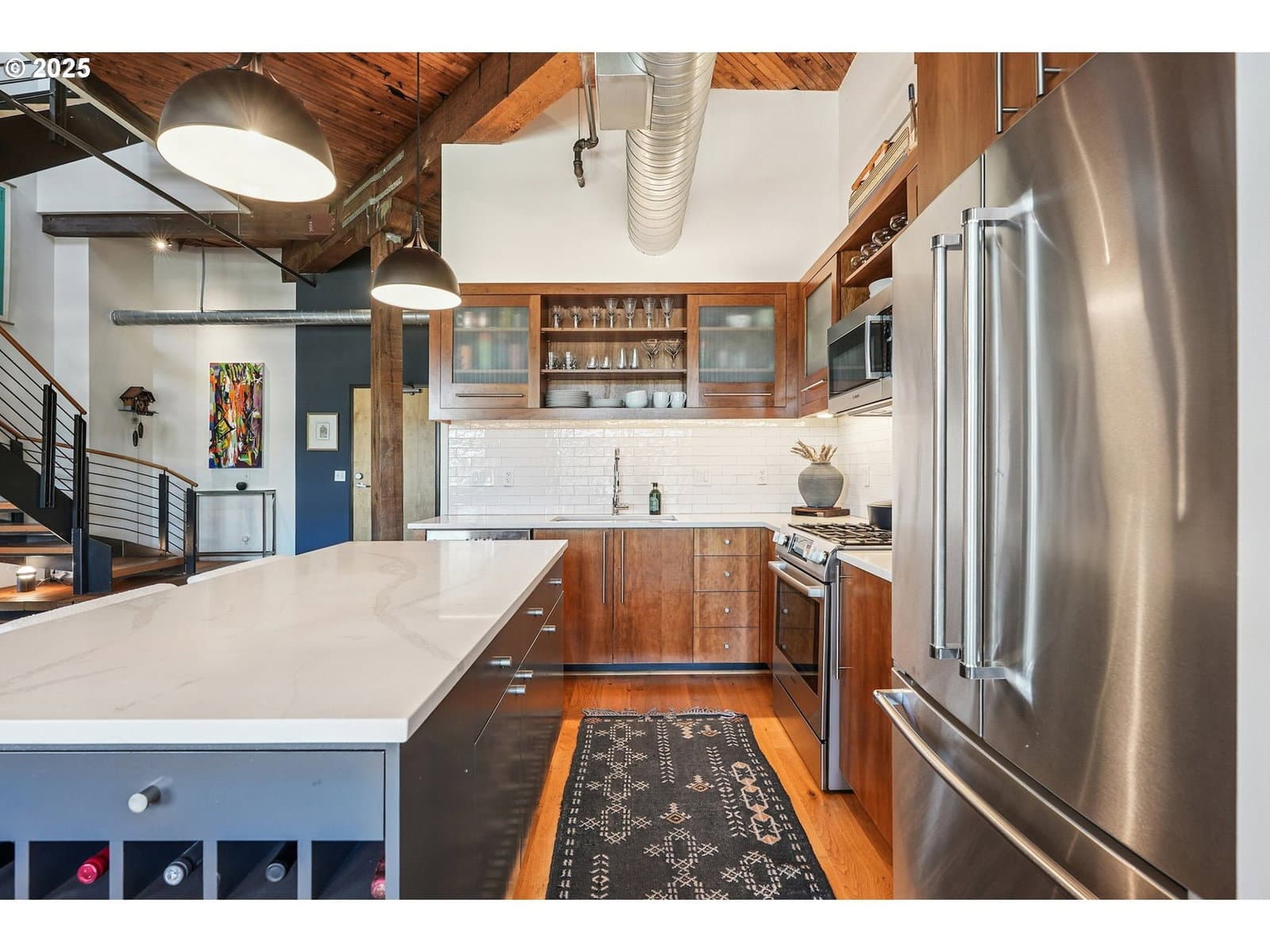 This authentic industrial loft penthouse features soaring ceilings, wood floors, and huge windows that flood the space with natural light. New separately zoned heating and air conditioning units for each level ensure year round comfort. The open-concept main floor is perfect for entertaining, featuring a beautifully updated kitchen with quartz countertops, a gas range with a vented hood, and a spacious kitchen island with seating. A cozy gas fireplace anchors the living area, while a third sleeping area with a custom wall bed and a full bathroom provides flexibility and convenience. Upstairs, the wood floors continue into the private quarters, which include two bedrooms, a large bathroom with a double vanity, a full laundry room, and a spacious walk-in closet. Enjoy expansive views of the neighborhood and West Hills, as well as stunning sunsets and the changing colors of the seasons from the large terrace, primary bedroom, and the main level. The building provides a beautifully landscaped courtyard and a handsome lobby with exposed old-growth beams. Tandem parking for 2 cars and a storage unit are included.