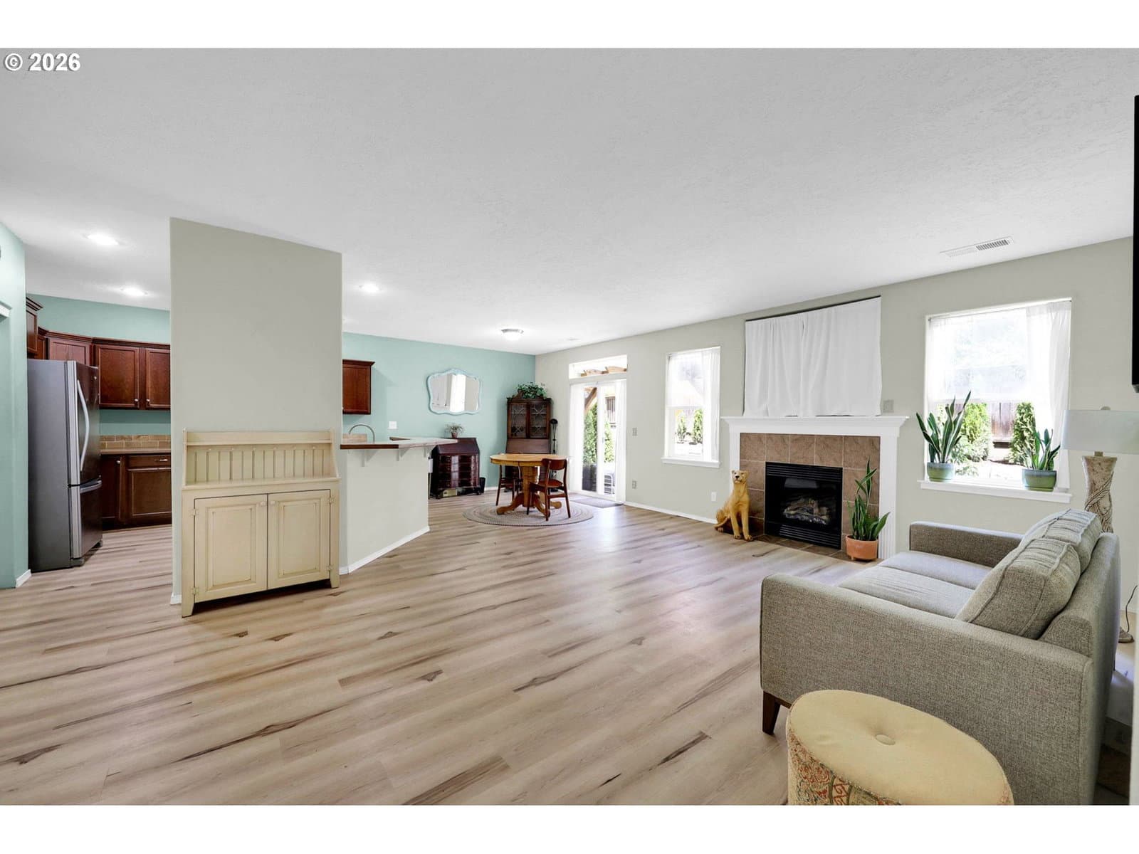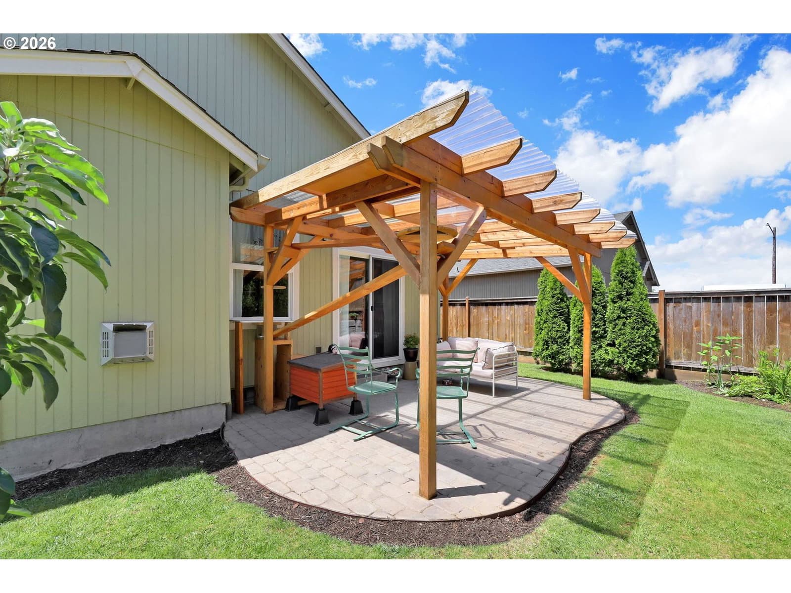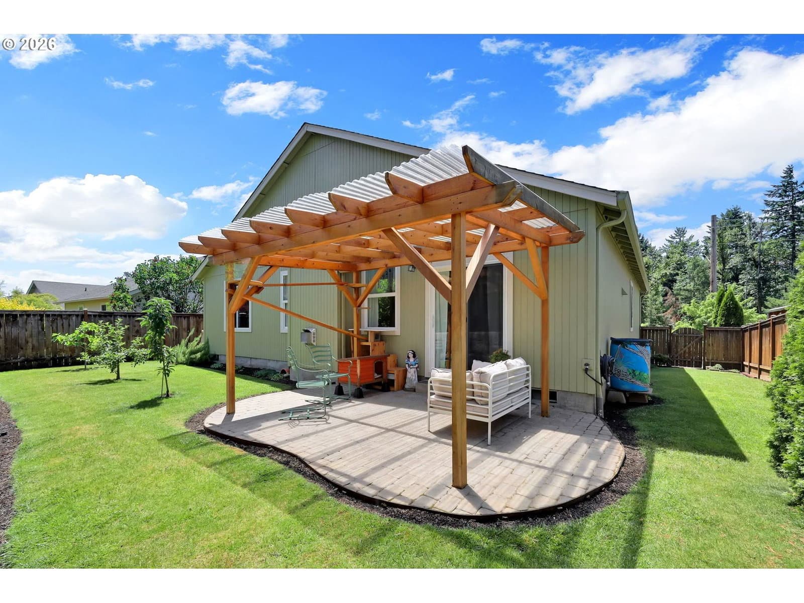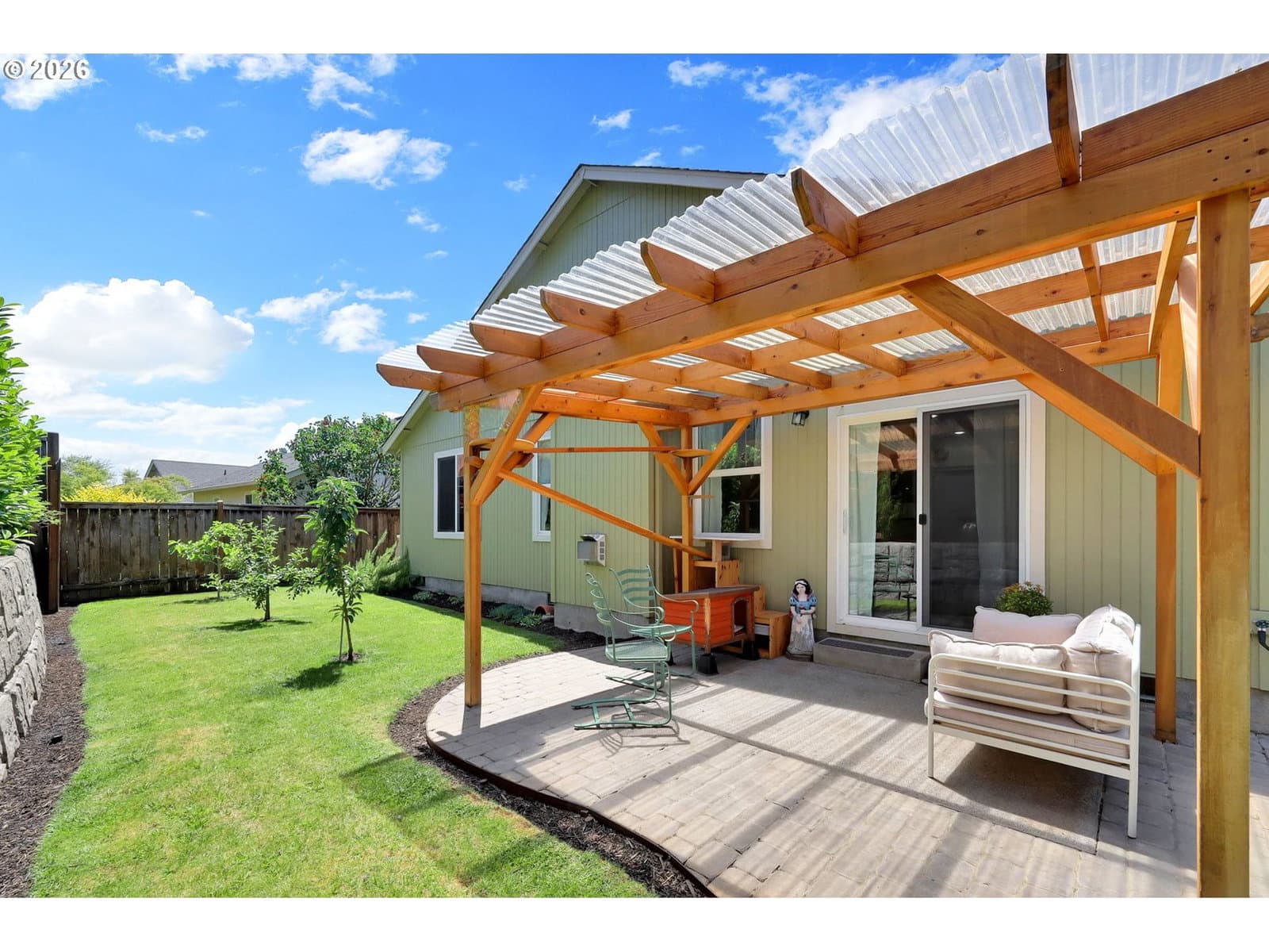 Very well cared for single level home3 in newer development.Easy care yard w/fruit trees and privacy. Great room lay our with great separation of bedrooms. Laminate flooring through out, open kitchen with w/ 5 burner gas stove, pantry and lots of counter space. The primary suite has walk in closet and walk in shower with double sinks vanity. Heat pump has been regularly services, newer gas water heater, finished two car garage with hi ceilings for maximum storage. Low maintenance yard, leaf guards on all gutters, covered patio with strategic plantings for privacy and tool shed. Pride of ownership with attention to detail and maintenance