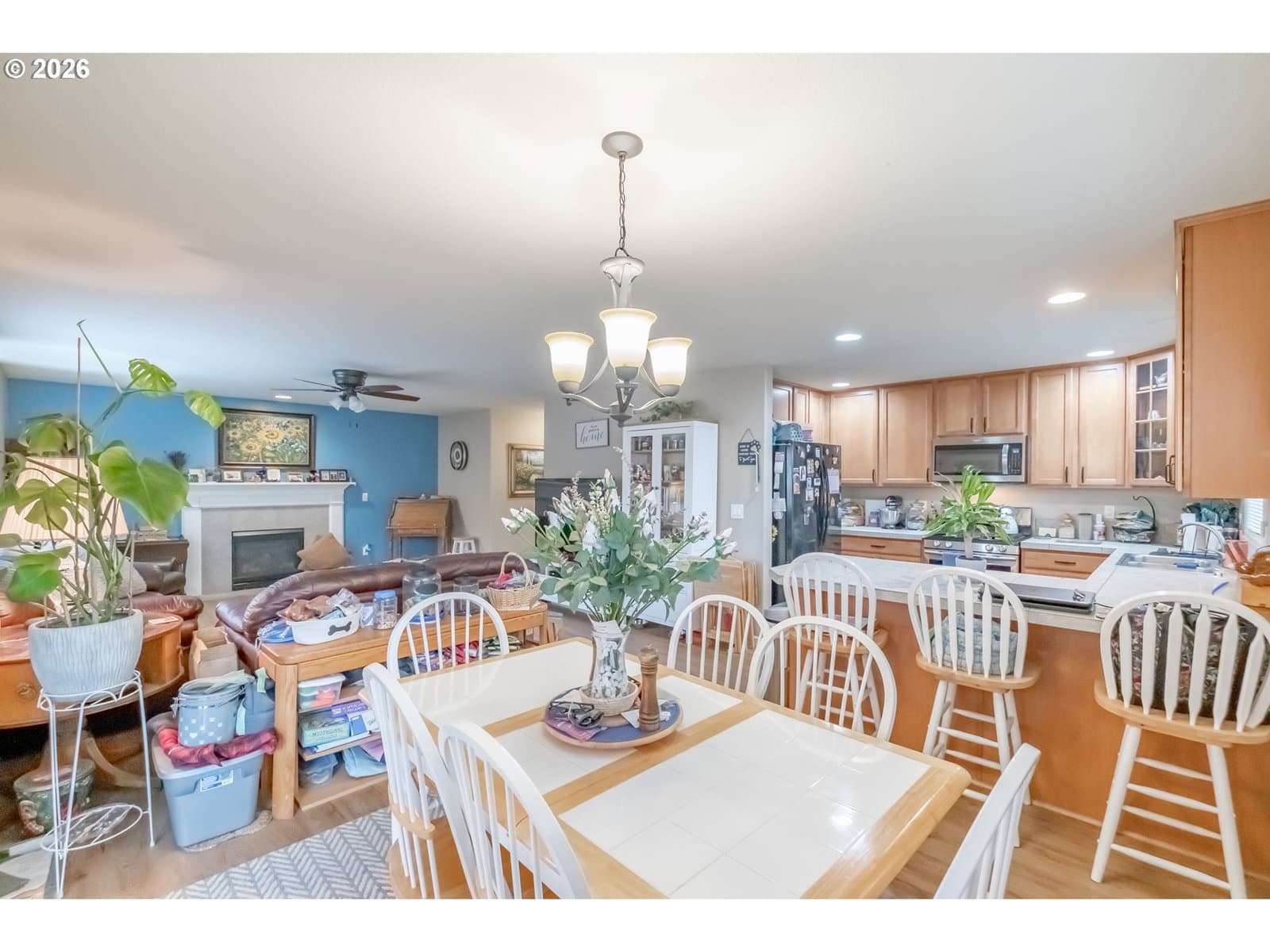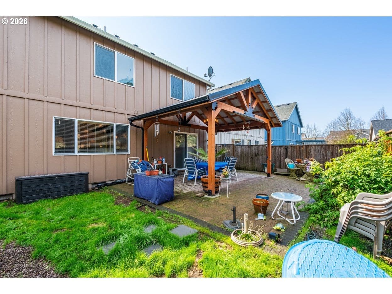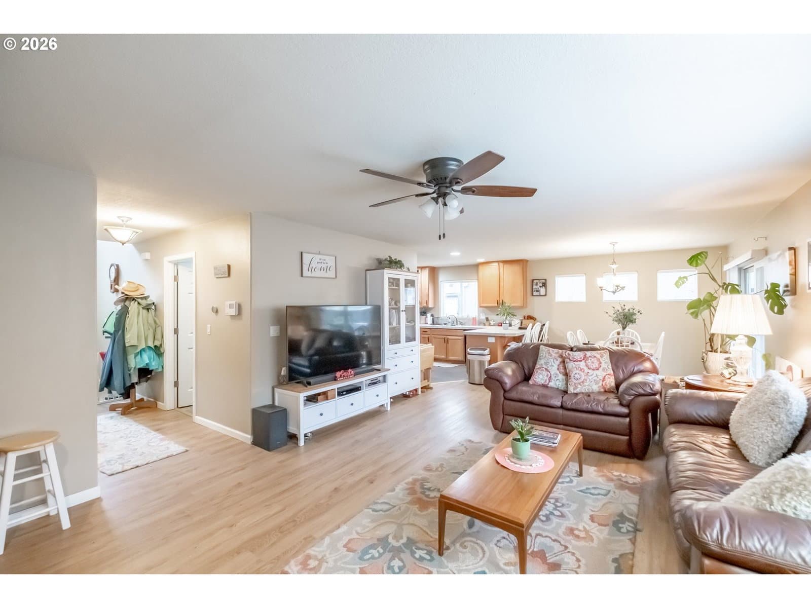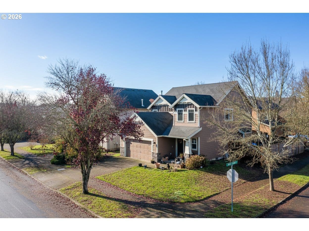 Set on a corner lot across from the neighborhood park, this charming home features a bright, open layout designed for easy living. The kitchen offers a convenient breakfast bar and flows into the inviting living room with a cozy gas fireplace. A slider from the dining area leads to the fully fenced backyard with a covered patio, perfect for year-round outdoor enjoyment. The primary suite includes a trayed ceiling, ceiling fan, dual vanities, and a spacious walk-in closet. Two additional bedrooms share a Jack-and-Jill bathroom for added convenience. With quick access to I-5 and a prime location within the Bridle Springs community, this home offers comfort, convenience, and great neighborhood appeal.