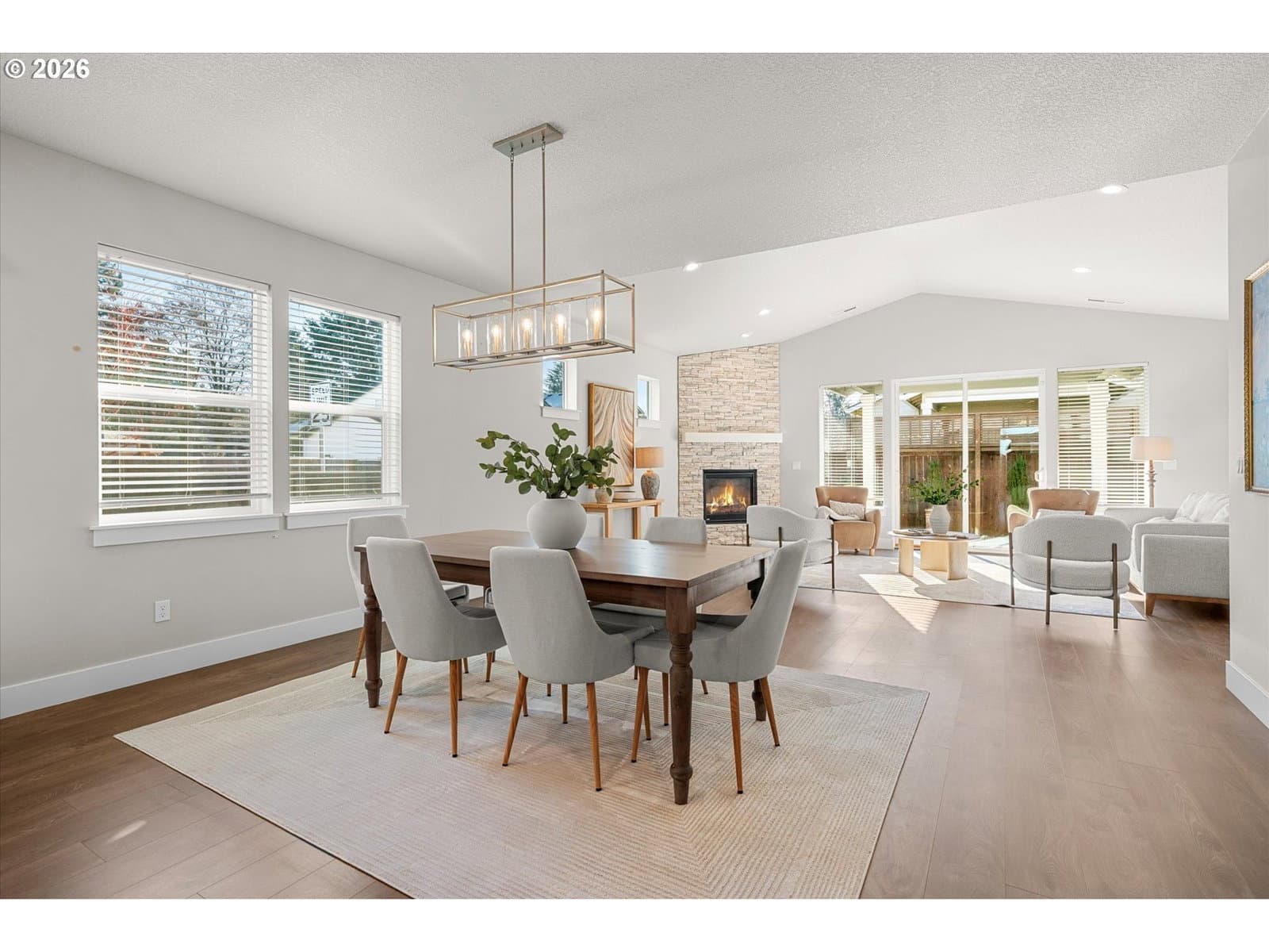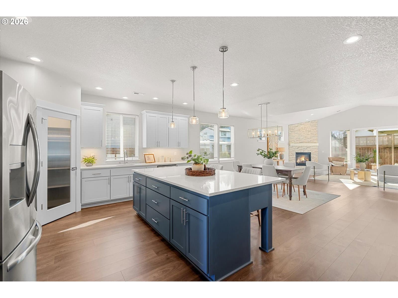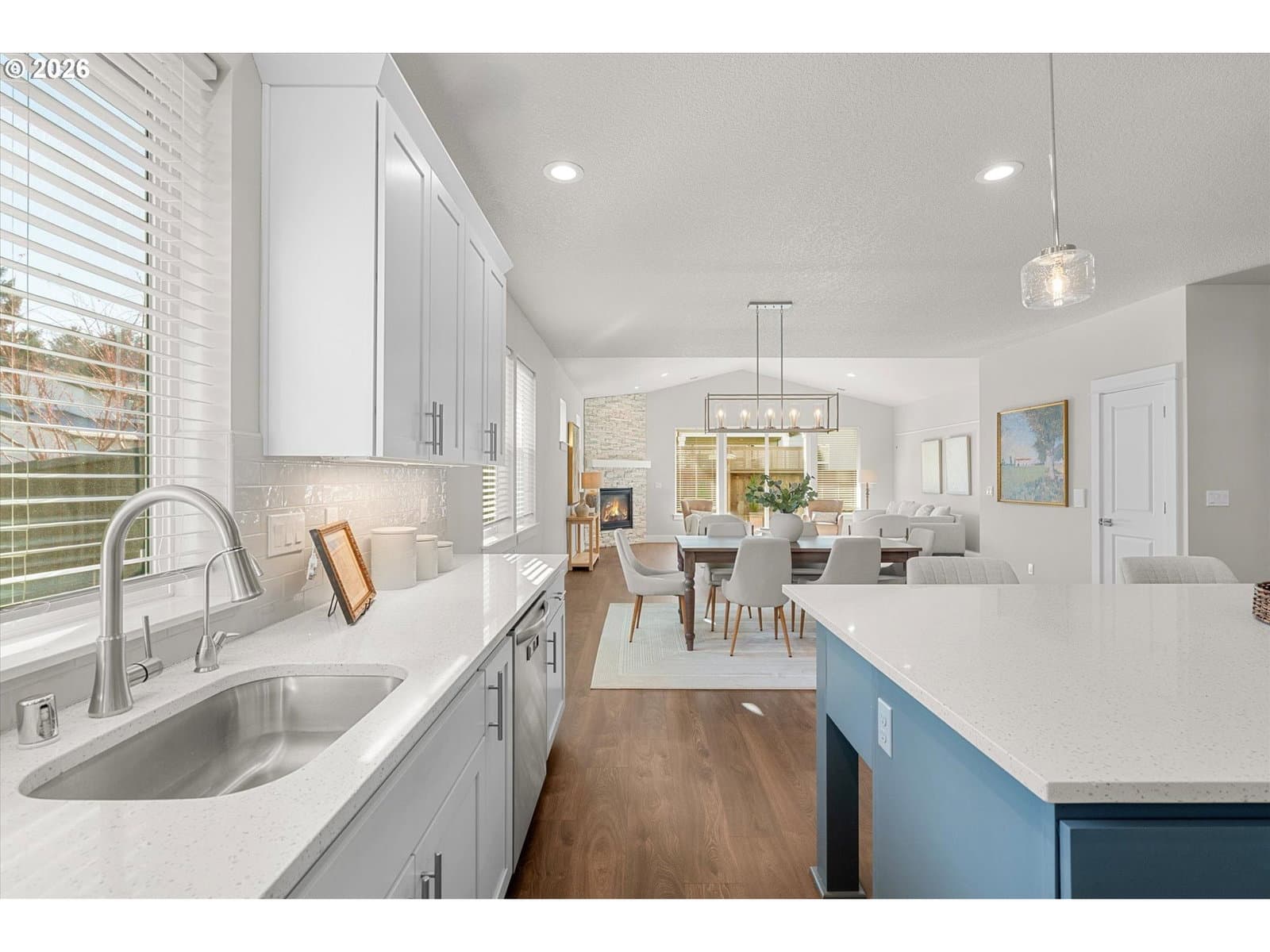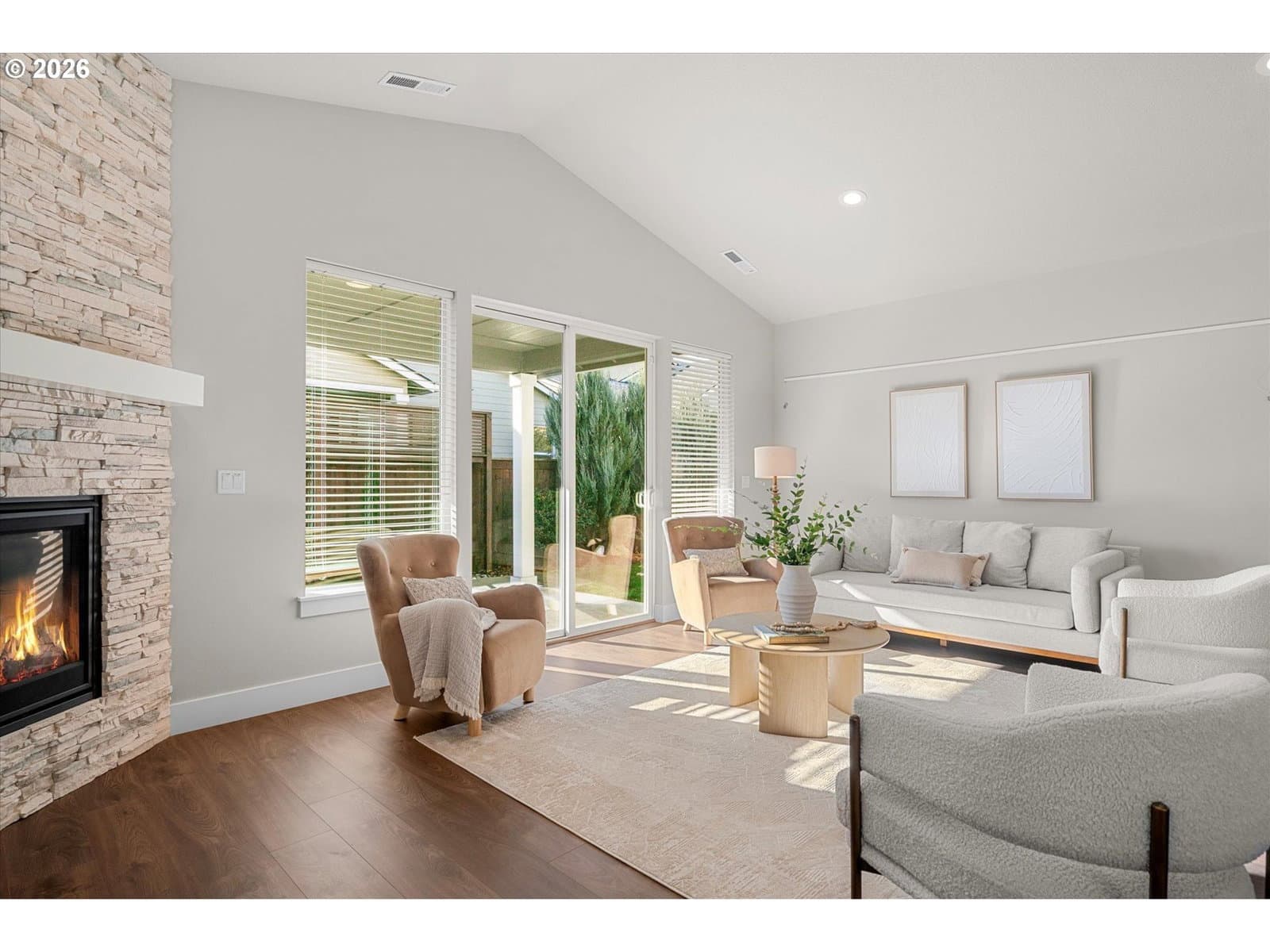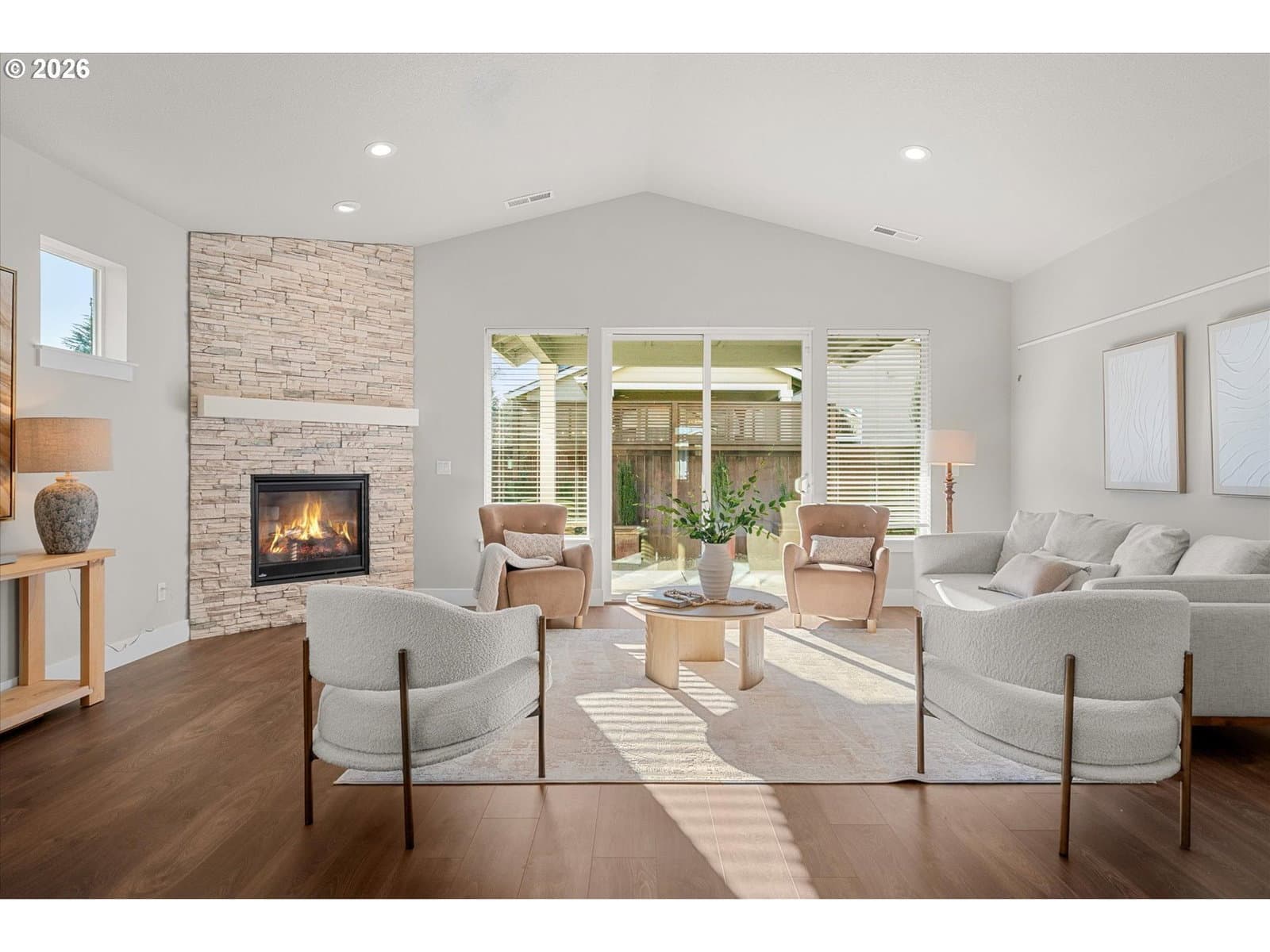 Built in 2020 and situated on a desirable corner lot, this former model home showcases premium upgrades and thoughtful design throughout. A welcoming open-concept layout features high ceilings, durable laminate flooring, and a striking stack-stone fireplace that anchors the main living space. The kitchen is designed to impress with quartz countertops, an oversized 8-foot island, soft close cabinets, ss appliances, generous pantry storage, and abundant workspace—ideal for everyday living and entertaining alike. Additional upgrades include central vacuum, whole-home water softener, jacuzzi walk in ADA shower, and a tankless hot water heater for efficiency and comfort. Enjoy a covered patio year-round with a manicured and fully fenced yard offering privacy and low-maintenance enjoyment, while the 2-car garage provides ample parking and storage. This home blends modern style, upgraded features, and a prime location—truly move-in ready with no detail overlooked.