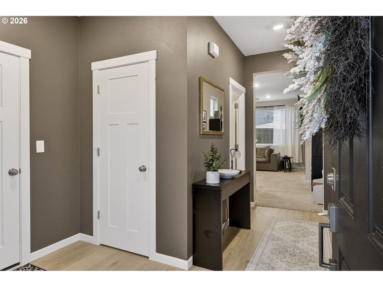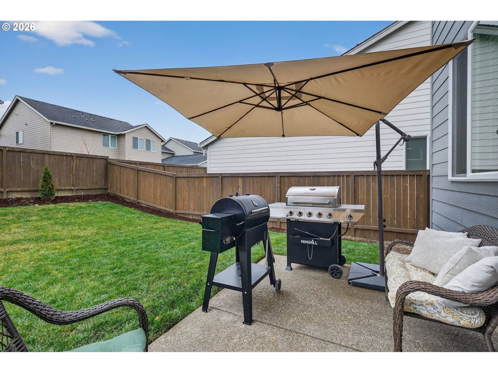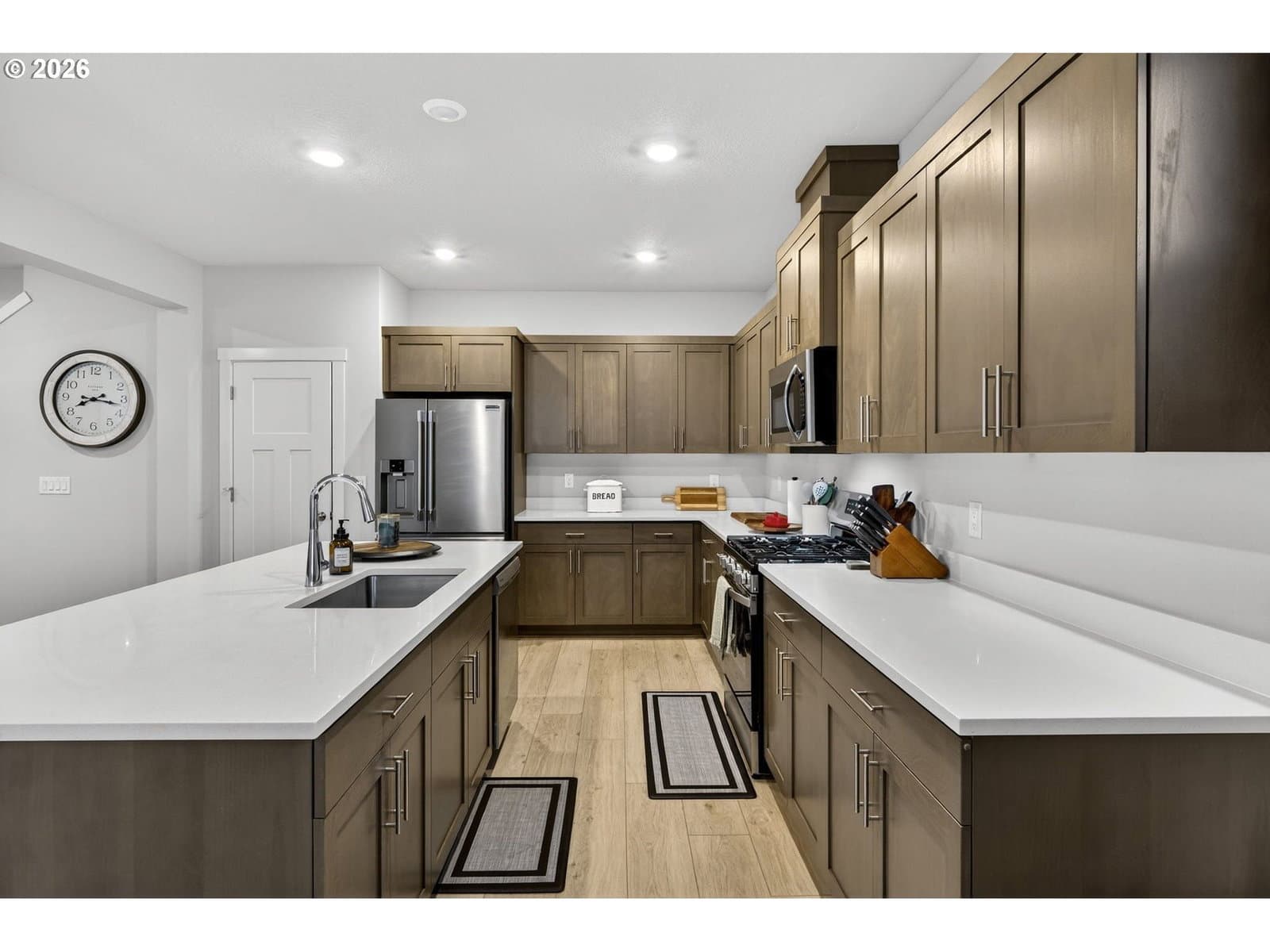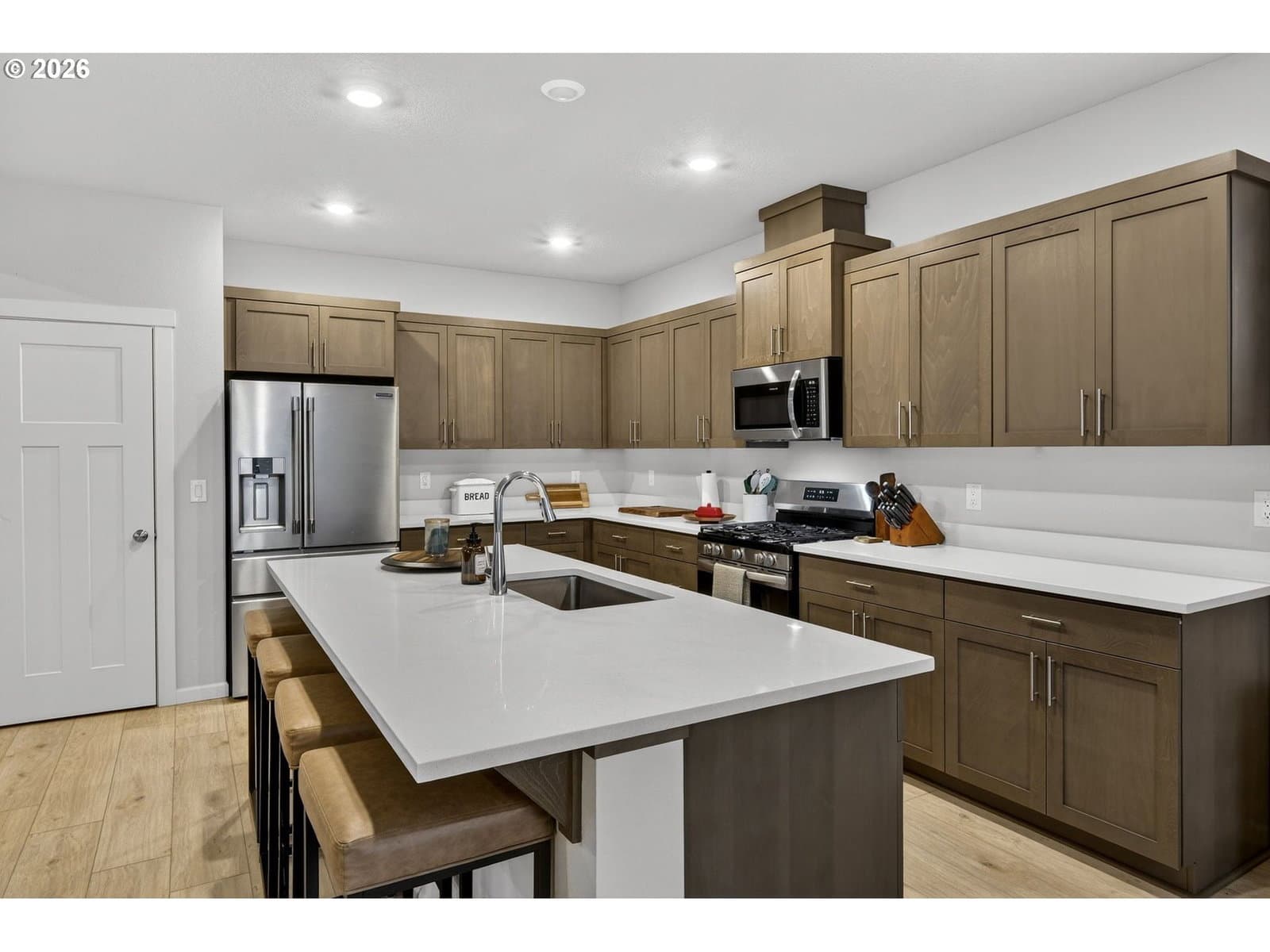 Built in 2025, this beautifully maintained 1,876 square foot two-story home in Gresham offers 4 bedrooms and 2.5 bathrooms with a warm, welcoming layout that feels even more spacious in person. The open-concept main level is filled with natural light and features luxury vinyl plank flooring, recessed lighting, and a comfortable living room anchored by a cozy gas fireplace with built-in shelving and plenty of room for oversized furniture. The kitchen is designed for gathering, complete with expansive quartz countertops, a large island with generous seating, stainless steel appliances including a gas range and built-in microwave, a walk-in pantry, and rich wood cabinetry that adds warmth and character. The dining area flows effortlessly to the backyard patio, creating an easy indoor-outdoor connection perfect for everyday living and entertaining. Upstairs, the primary suite offers a peaceful retreat with a spacious layout, dual-sink vanity with quartz counters, walk-in shower with glass enclosure, and ample storage, while three additional bedrooms provide flexible space for guests, a home office, or hobbies. Additional highlights include a dedicated laundry room with washer and dryer, high-efficiency 95%+ forced air furnace, tankless gas water heater, central air conditioning, double-pane windows, and an attached 2-car garage with abundant storage space. The fully fenced backyard features a patio and lawn area ready for summer evenings, barbecues, and room to play. This home combines modern construction with comfort and space to truly settle in—schedule your showing today!