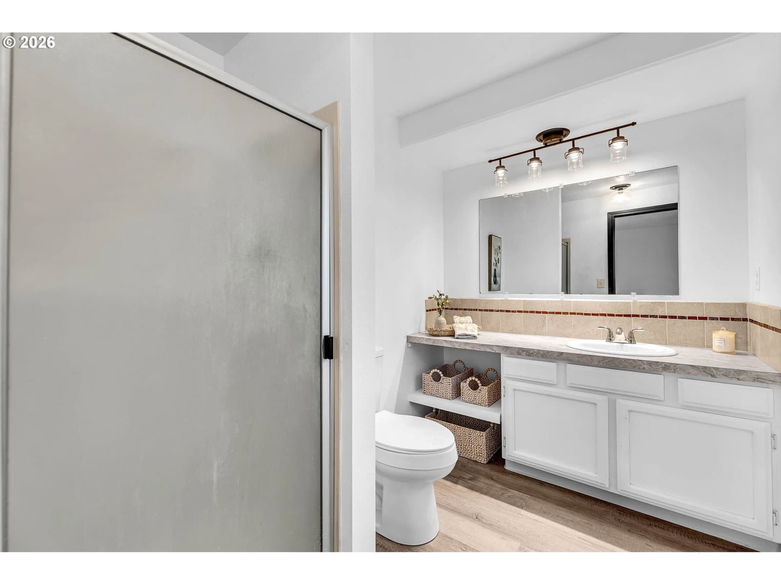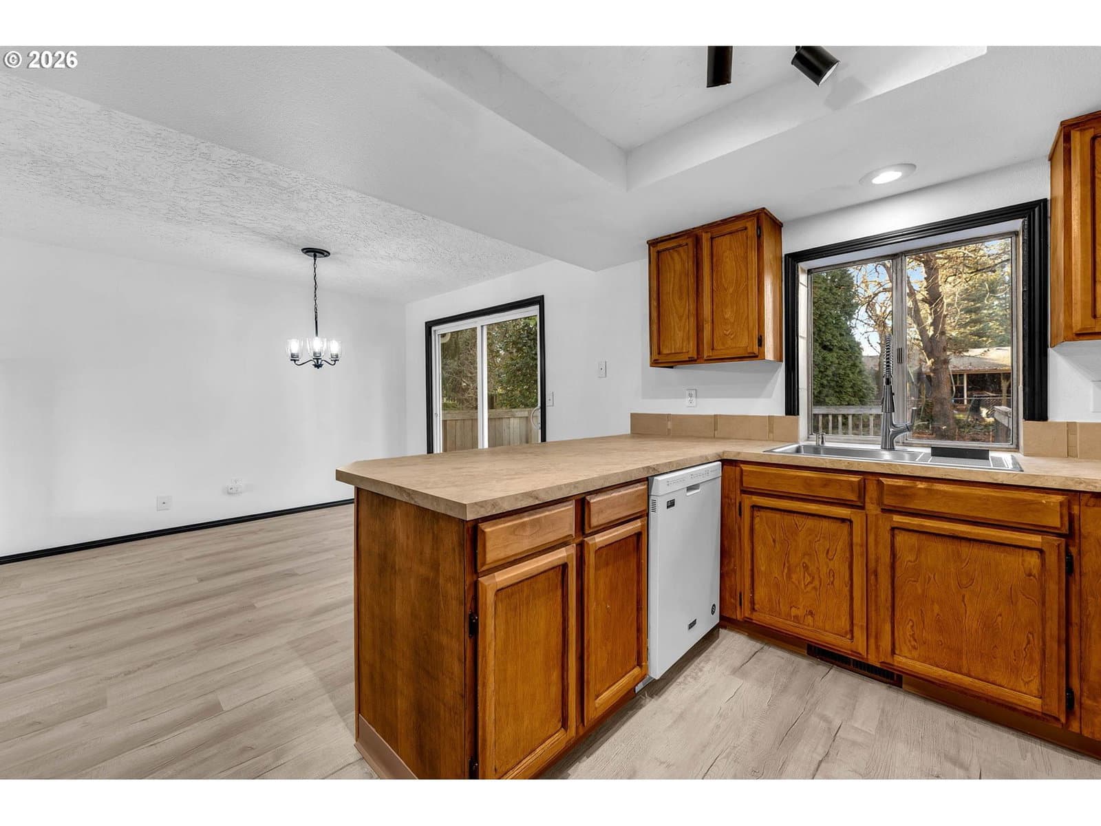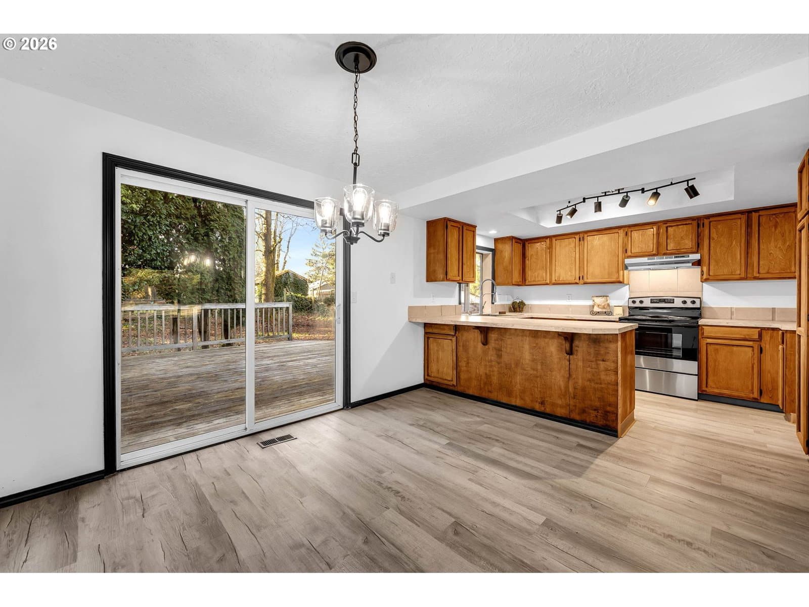 This split-level home is located on a nearly ¼ acre fenced lot with a large deck and patio for entertaining. Recent updates include new roof in 2025, laminate flooring throughout most of the house, fresh interior paint, refinished kitchen cabinets. The main level living room features an electric fireplace and large windows allowing for natural light to fill the space. Living room is open to the dining room which has access to the backyard. Kitchen has an eating bar and new range. Primary bedroom features a private full bathroom. 2nd and 3rd bedroom and a 2nd bathroom round out the main level. Lower level offers a spacious family room, and laundry/3rd full bathroom along with access to the oversized garage.