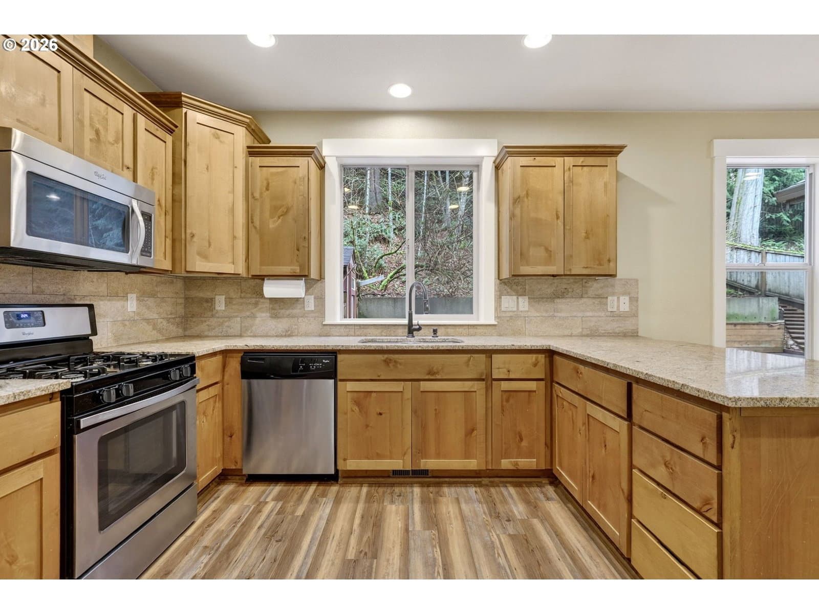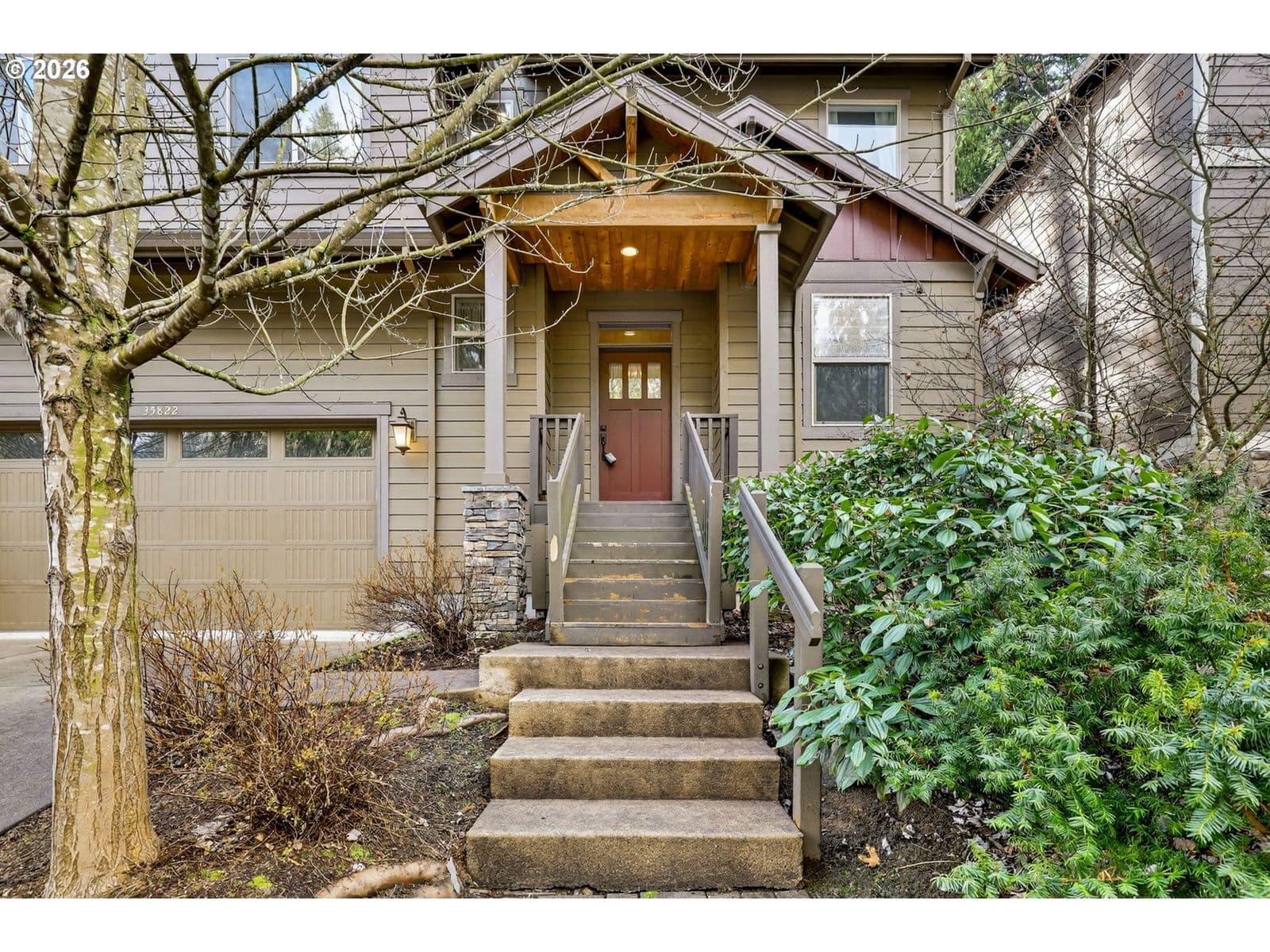 This beautifully updated home blends modern sophistication with comfort in the desirable Salmon Creek neighborhood. Step inside to a peaceful, private setting and enjoy upgraded flooring throughout the main level, vaulted ceilings, and a cozy gas fireplace. The stylish kitchen is dialed in with stainless steel appliances and thoughtful finishes—perfect for everyday living and entertaining. All three bedrooms are conveniently located with laundry room upstairs. The spacious primary suite features vaulted ceilings, a massive walk-in closet, soaking tub, separate shower, and double-sink vanity. The den/office located on the main floor with french doors. Outdoor living truly shines with a timber-framed covered patio ideal for year-round entertaining, a fully fenced backyard, additional deck space, and a tool shed. Extra parking in the driveway adds everyday convenience. This home is a must-see!