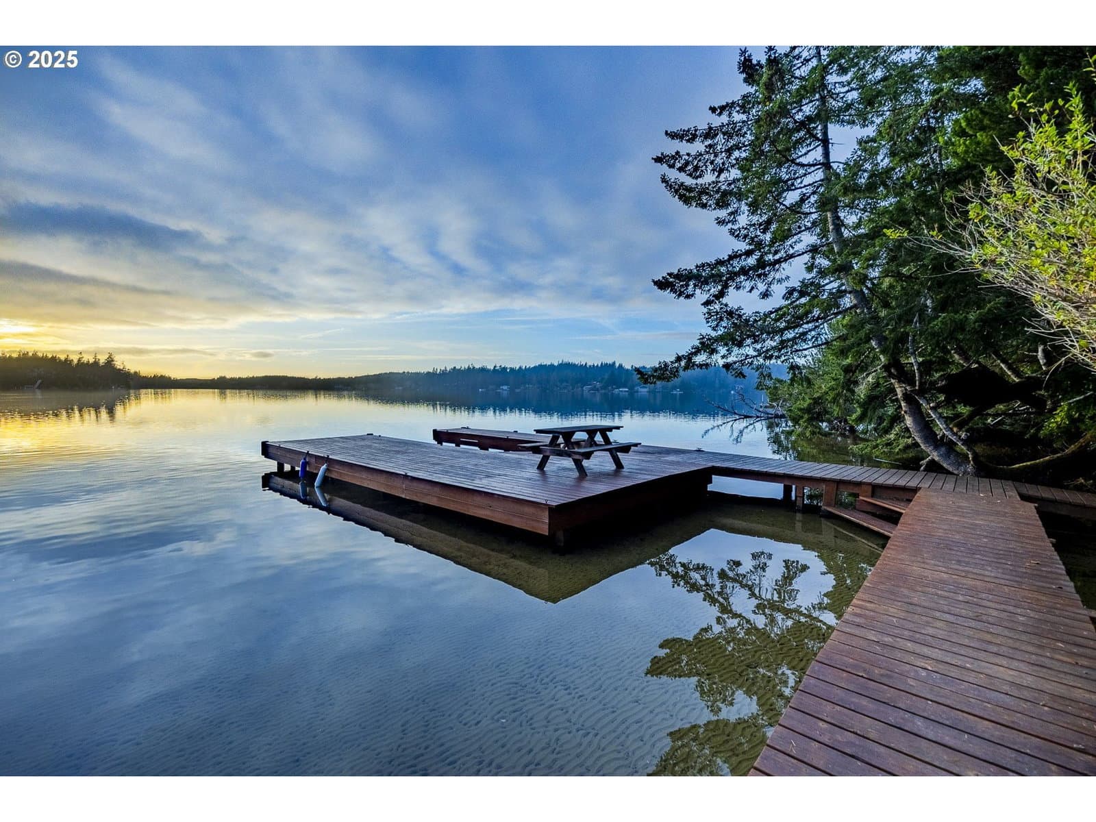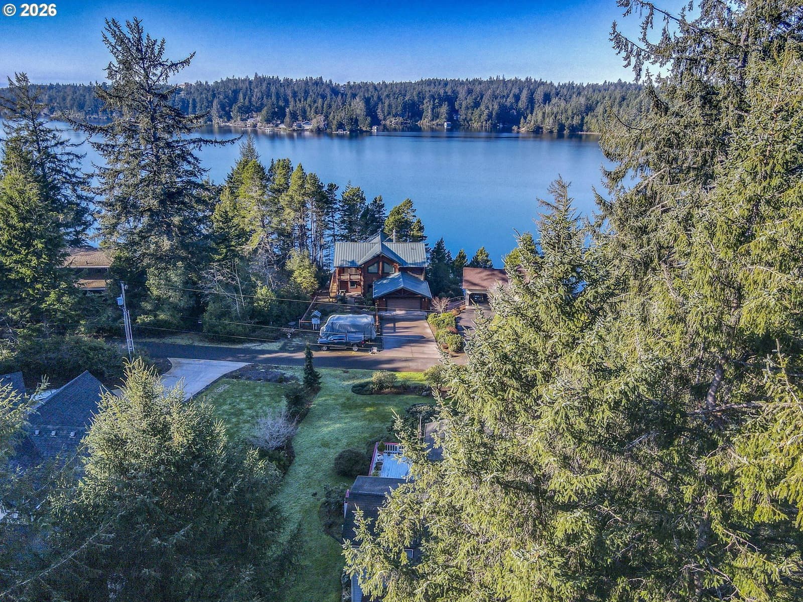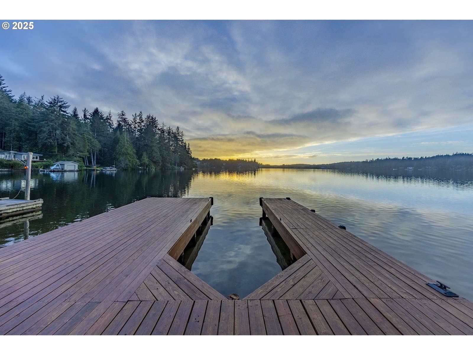 Wake up to lake views and the quiet beauty of this charming lakeside retreat designed for relaxed coastal living on Woahink Lake. Surrounded by trees and offering dock access, this is a place where life naturally slows down and the ocean is just minutes away. You’ll step inside to vaulted, beamed ceilings that create an open and welcoming feel. The living room invites you to curl up with a book, enjoy the views, or gather with friends. Multiple doors open to an expansive deck that stretches along the home, perfect for outdoor dining, entertaining, or simply taking in the beauty of the lake and evening sunsets. The primary suite is a true escape, featuring vaulted ceilings, skylights, peaceful lake views, and a private deck where your morning coffee comes with a view. With two bedrooms and two baths, plus additional space that can easily be converted into a third sleeping area, the home offers flexibility for guests, hobbies, or future needs. Whether you’re looking for a weekend getaway, a full-time lake home, or a vacation rental, this Woahink Lake home offers warmth, character, and a truly peaceful setting. Don’t miss out, opportunities like this are rare so schedule a private showing soon.