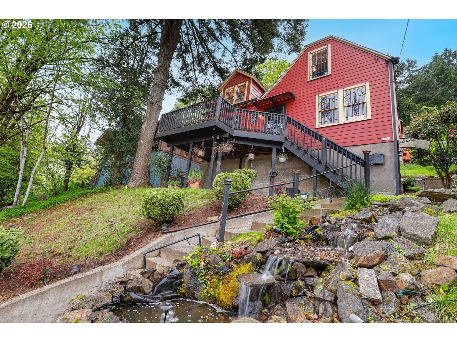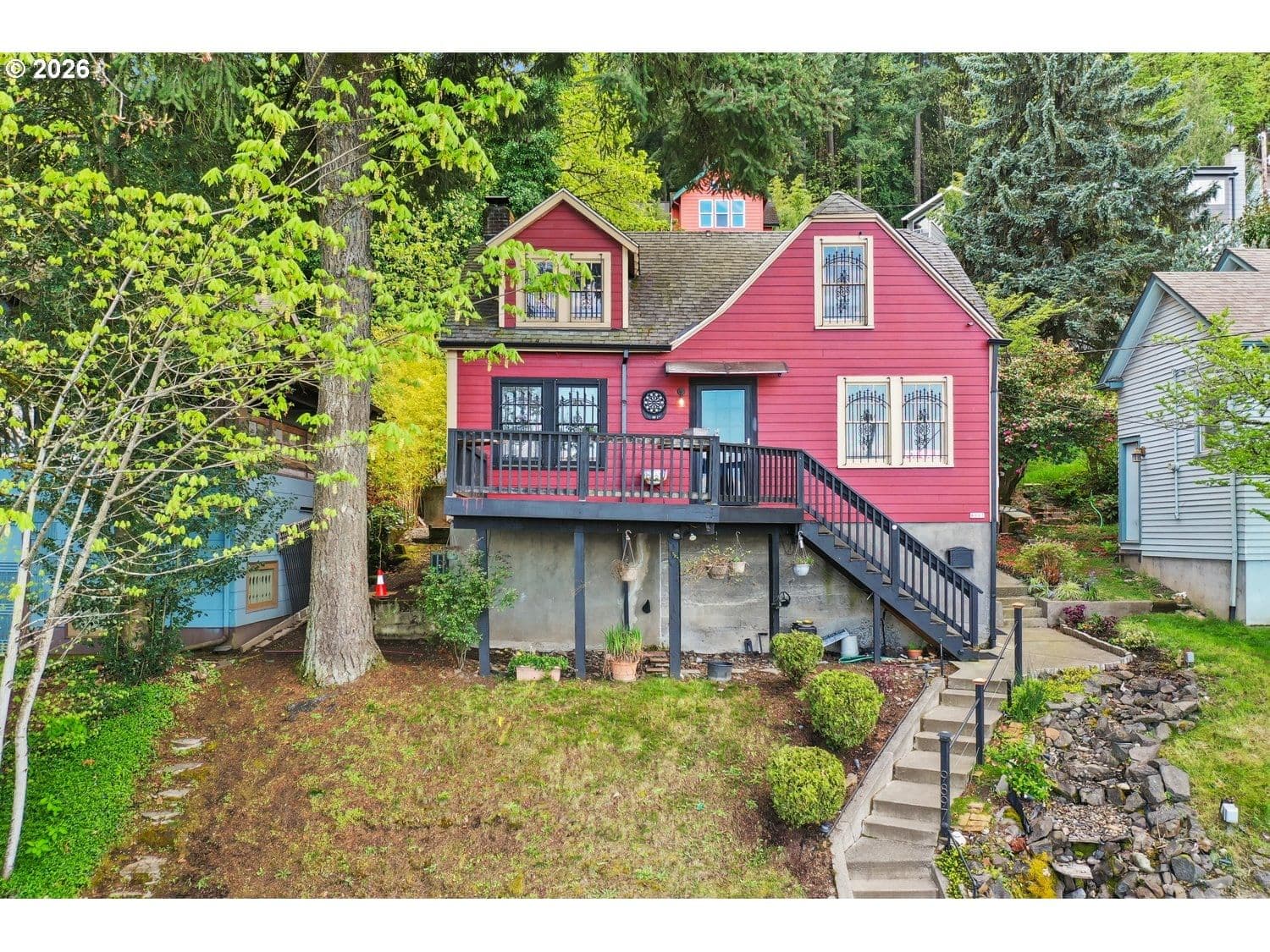 At the base of Forest Park, this classic and comfortable home offers views of two mountains and overlooks the Willamette River, all just blocks from multiple trailheads. The three-level layout provides flexible living options, including a lower-level family room with its own exterior entrance. There are three true bedrooms, plus a non-conforming fourth for additional sleeping space. Upstairs, a bonus area is ideal for an office, workout space, or relaxing while taking in river and mountain views. Outside, enjoy the covered deck with privacy curtains, an outdoor fireplace, and a cascading water feature. [Home Energy Score = 3. HES Report at https://rpt.greenbuildingregistry.com/hes/OR10246502]