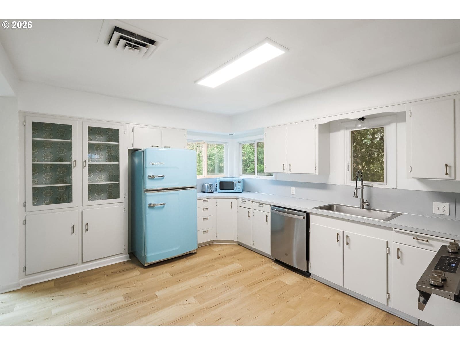 Don’t worry, be happy! This home has been recently refreshed with refinished hardwoods, newer roof, windows, sewer line, and electrical panel. You wouldn't know it from the outside, but this house has SPACE with several living/working spaces in addition to the three bedrooms. The floor plan has great flow, and the first floor is cozy with a sweet wood burning fireplace and large open kitchen and dining area with plenty of built-in storage. Two spacious bedrooms are on the main floor in addition to the finished basement bedroom with egress. Home has a finished attic loft space and additional basement rooms not included in the bedroom count!Additional perks include an HRV fresh air system, detached garage, and paved covered patio for entertaining. Room to roam on this giant lot that's over a quarter of an acre! [Home Energy Score = 7. HES Report at https://rpt.greenbuildingregistry.com/hes/OR10206397]