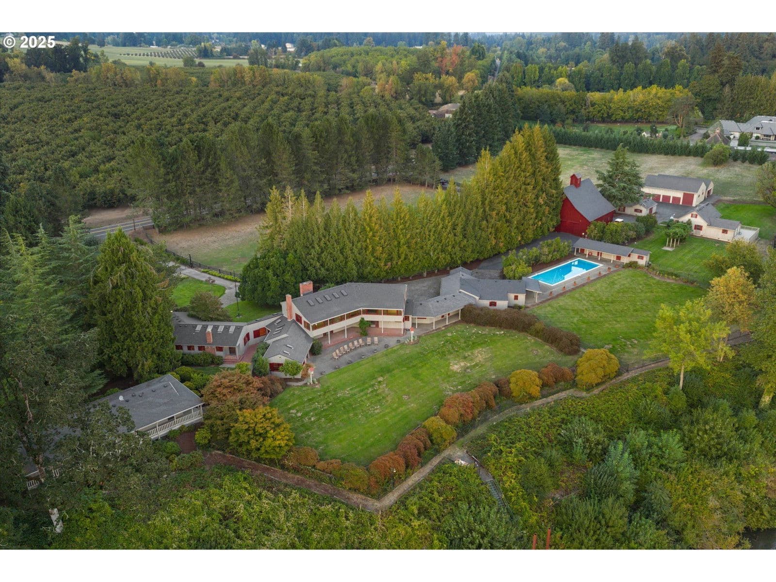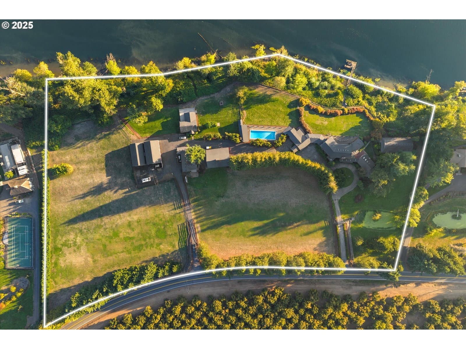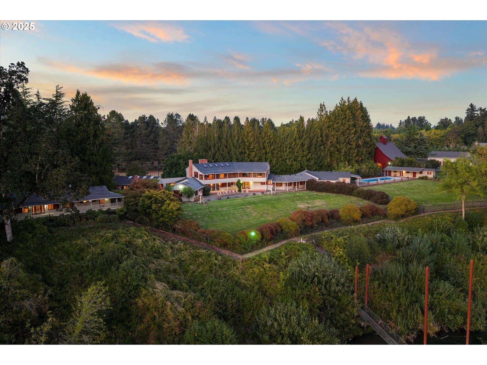 THE PINES ESTATE. Nestled at the heart of wine country on over 10 acres with one-fifth of a mile of premier Willamette River frontage. The 'Pines' is a rare generational sanctuary where timeless architecture meets natural beauty. Behind a private gate, a circular drive leads through two acres of manicured lawns and pasture accented by a tranquil pond, setting the tone for this extraordinary riverfront retreat. The property comprises four distinct residences — the charming estate home, a 6-bedroom/5-bath guest house, a charming waterfront cottage, and a field cottage — each thoughtfully placed to capture serene views of the river and surrounding landscape. Originally designed in 1937 by renowned Portland architect Roscoe Hemenway for Mrs. M. Lloyd Frank of the Meier and Frank department store family. The main house showcases Oregon’s artisanal legacy with stone and timber elements inspired by Timberline Lodge. Inside, soaring beams, handcrafted fireplaces, and a rambling floor plan evoke warmth and a sense of heritage. Modern updates blend seamlessly with classic design, offering a main-floor primary suite, expansive great room anchored by a grand stone fireplace, elegant dining room, library with a rare brick beehive fireplace and country kitchen designed for gatherings large or small—all oriented to frame breathtaking views of the Willamette. Upstairs, the original primary suite opens to a sun porch overlooking the river. Outdoor living shines with lush grounds, an inviting pool, brick patio, and a private path leading to the dock for boating, paddle boarding, or peaceful reflection. Across the river, protected views of Champoeg State Heritage Site ensure lasting privacy and serenity. A place where stories are written and generations gather. The 'Pines' is more than a home—it’s a legacy on the banks of the Willamette River.
