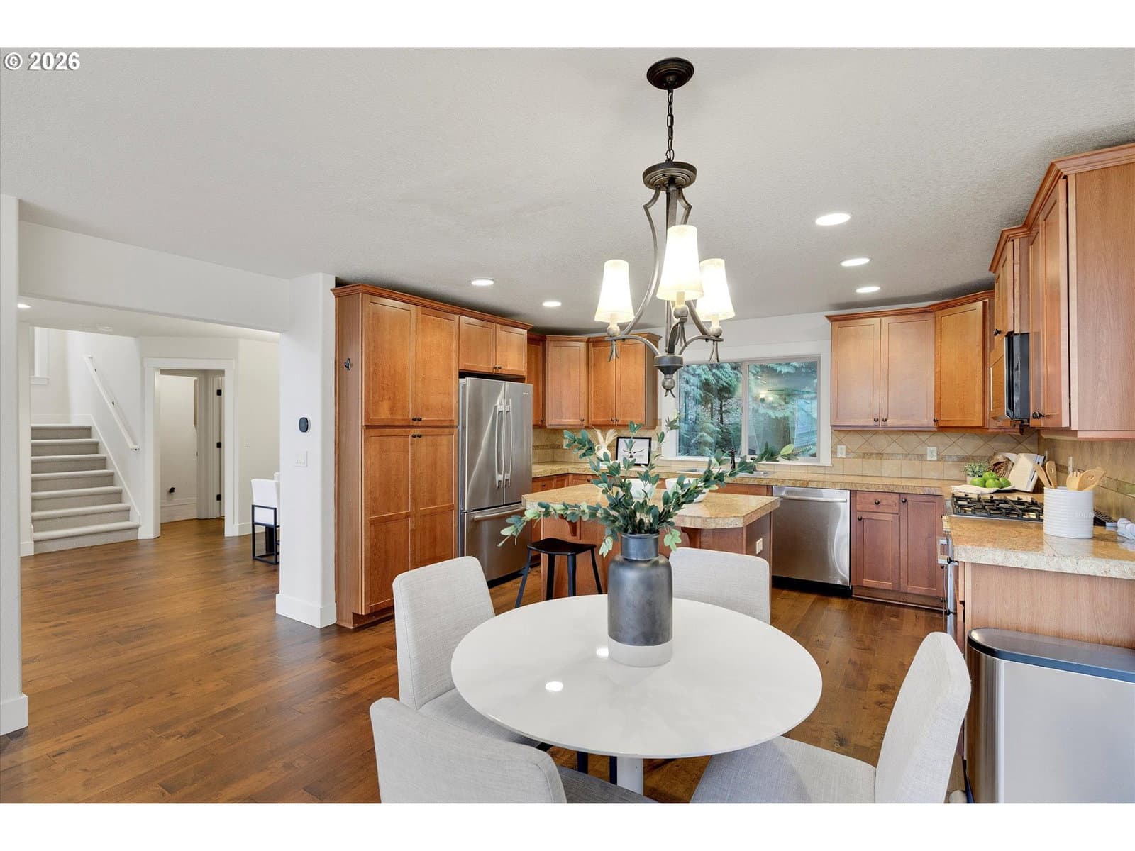 This inviting home features high ceilings and abundant natural light throughout, creating a bright and open atmosphere. Recent upgrades include engineered hardwood flooring, new carpet and tile, updated appliances, fresh interior and exterior paint, and a roof replaced in 2015. Additional improvements include a new exterior deck and stairs, hot water tank, and air conditioning. Generously sized rooms and a peaceful setting make this home both comfortable and welcoming.
