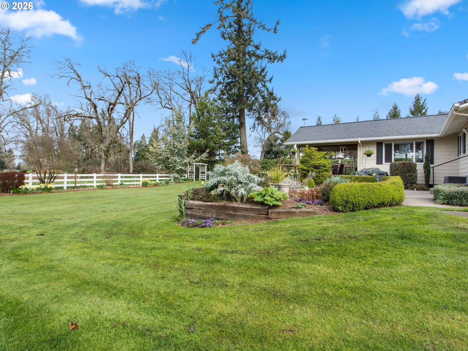 Stunningly crafted customized ranch, on Master Gardiner Designed and Landscaped Property, Overlooking Tree Lined Views and Golf Course on the 14th Tee Box! Expertly designed remodel with carefully selected finishes throughout. Enter through the front door into a light and bright oasis, featuring hard wood floors, and front reception and living room, overlooking beautifully manicured front landscaping. Fireplace with brick finish and custom mantle, perfect for gathering, or simply enjoying nature next to a cozy fire. Updated kitchen with stainless steel appliances, solid surface granite countertops, window overlooking front views, custom cabinetry with hand crafted stained glass display panels. Kitchen connects to an open living space, with vaulted, exposed wood paneled ceilings and beams, complete with dining area and cozy sitting area with a fireplace. TV room/bonus area/game or reading room, boasts another statement feature fireplace with custom shelving, plenty of space for seating and enjoying leisurely activities. Utility room with sink, large pantry, and storage. Primary Bedroom with on suite remodeled bathroom and French doors leading to hot tub area. Outdoor area is a nature, golf lovers, landscapers dream! Designed and manicured by Master Gardiners, the yard features a full outdoor kitchen, exposed wood, vaulted ceiling covered patio, and fan with seating area, hot tub, waterfall, pond, and gardening beds, all overlooking the tree lined view of golf course! Garden includes 5 raised garden beds, 140 blueberry plants, producing 1,000 lbs per year u-pick, 9 fruit trees, asparagus, and a variety of grapes. Outbuildings galore make for a hobbyist's dream! 576 sq ft detached garage, 36x28 ft shop, complete with work benches, built ins, electricity, and wood stove for heating, 24x36ft RV shed, 16x12 ft tractor building, and 8x16 wood shed, 8x12ft greenhouse.27 solar panels 1t 327 watts, for an est.11,478 kw per year. Backup energy with gas generator.