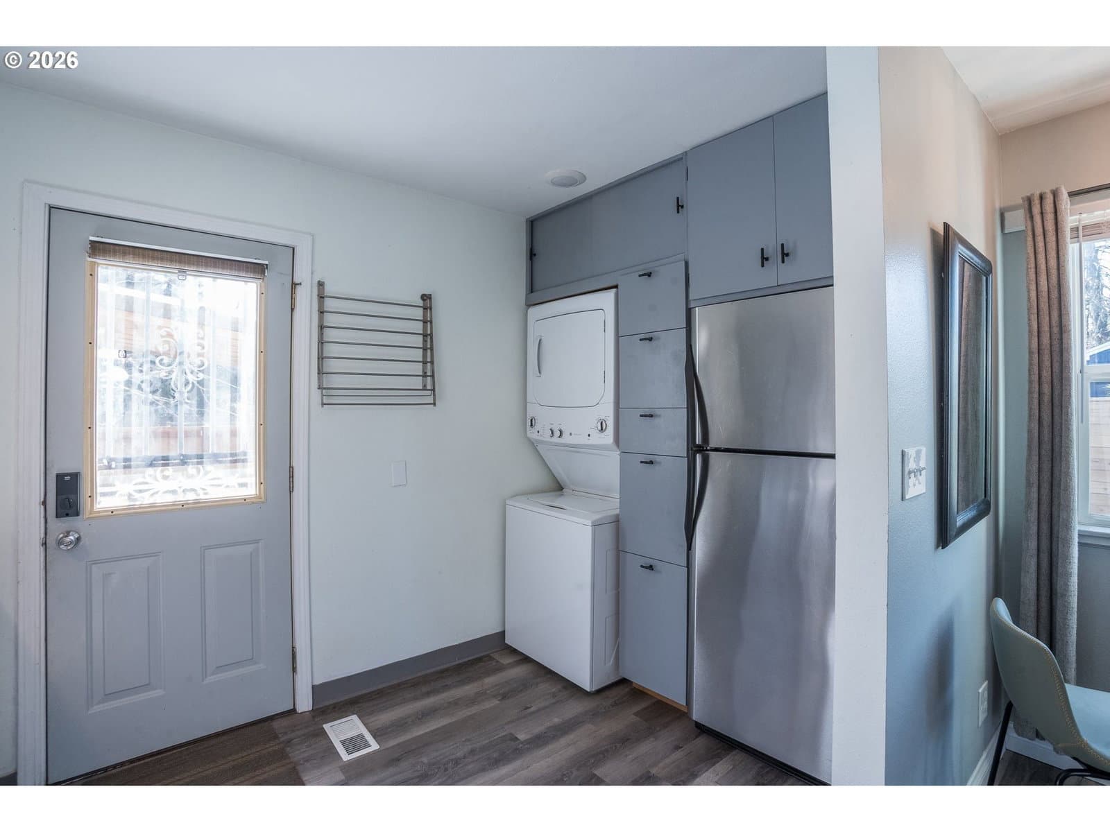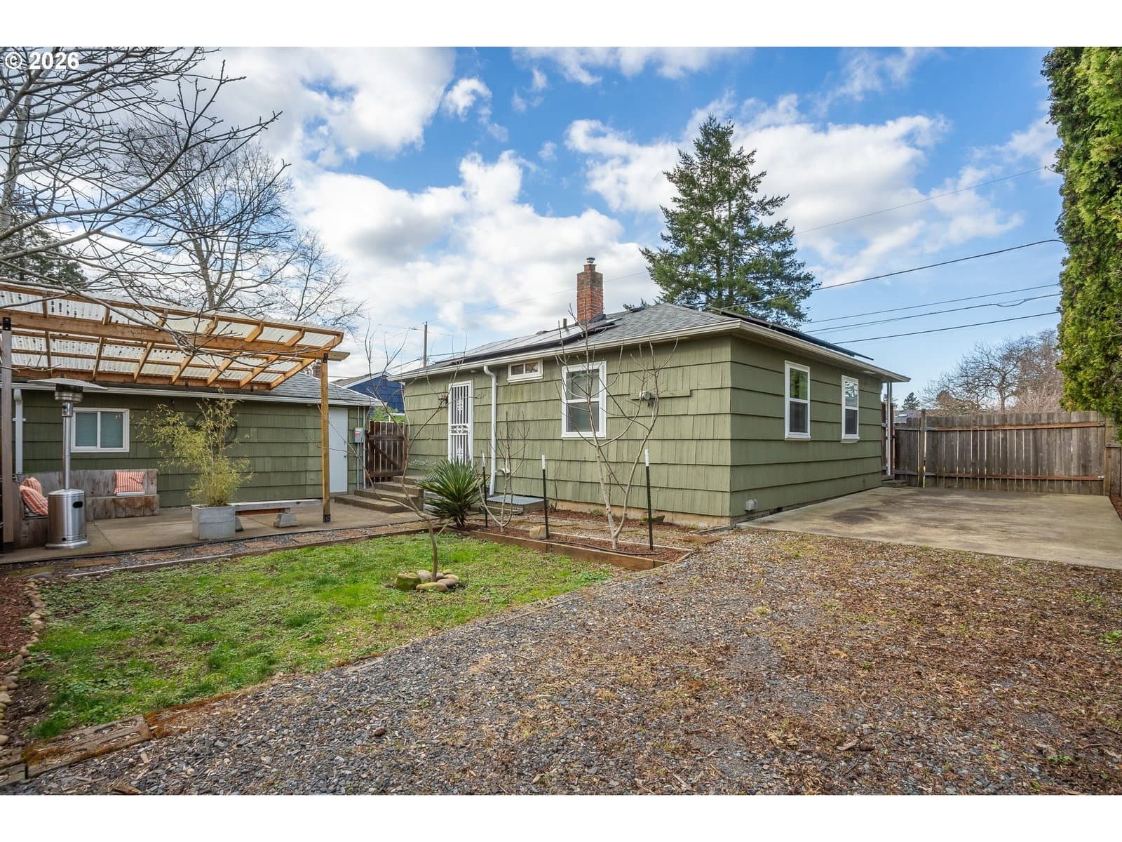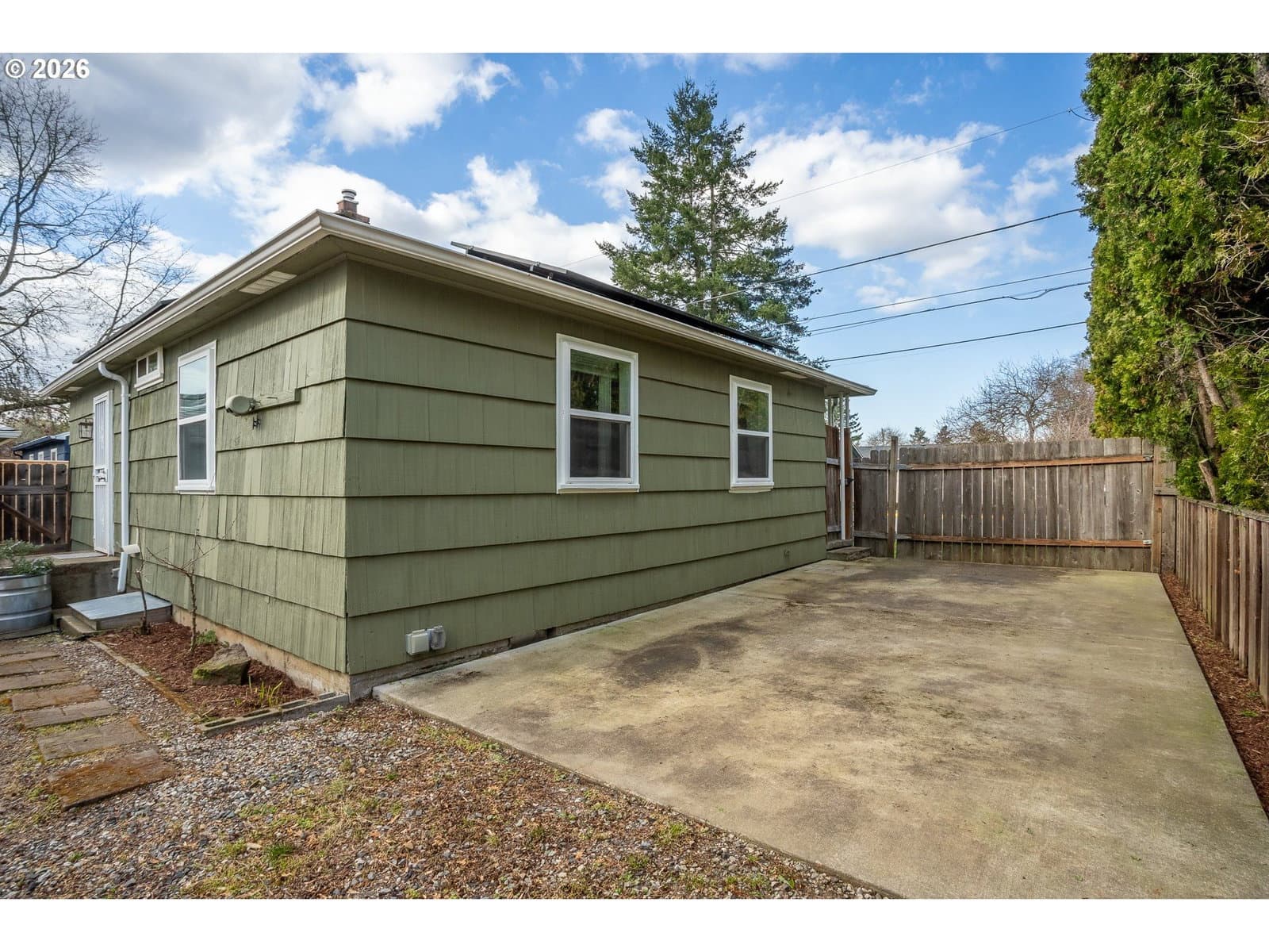 Small but mighty, this thoughtfully upgraded bungalow offers comfort, efficiency, and peace of mind. Earning a perfect 10/10 Home Energy Score, the home reflects careful updates including extensive electrical upgrades with a new panel and subpanels for the house and garage. Solar panels added in December of 2022, insulation blown into all exterior walls, a tankless hot water heater, minisplit system, and newer appliances including a dishwasher, range with hood, and washer/dryer support easy, sustainable living. Additional updates include a remodeled kitchen with quartz countertops, an earthquake retrofit, active radon mitigation system, and a newly built covered back patio with a built-in bench. Set back from the street, the home enjoys a private front yard and an efficient layout. The kitchen offers space for dining and countertop seating, opening to a warm and welcoming living room. Two bedrooms are tucked toward the back for privacy, with a centrally located full bathroom. Enjoy year-round outdoor living on the covered patio, plus RV parking with a 30-amp hookup. A detached two-car garage provides space for parking, storage, or projects. Conveniently located near parks, transit, and neighborhood amenities—come see how easily you could make yourself at home here. [Home Energy Score = 10. HES Report at https://rpt.greenbuildingregistry.com/hes/OR10087035]