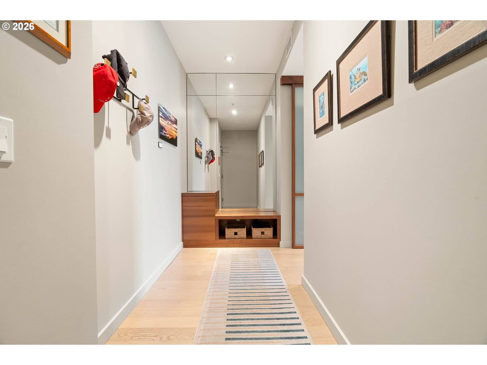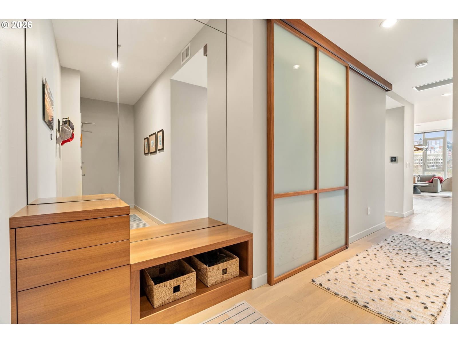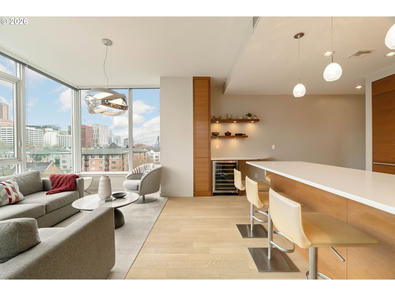 Stunning home along the riverfront at the Strand with city, river & west hills views. Fully remodeled for modern living, this one bedroom + den features luxury finishes, thoughtful additions, high-end appliances, custom cabinetry & built-in storage throughout. The open concept U-shaped gourmet kitchen is the heart of the home with ample counter space, handmade tile backsplash, Wolf Range, SubZero refrigerator, and a built-in bar area with storage & wine cooler. Both kitchen & living overlook panoramic views of the west hills, Willamette River & Hawthorne Bridge. Adjacent to the living is a super functional den space with built-in storage, hideaway desk, queen-sized murphy bed/sofa system, and wrap-around outdoor deck. The south facing primary bedroom features a walk-in closet with custom built-ins & hardwood floors. The bathroom has been completely custom remodeled with walk-in rain shower with bench seating and Ann Sacks tile. Home is complete with deeded parking & storage. The Strand is a luxury condominium at the heart of the beautiful Portland Waterfront just steps to restaurants, shops, parks, the riverfront trail, Streetcar, OHSU & Downtown Portland. The best of urban living.