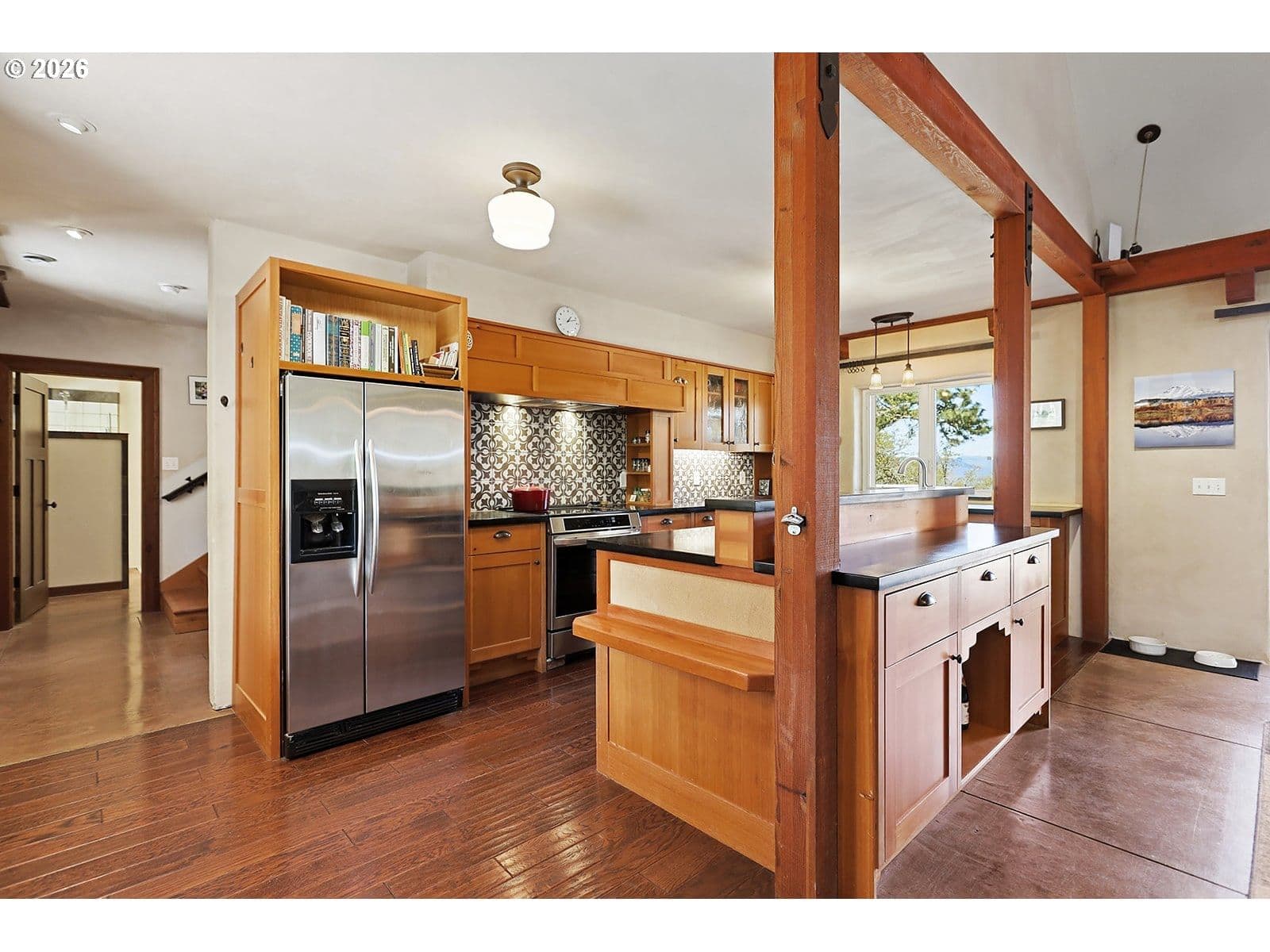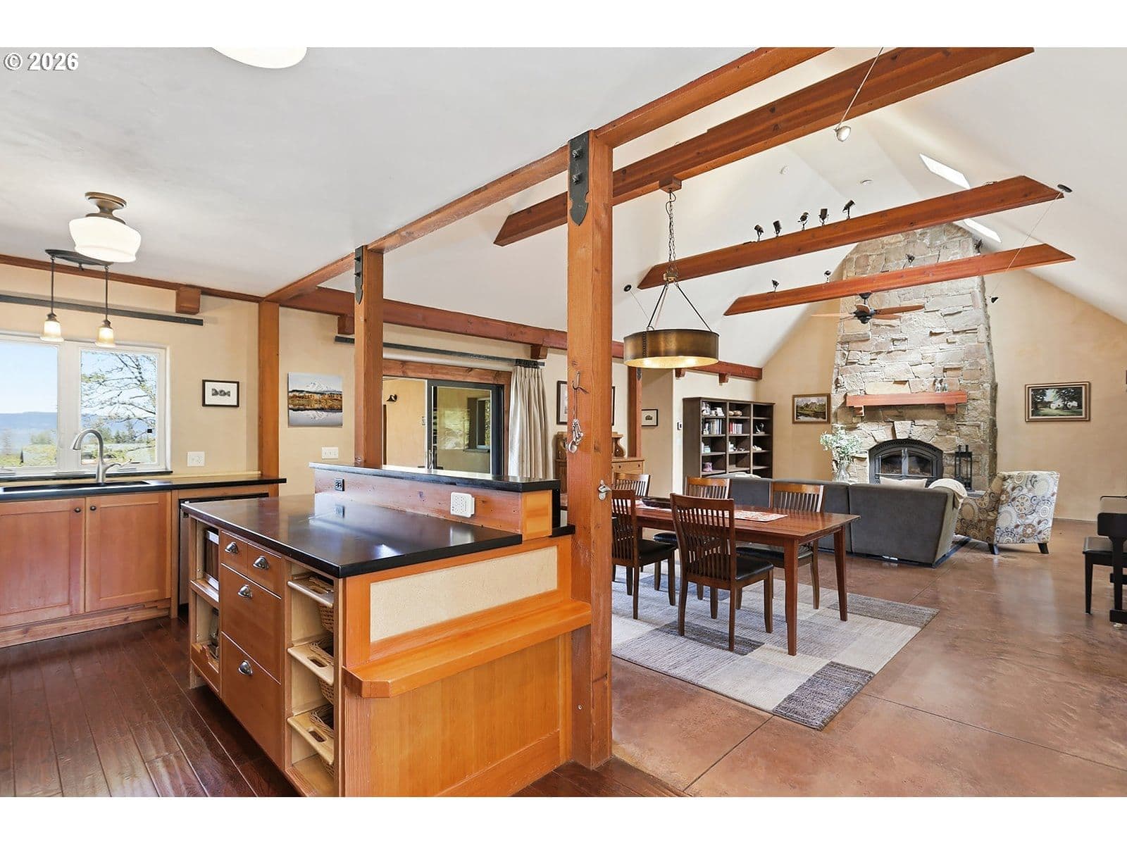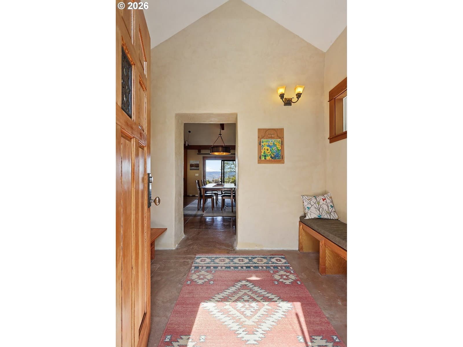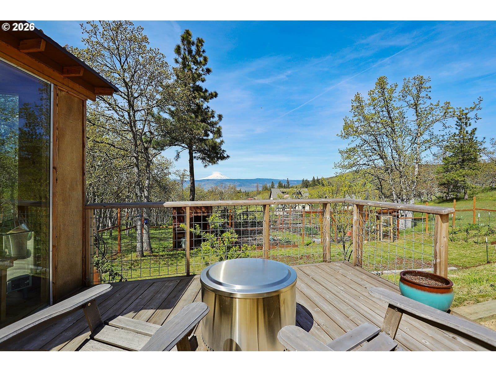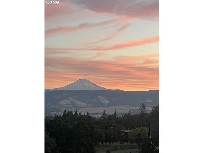 Custom Timber Frame, Green Home with unobstructed views of Mt. Adams located in Mosier, Oregon, on 6.37 acres. This 2,283 square foot residence features four bedrooms and three full bathrooms. The open floor plan offers a spacious great room with a vaulted ceiling and a floor-to-ceiling stone fireplace, as well as an open kitchen with paper stone countertops. Flooring is polished concrete and reclaimed wood, with radiant heating throughout. Twenty-nine solar panels provide most of the power for this fully electric home. Three bedrooms are situated on the main living floor, while the primary suite occupies the second floor. The house boasts custom wrought iron fixtures and schoolhouse lighting. Built in 2020, the 1,500 square foot garage has two car bays, a workshop and a recreation room. Adjacent to the home is a 250 square foot, sunny, detached heated studio with sink. Attached to the studio is a sauna and hot-water outdoor shower. The wrap-around covered porches offer outdoor entertainment opportunities. The grounds feature a fencedyard and irrigated gardens with raised beds, grapevines, berries, and fruit trees. Peaceful setting. The home has been featured multiple times on the Green & Solar Home Tour.