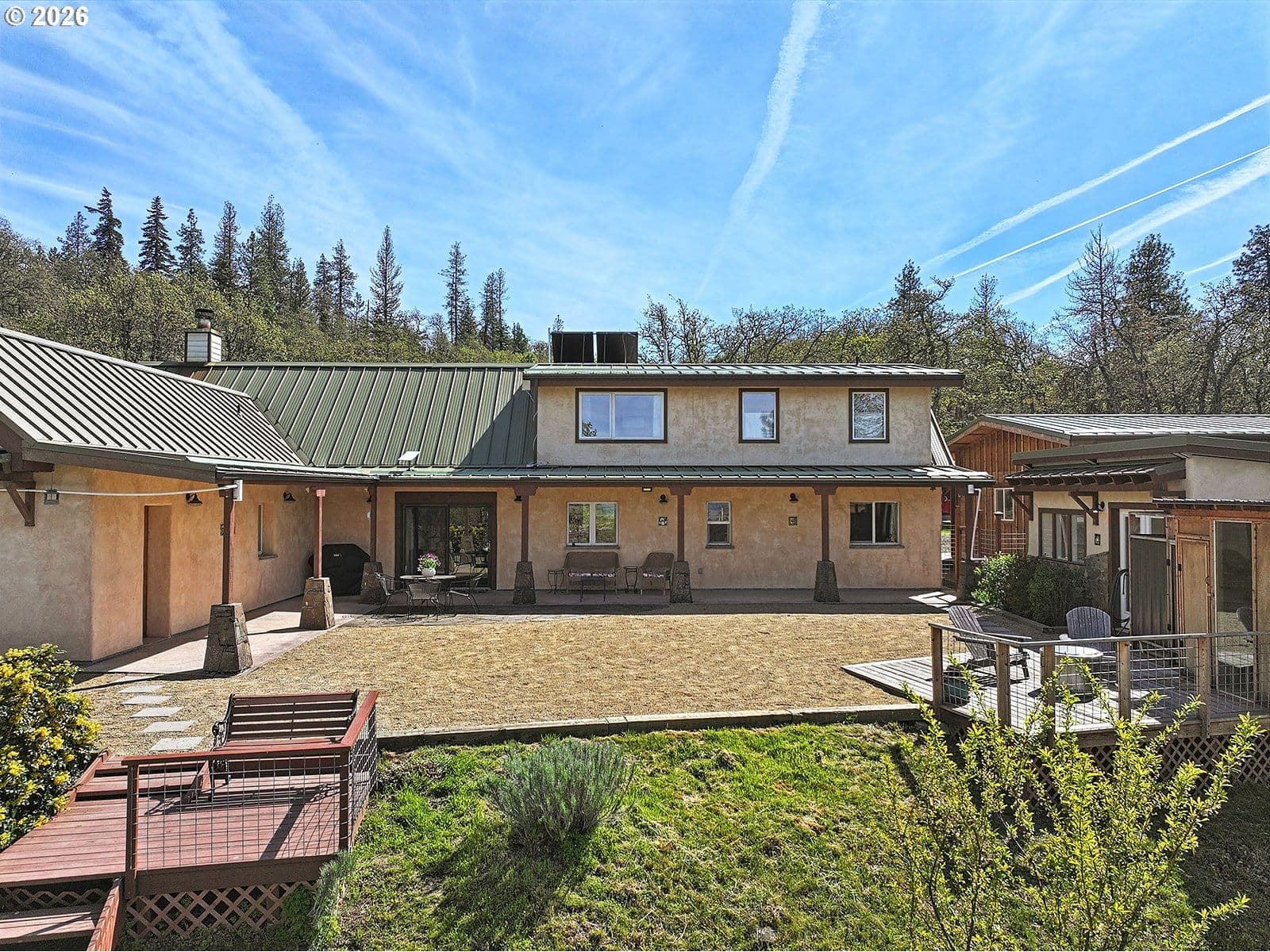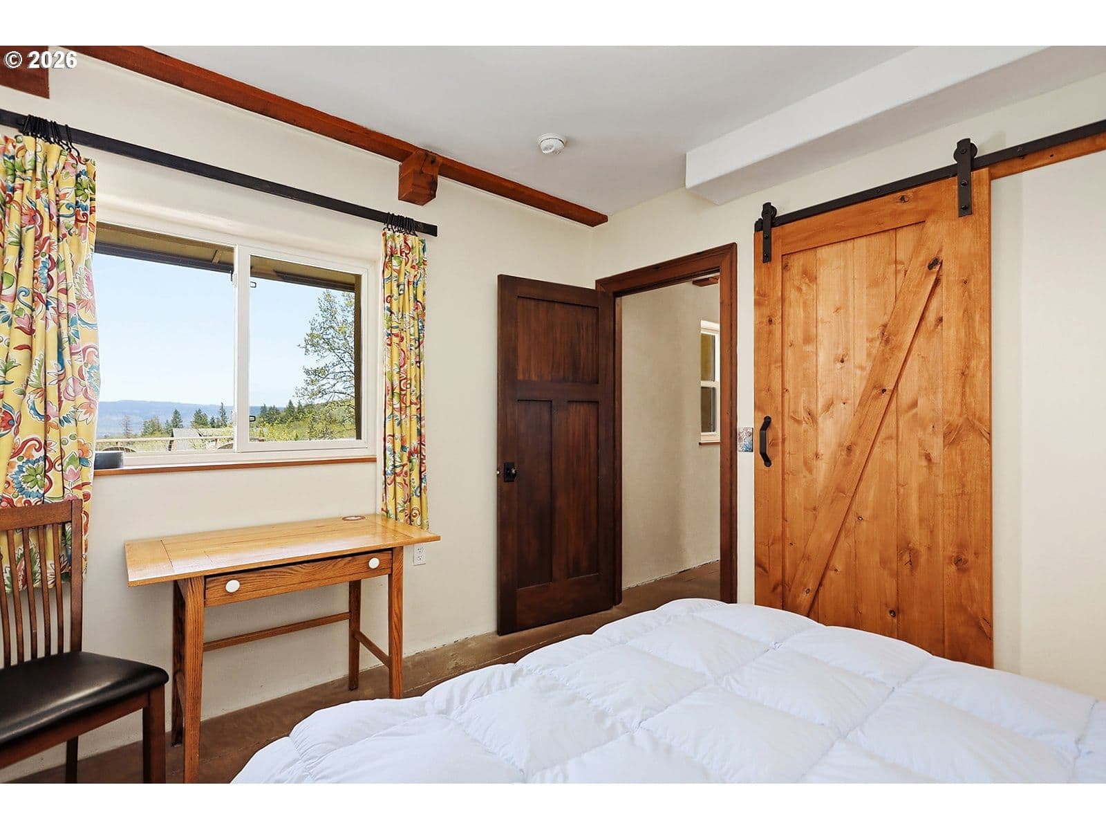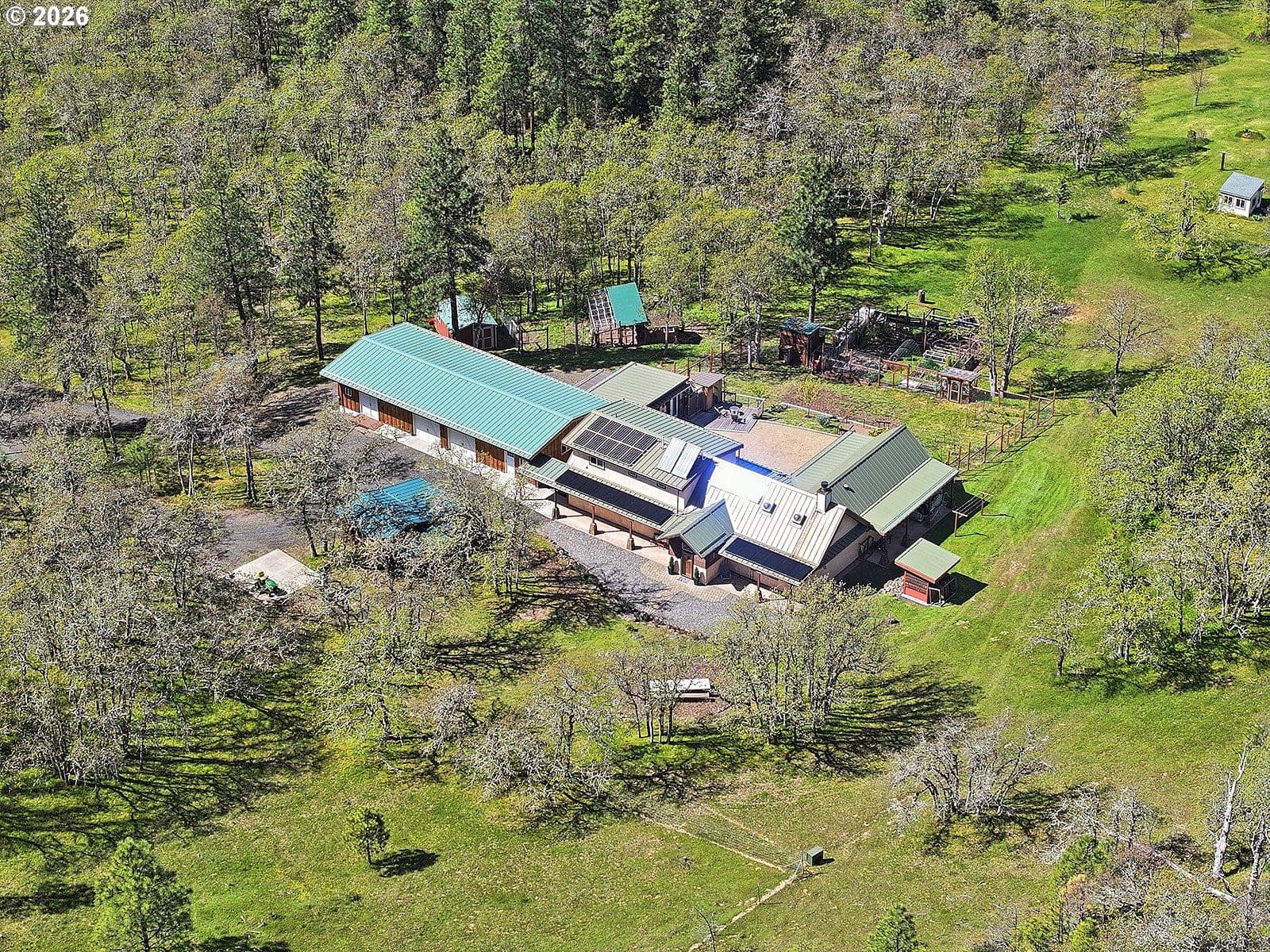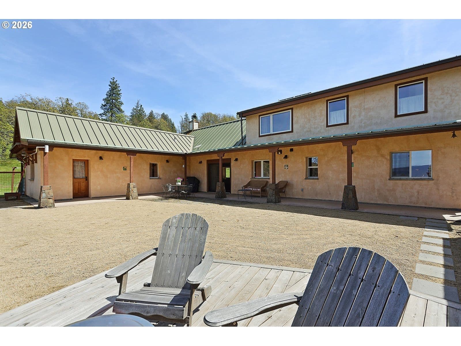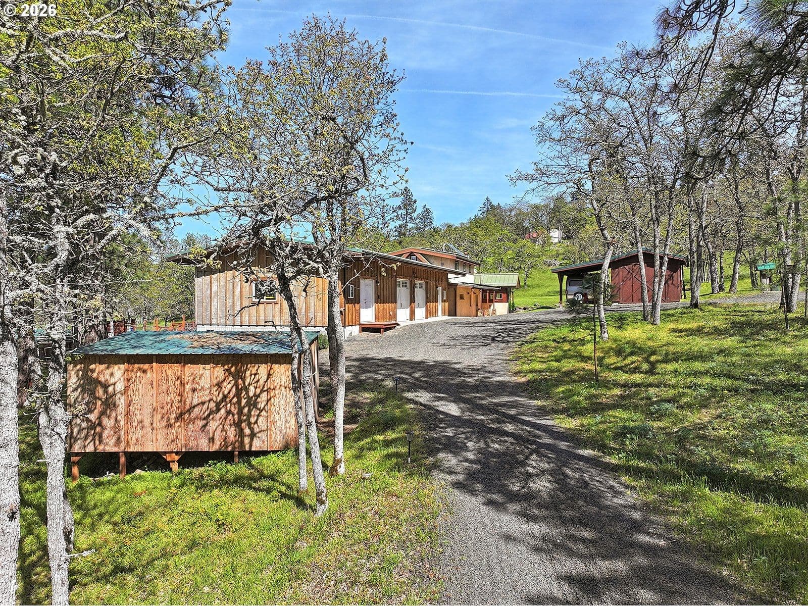 Custom Timber Frame, Green Home with unobstructed views of Mt. Adams located in Mosier, Oregon, on 6.37 acres. This 2,283 square foot residence features four bedrooms and three full bathrooms. The open floor plan offers a spacious great room with a vaulted ceiling and a floor-to-ceiling stone fireplace, as well as an open kitchen with paper stone countertops. Flooring is polished concrete and reclaimed wood, with radiant heating throughout. Twenty-nine solar panels provide most of the power for this fully electric home. Three bedrooms are situated on the main living floor, while the primary suite occupies the second floor. The house boasts custom wrought iron fixtures and schoolhouse lighting. Built in 2020, the 1,500 square foot garage has two car bays, a workshop and a recreation room. Adjacent to the home is a 250 square foot, sunny, detached heated studio with sink. Attached to the studio is a sauna and hot-water outdoor shower. The wrap-around covered porches offer outdoor entertainment opportunities. The grounds feature a fencedyard and irrigated gardens with raised beds, grapevines, berries, and fruit trees. Peaceful setting. The home has been featured multiple times on the Green & Solar Home Tour.