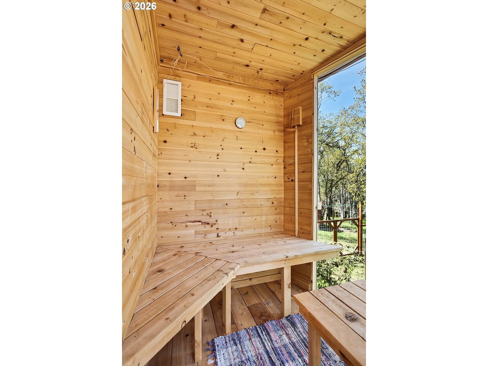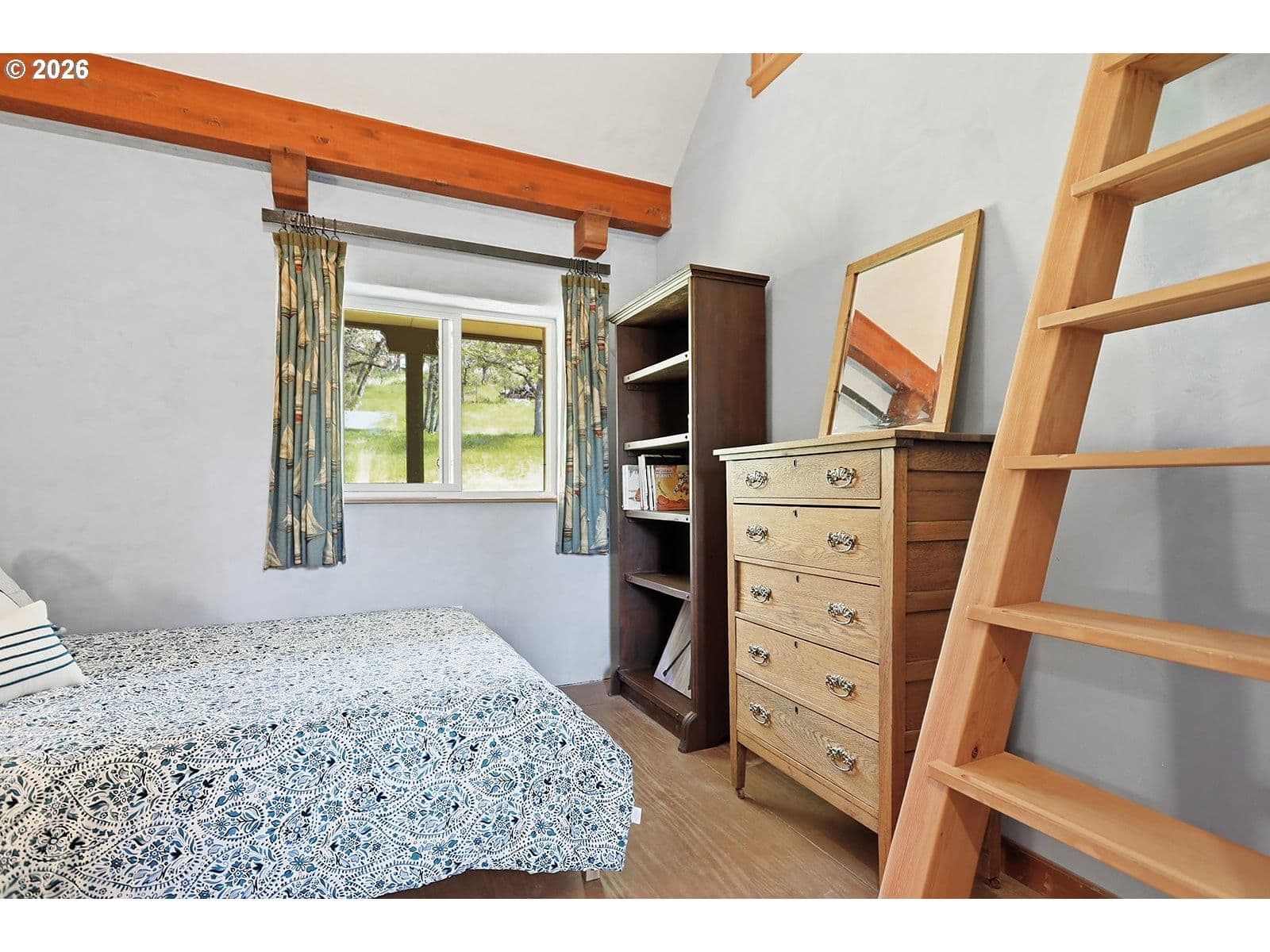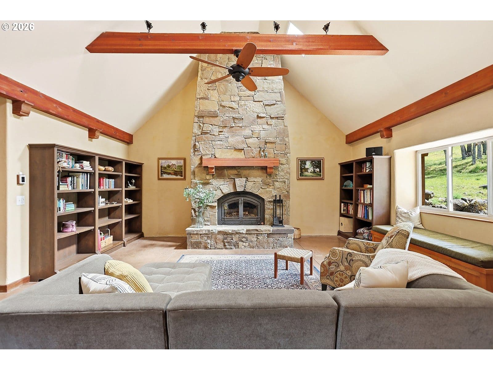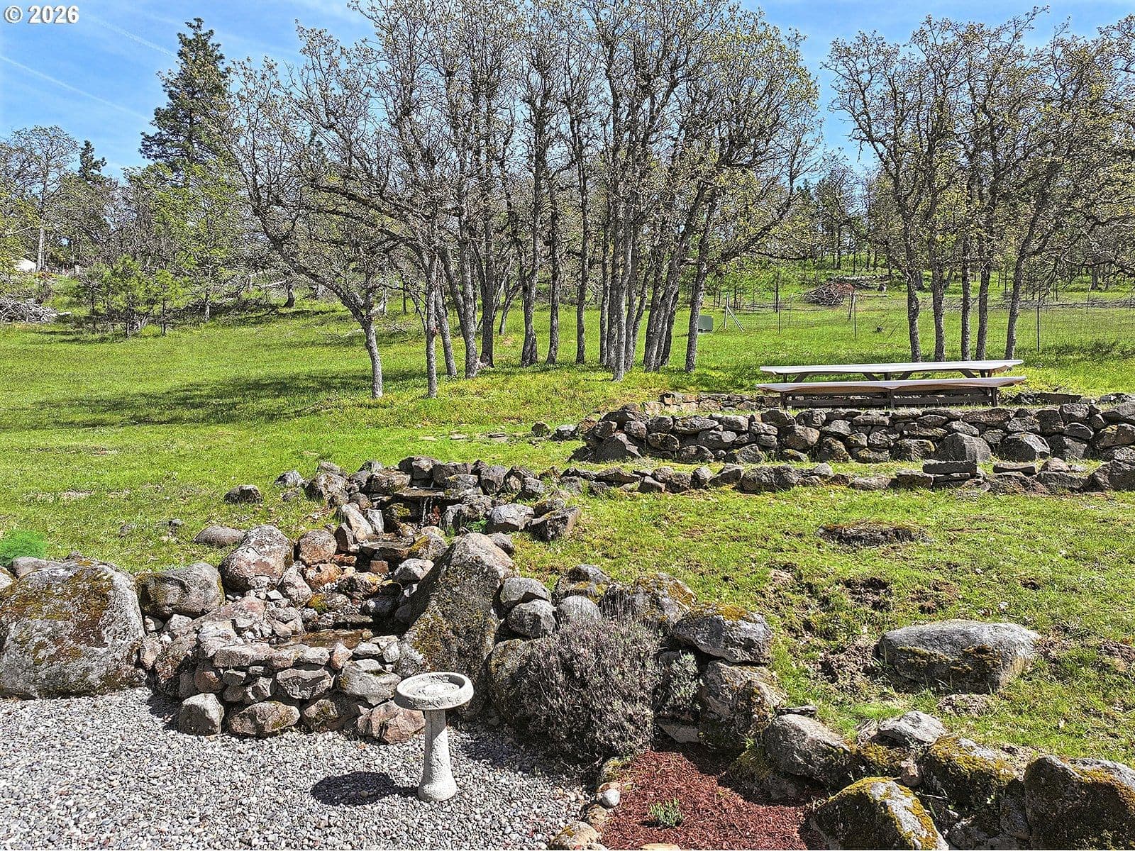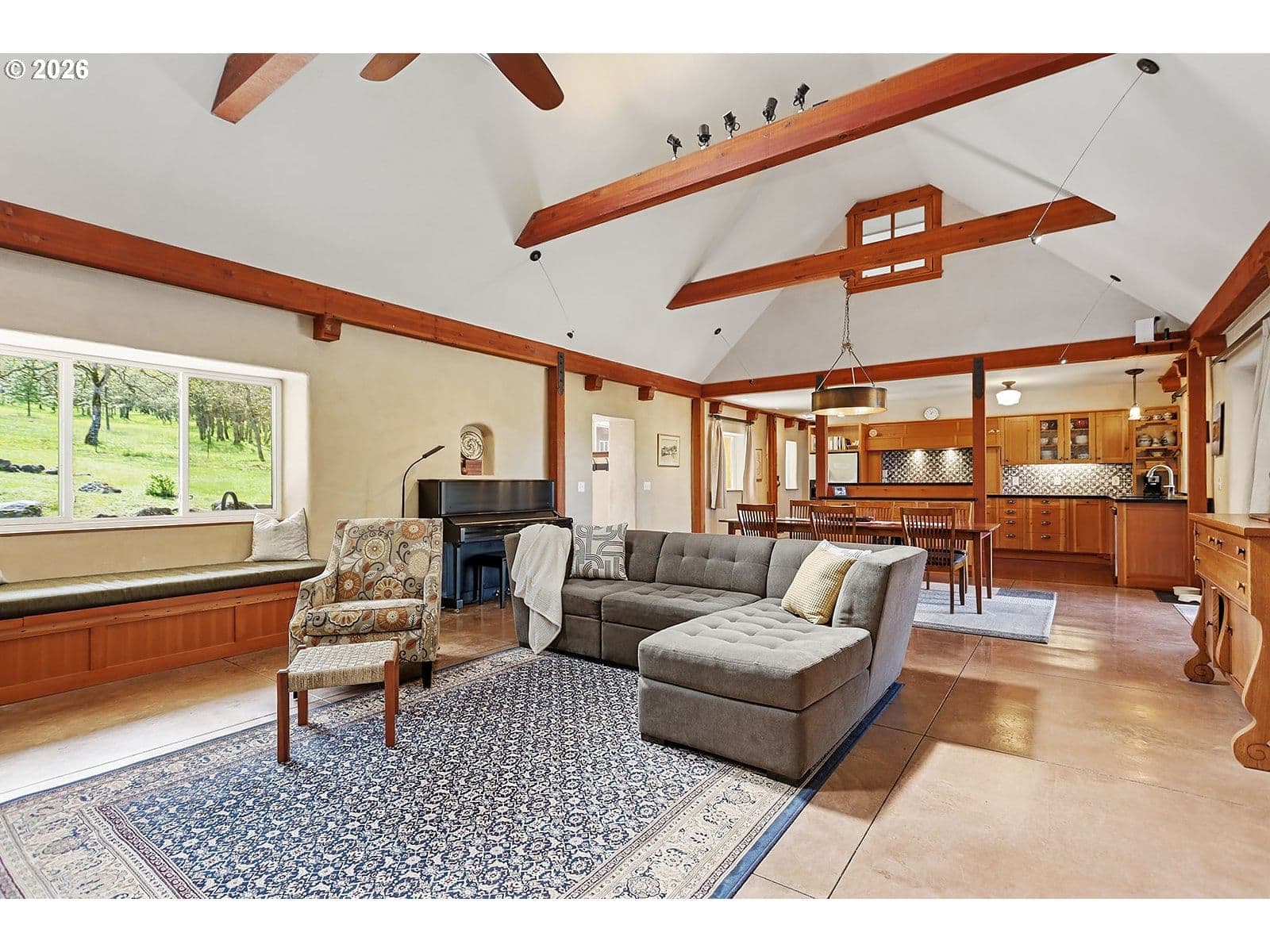 Custom Timber Frame, Green Home with unobstructed views of Mt. Adams located in Mosier, Oregon, on 6.37 acres. This 2,283 square foot residence features four bedrooms and three full bathrooms. The open floor plan offers a spacious great room with a vaulted ceiling and a floor-to-ceiling stone fireplace, as well as an open kitchen with paper stone countertops. Flooring is polished concrete and reclaimed wood, with radiant heating throughout. Twenty-nine solar panels provide most of the power for this fully electric home. Three bedrooms are situated on the main living floor, while the primary suite occupies the second floor. The house boasts custom wrought iron fixtures and schoolhouse lighting. Built in 2020, the 1,500 square foot garage has two car bays, a workshop and a recreation room. Adjacent to the home is a 250 square foot, sunny, detached heated studio with sink. Attached to the studio is a sauna and hot-water outdoor shower. The wrap-around covered porches offer outdoor entertainment opportunities. The grounds feature a fencedyard and irrigated gardens with raised beds, grapevines, berries, and fruit trees. Peaceful setting. The home has been featured multiple times on the Green & Solar Home Tour.