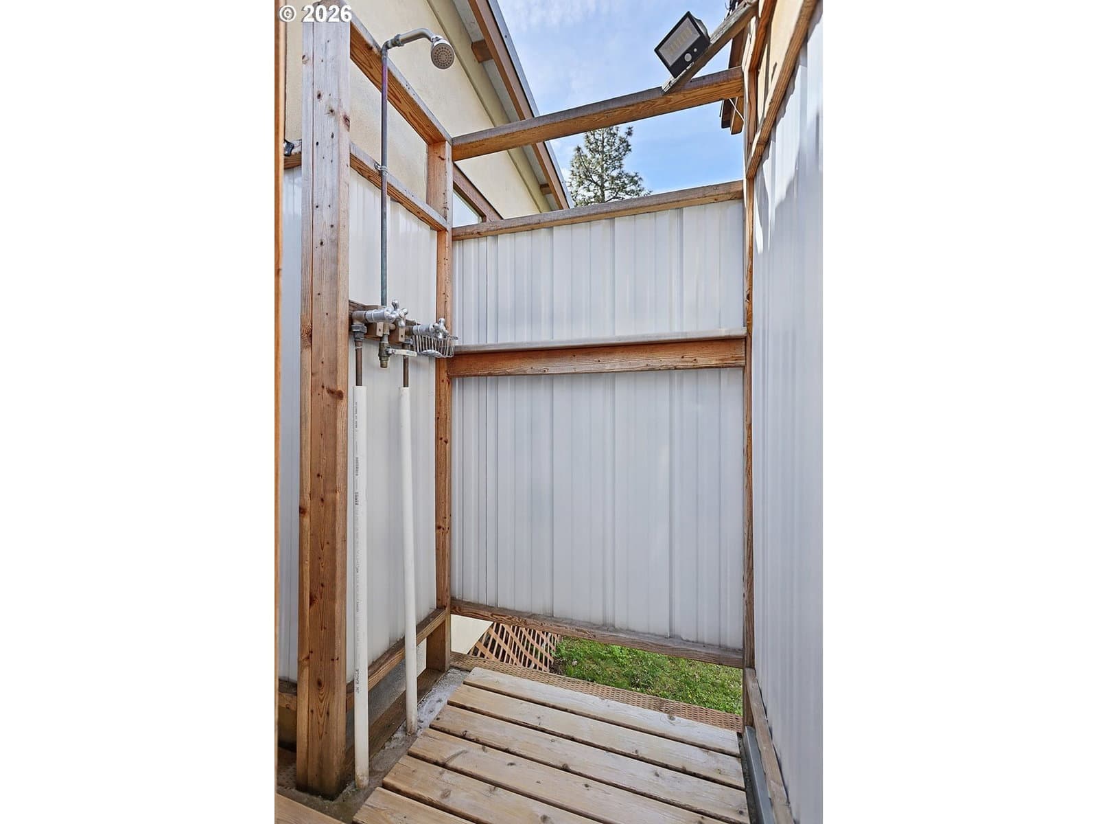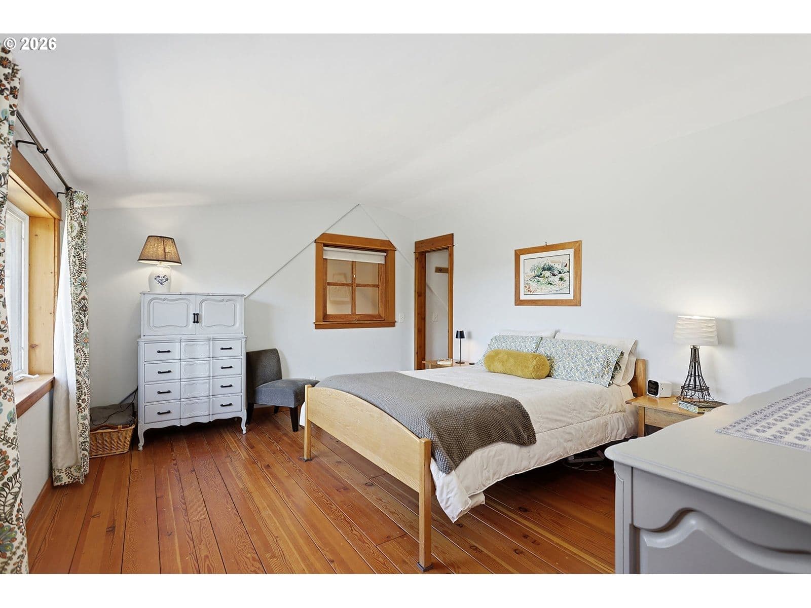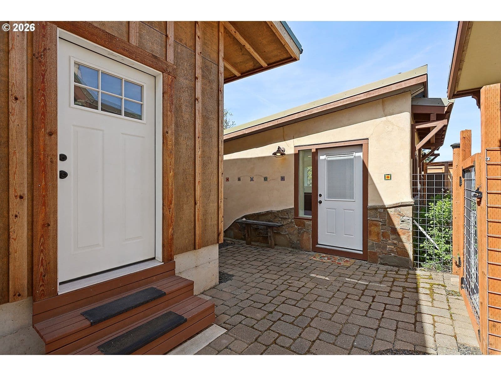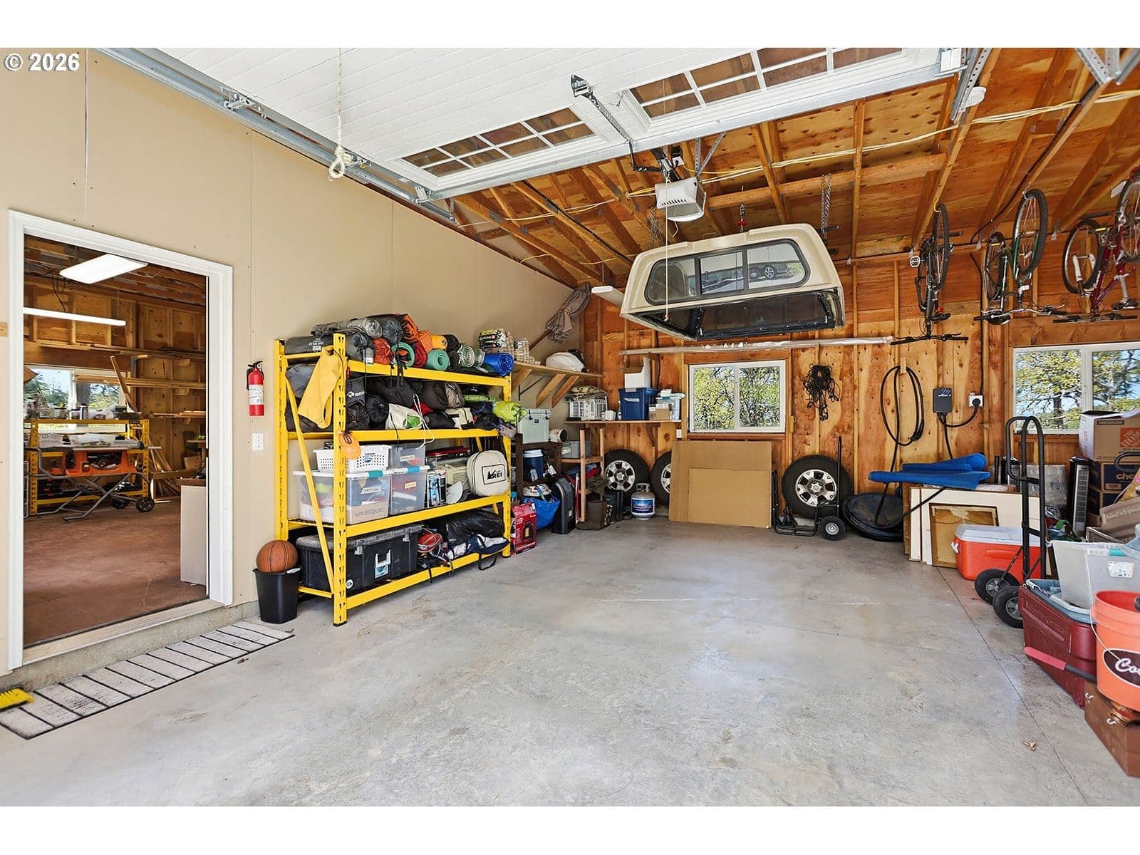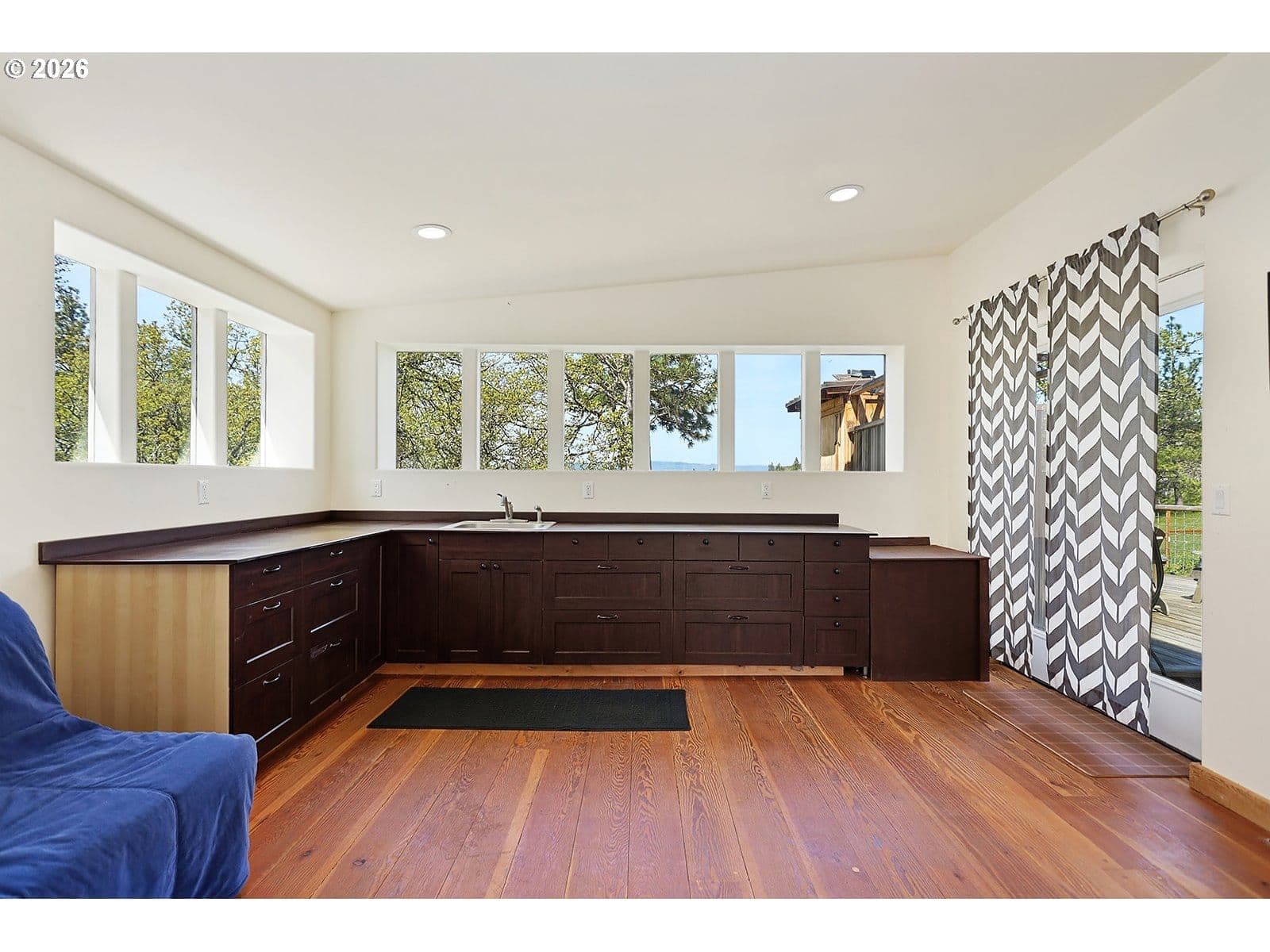 Custom Timber Frame, Green Home with unobstructed views of Mt. Adams located in Mosier, Oregon, on 6.37 acres. This 2,283 square foot residence features four bedrooms and three full bathrooms. The open floor plan offers a spacious great room with a vaulted ceiling and a floor-to-ceiling stone fireplace, as well as an open kitchen with paper stone countertops. Flooring is polished concrete and reclaimed wood, with radiant heating throughout. Twenty-nine solar panels provide most of the power for this fully electric home. Three bedrooms are situated on the main living floor, while the primary suite occupies the second floor. The house boasts custom wrought iron fixtures and schoolhouse lighting. Built in 2020, the 1,500 square foot garage has two car bays, a workshop and a recreation room. Adjacent to the home is a 250 square foot, sunny, detached heated studio with sink. Attached to the studio is a sauna and hot-water outdoor shower. The wrap-around covered porches offer outdoor entertainment opportunities. The grounds feature a fencedyard and irrigated gardens with raised beds, grapevines, berries, and fruit trees. Peaceful setting. The home has been featured multiple times on the Green & Solar Home Tour.