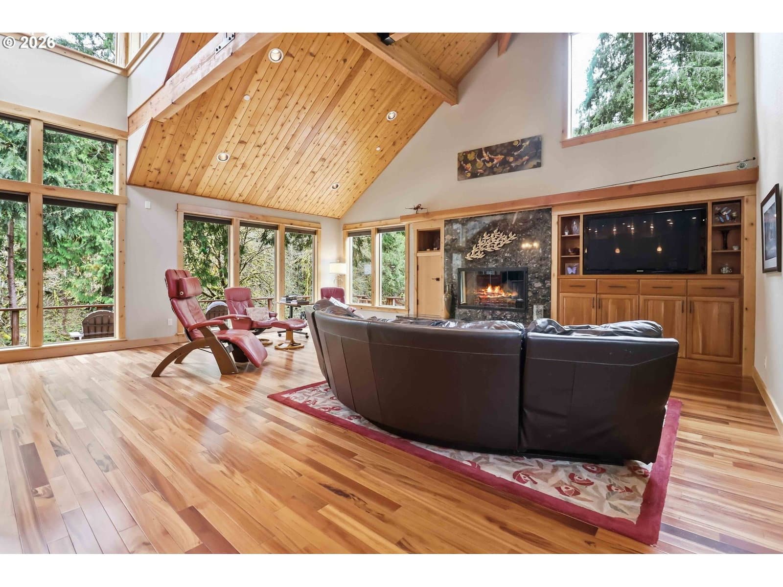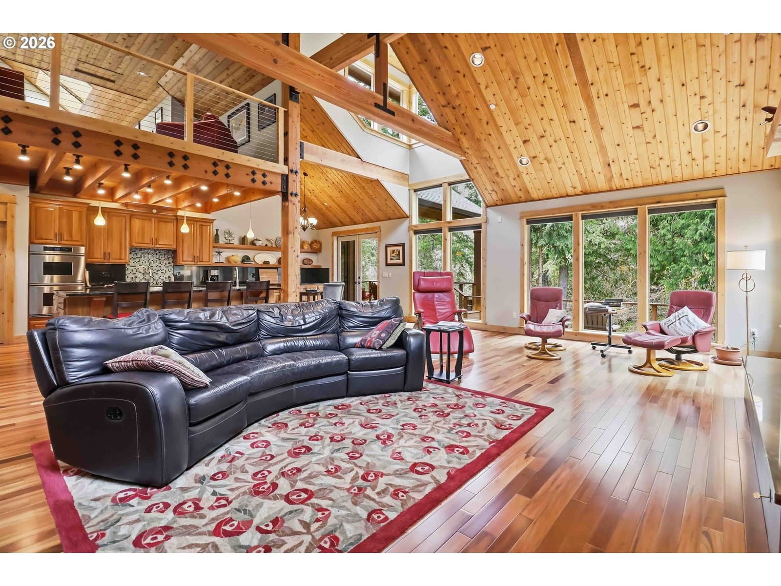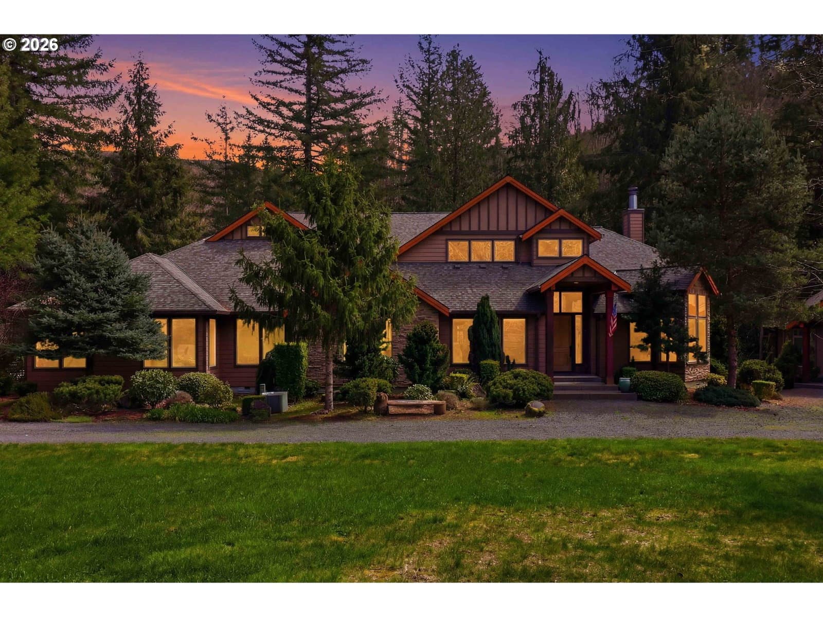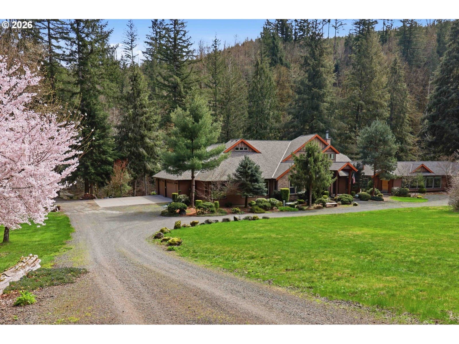 Experience exceptional riverfront living on the Kalama River. Situated on 2.76 private acres with approximately 620 feet of frontage, this 4,051 sq ft custom home offers 3 bedrooms and 4 bathrooms in a peaceful, natural setting just minutes from the well-known “Holy Waters” stretch. Inside, the home features Brazilian tigerwood floors, vaulted cedar-lined ceilings, exposed beams, and custom ironwork that bring out a strong Northwest feel with real craftsmanship throughout. Expansive windows take in river, territorial, and mountain views while bringing in natural light. The layout offers comfortable living spaces and multiple primary suites, making it easy to live in or host. Step outside to Trex decking overlooking the river and a natural waterfall, creating a private setting for relaxing or entertaining. The 1,502 sq ft detached pool house includes a heated indoor lap pool, 650-gallon jacuzzi, and 3/4 bath, set up for year-round use. Additional features include a 3-car garage, extra parking, RV space, high-speed fiber internet, and landscaped grounds with garden space and fruit trees. A unique opportunity to own a riverfront property with acreage and resort-style features in one of Southwest Washington’s most desirable areas.