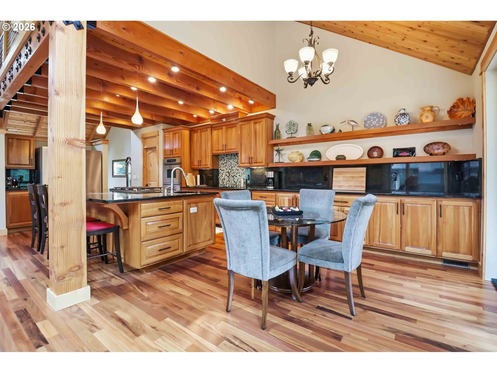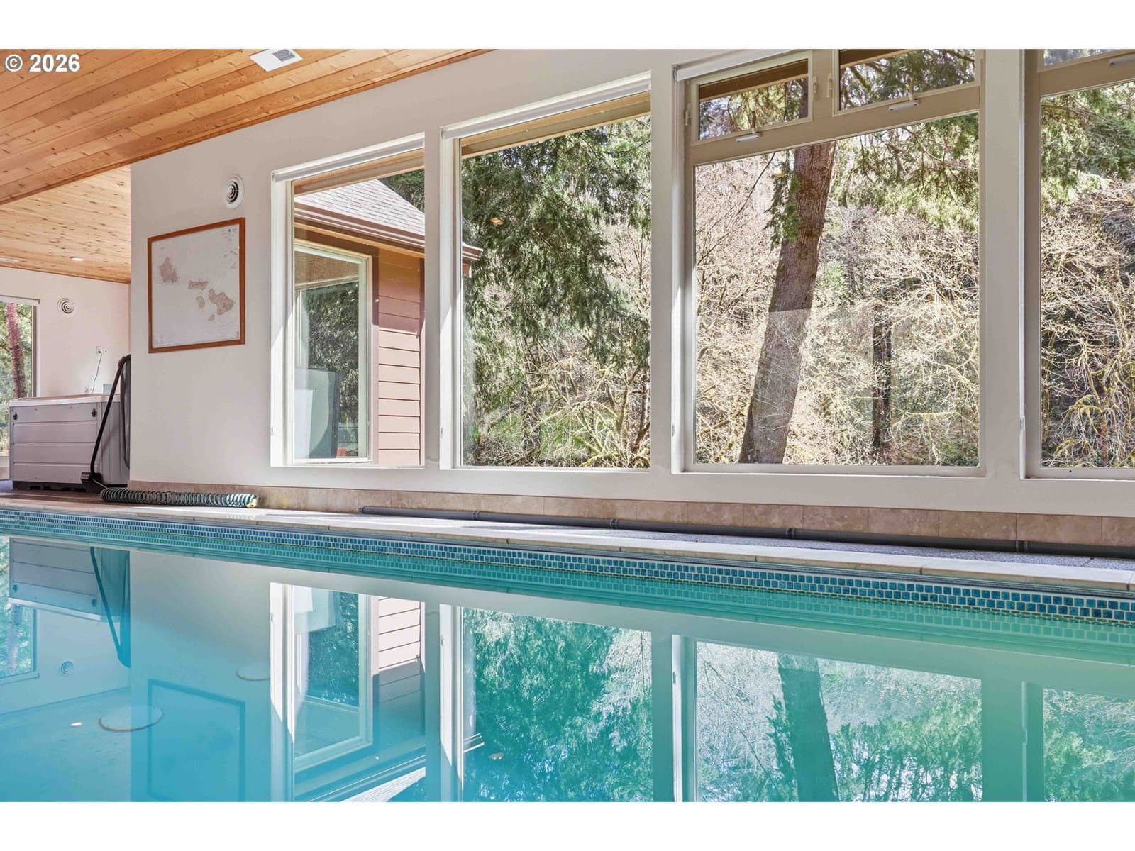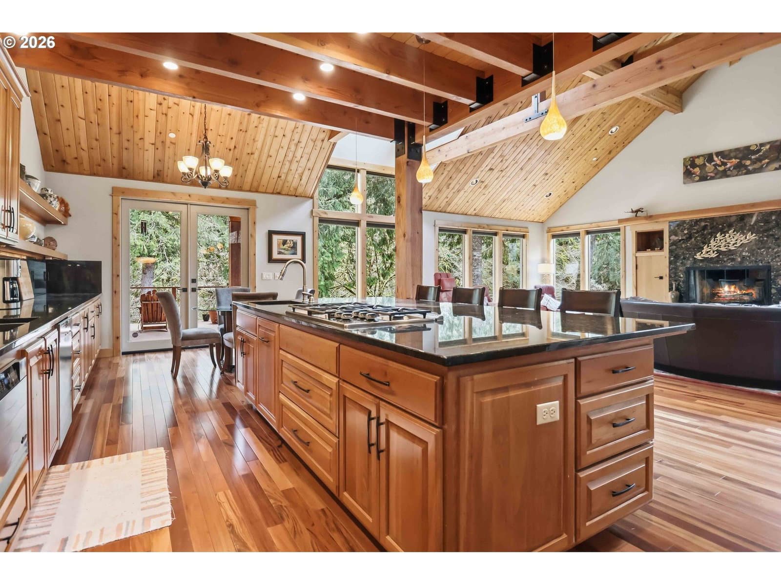 Experience exceptional riverfront living on the Kalama River. Situated on 2.76 private acres with approximately 620 feet of frontage, this 4,051 sq ft custom home offers 3 bedrooms and 4 bathrooms in a peaceful, natural setting just minutes from the well-known “Holy Waters” stretch. Inside, the home features Brazilian tigerwood floors, vaulted cedar-lined ceilings, exposed beams, and custom ironwork that bring out a strong Northwest feel with real craftsmanship throughout. Expansive windows take in river, territorial, and mountain views while bringing in natural light. The layout offers comfortable living spaces and multiple primary suites, making it easy to live in or host. Step outside to Trex decking overlooking the river and a natural waterfall, creating a private setting for relaxing or entertaining. The 1,502 sq ft detached pool house includes a heated indoor lap pool, 650-gallon jacuzzi, and 3/4 bath, set up for year-round use. Additional features include a 3-car garage, extra parking, RV space, high-speed fiber internet, and landscaped grounds with garden space and fruit trees. A unique opportunity to own a riverfront property with acreage and resort-style features in one of Southwest Washington’s most desirable areas.
