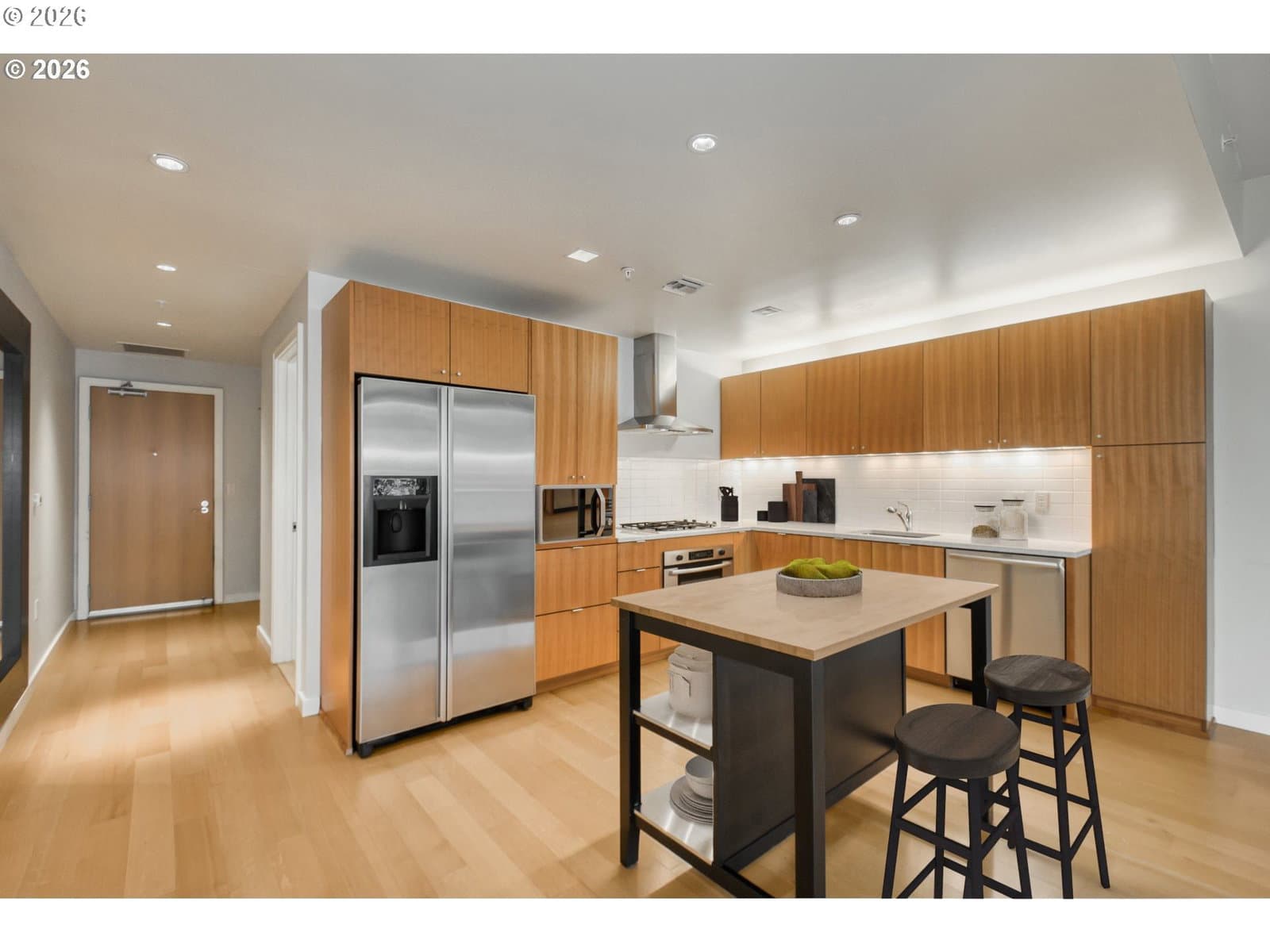 PRICED TO SELL! BANK FORECLOSURE. Sold AS-IS. Investor special. An excellent opportunity to own in the desirable Meriwether. This thoughtfully designed floor plan maximizes space and natural light, featuring hardwood floors, large windows, a spacious primary bedroom with walk-in closet, an inviting open kitchen and living area, a separate laundry room, and a covered balcony overlooking the scenic West Hills & Willamette River. The home includes stainless steel appliances, abundant in-unit storage, washer and dryer, and one deeded parking space. Enjoy the best of riverfront living with easy access to restaurants, cafes, shops, parks, greenbelts, trails, the farmers market, OHSU, and the Streetcar just steps away. HOA amenities include 24/7 concierge service, private guest parking, a rental guest suite, and kayak and bike storage. Located in a well-established community offering both comfort and convenience in a prime Portland location. Buyer to do all due diligence.