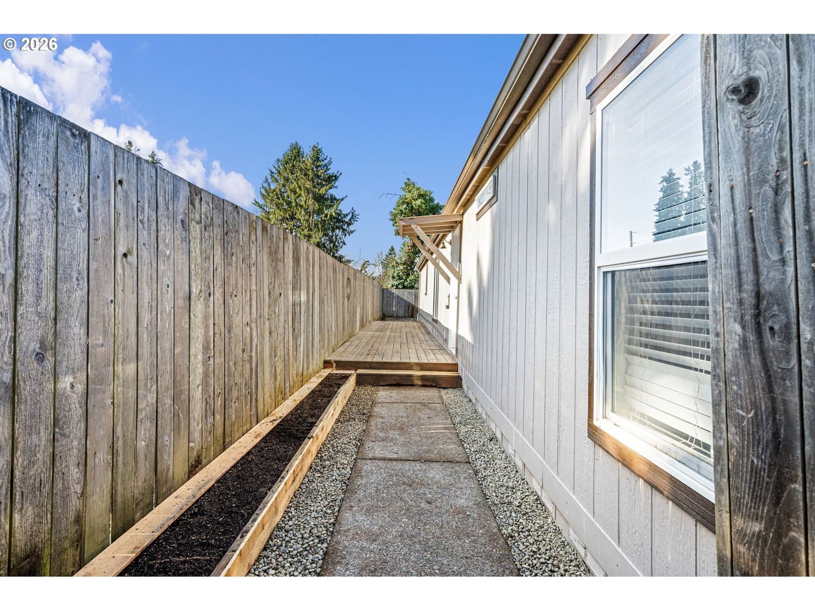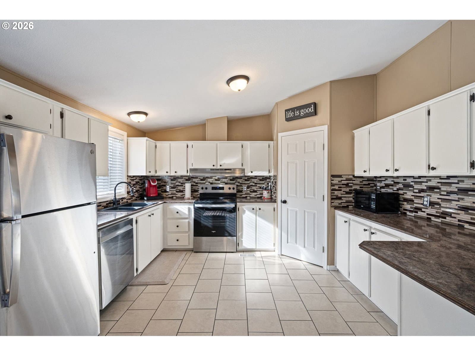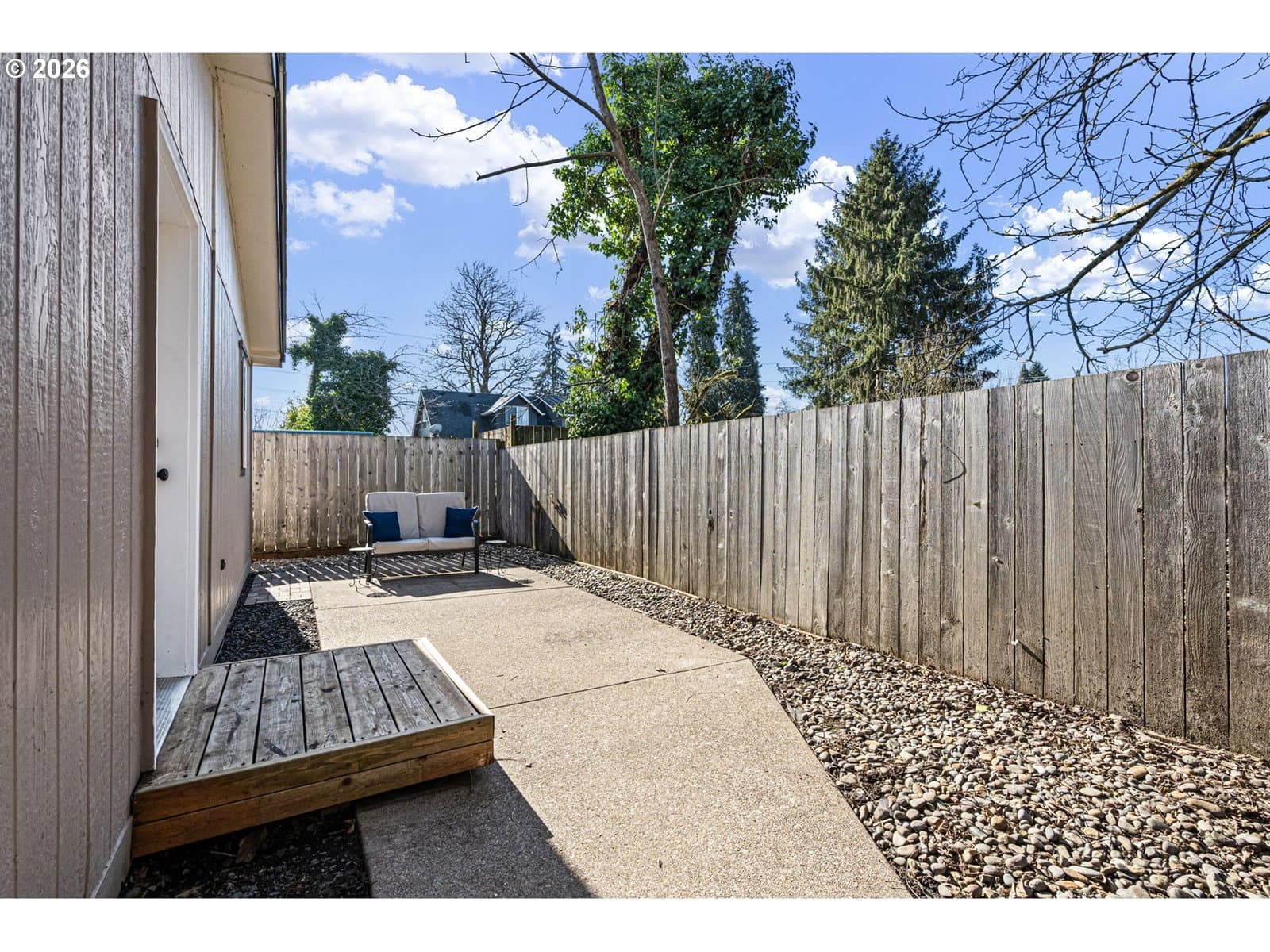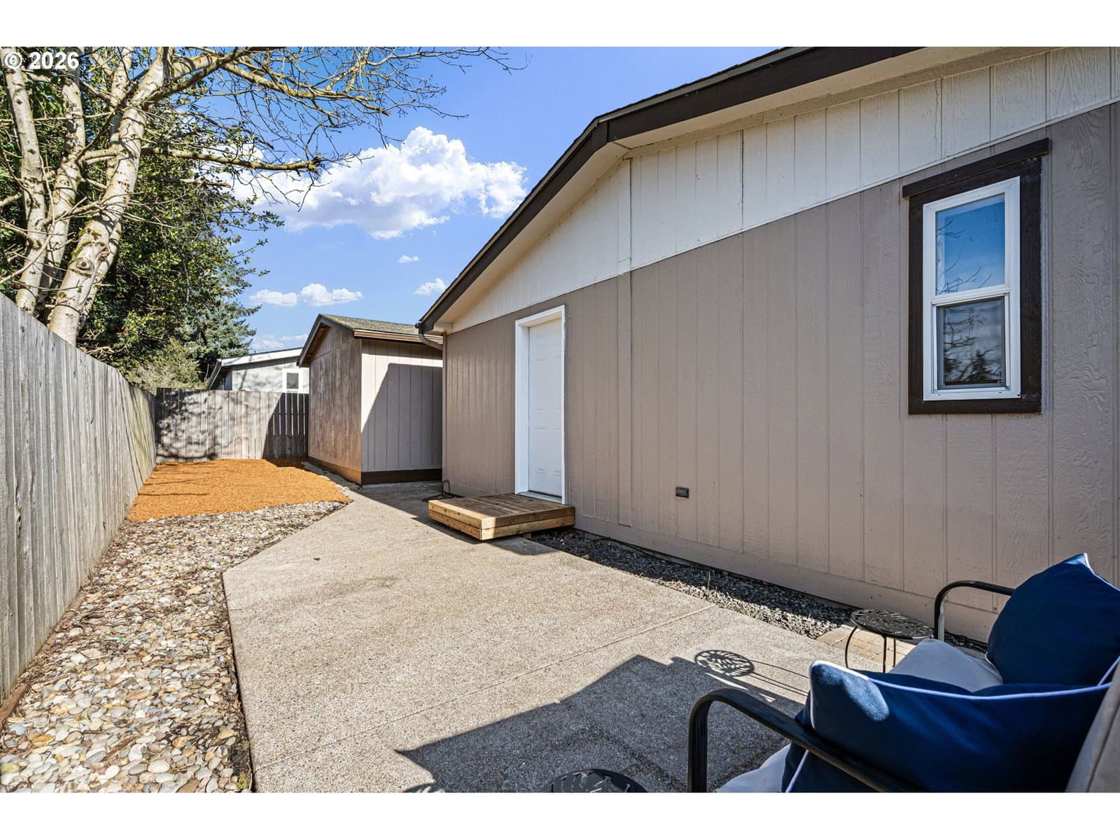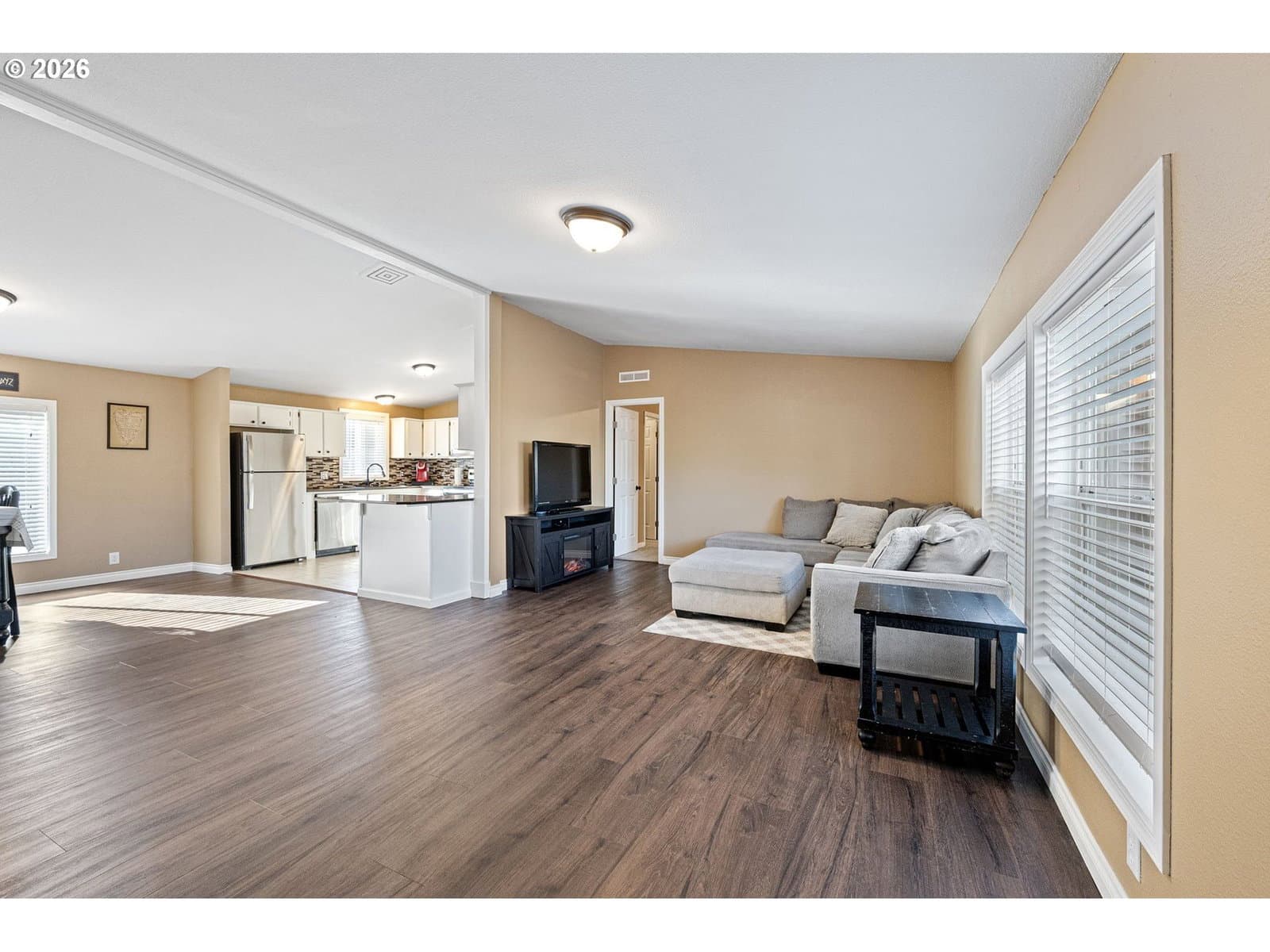 Welcome home to this comfortable, well-cared-for property tucked into a friendly neighborhood. The open floor plan and tall ceilings create a bright airy atmosphere throughout the home—perfect for both everyday living and entertaining. Just off the main living area is a flexible family room that works beautifully as a den, office, or extra hangout space. The kitchen flows into the living areas and features tons of counter space, a huge pantry, and all appliances included—perfect for everyday meals, homework time, or casual entertaining. The living room is cozy and inviting with an included TV stand and electric fireplace that adds both warmth and ambiance, while forced-air heating keeps the home comfortable year-round. Newer laminate flooring runs through the main living spaces, with nearly new carpet in the bedrooms. The spacious primary bedroom offers a large walk-in closet and direct access to the backyard patio—an easy way to step outside and unwind. Fresh paint throughout gives the home a clean, move-in-ready feel. The fully fenced backyard provides privacy and flexibility, with a low-maintenance yard, back deck and convenient garden bed just waiting for your veggie starts. FHA financing is welcome, and the home has been earthquake strapped—helping make the lending process smooth and stress-free. Tucked into a quiet cul-de-sac, the home enjoys minimal traffic and a strong sense of community. The driveway and side parking together can accommodate up to six vehicles—making it easy to host friends and family. With Madison Middle School, the newly opened Santa Clara Community Park, shopping, bus lines, grocery stores, and easy access to Junction City via River Road nearby, this location is ideal for convenient everyday living.