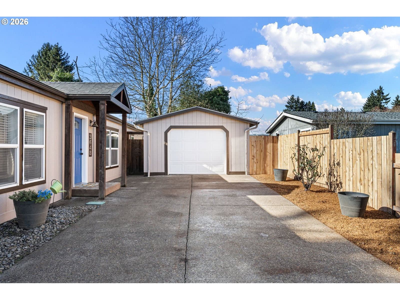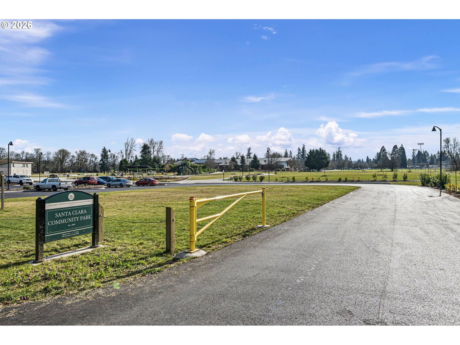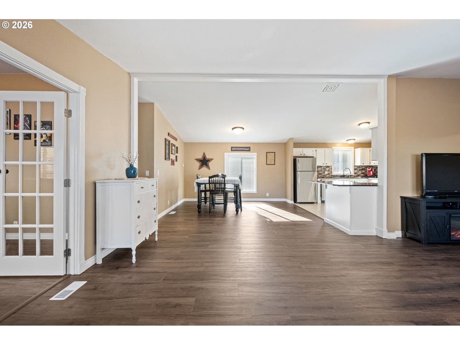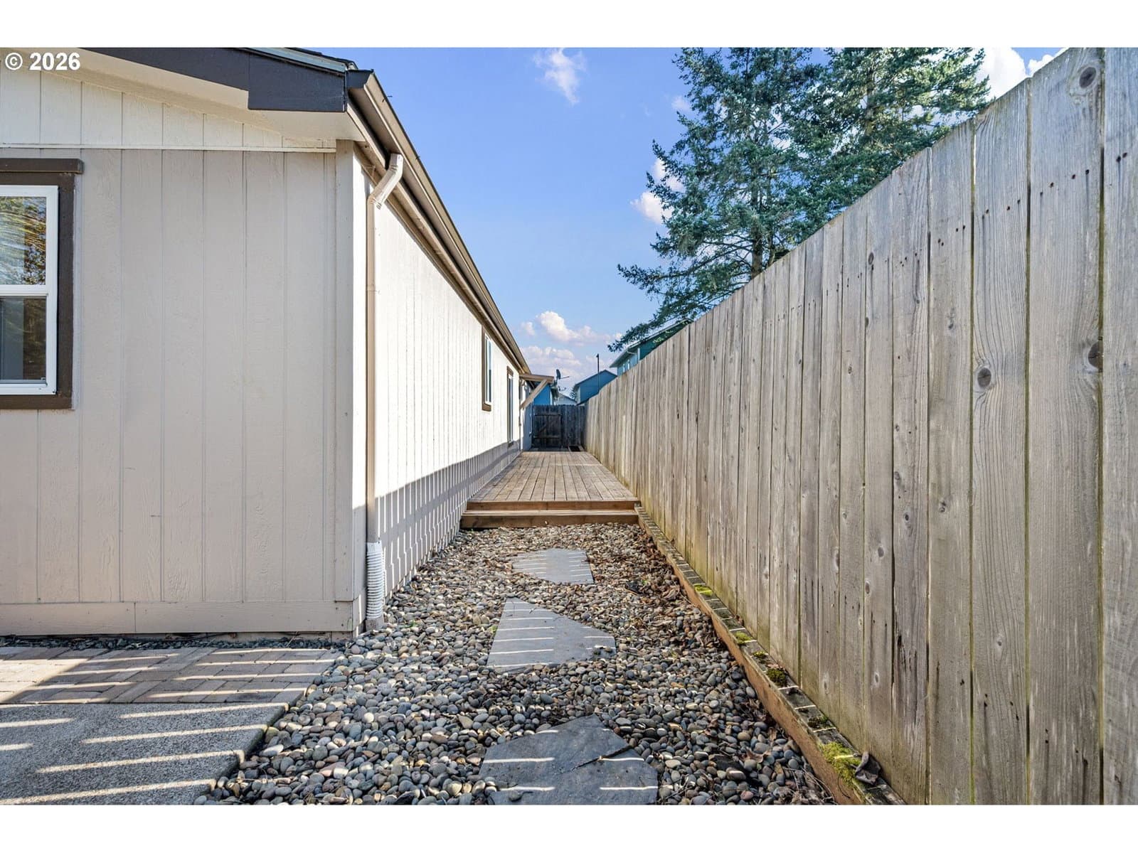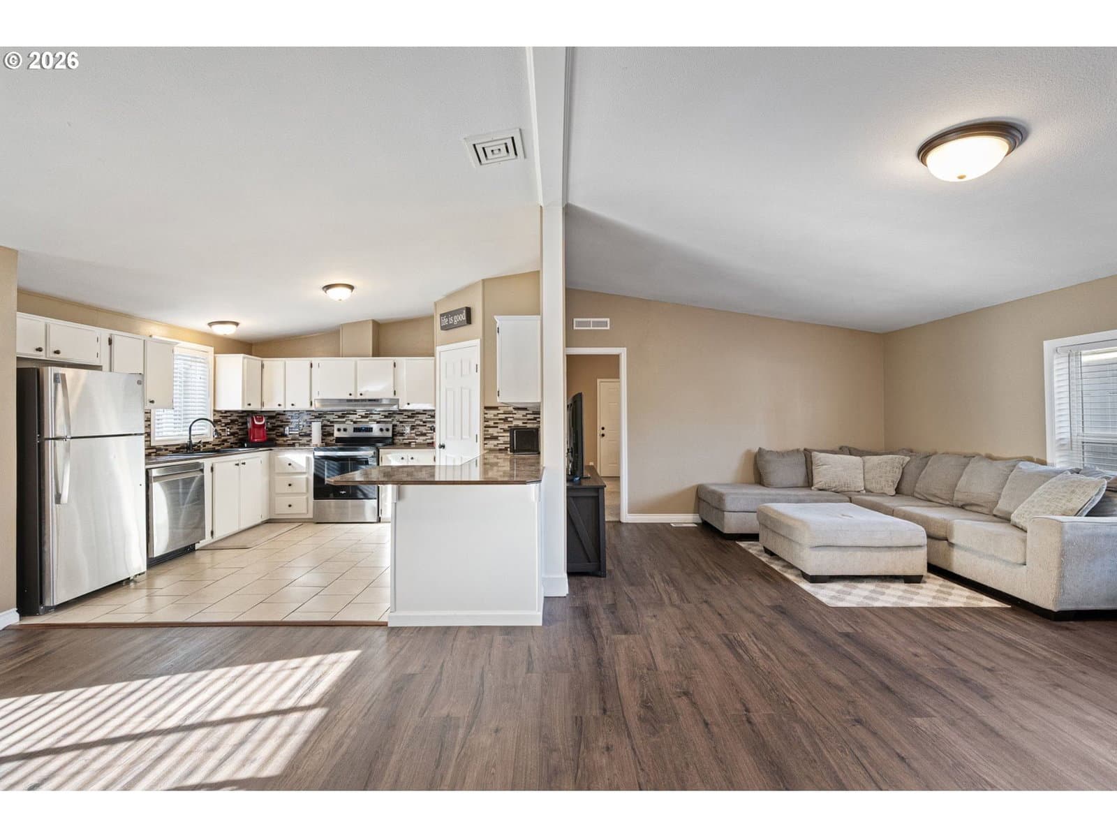Welcome home to this comfortable, well-cared-for property tucked into a friendly neighborhood. The open floor plan and tall ceilings create a bright airy atmosphere throughout the home—perfect for both everyday living and entertaining. Just off the main living area is a flexible family room that works beautifully as a den, office, or extra hangout space. The kitchen flows into the living areas and features tons of counter space, a huge pantry, and all appliances included—perfect for everyday meals, homework time, or casual entertaining. The living room is cozy and inviting with an included TV stand and electric fireplace that adds both warmth and ambiance, while forced-air heating keeps the home comfortable year-round. Newer laminate flooring runs through the main living spaces, with nearly new carpet in the bedrooms. The spacious primary bedroom offers a large walk-in closet and direct access to the backyard patio—an easy way to step outside and unwind. Fresh paint throughout gives the home a clean, move-in-ready feel. The fully fenced backyard provides privacy and flexibility, with a low-maintenance yard, back deck and convenient garden bed just waiting for your veggie starts. FHA financing is welcome, and the home has been earthquake strapped—helping make the lending process smooth and stress-free. Tucked into a quiet cul-de-sac, the home enjoys minimal traffic and a strong sense of community. The driveway and side parking together can accommodate up to six vehicles—making it easy to host friends and family. With Madison Middle School, the newly opened Santa Clara Community Park, shopping, bus lines, grocery stores, and easy access to Junction City via River Road nearby, this location is ideal for convenient everyday living.
