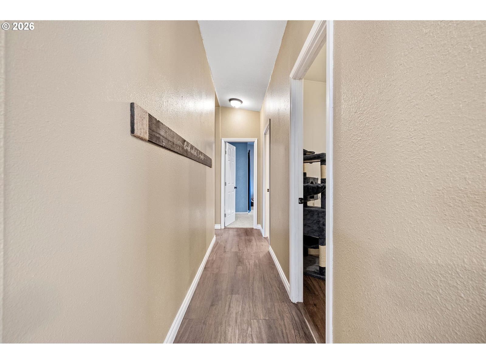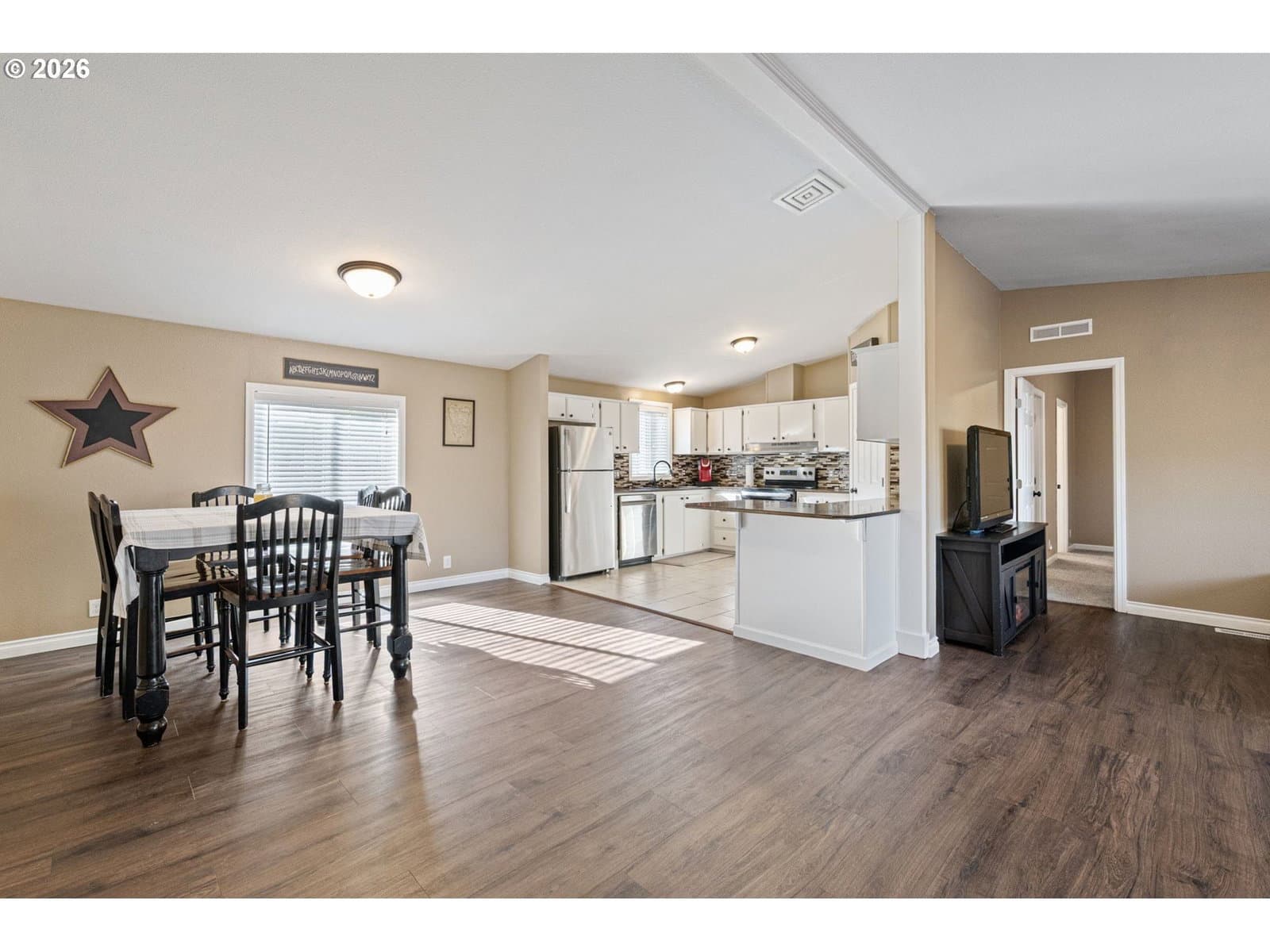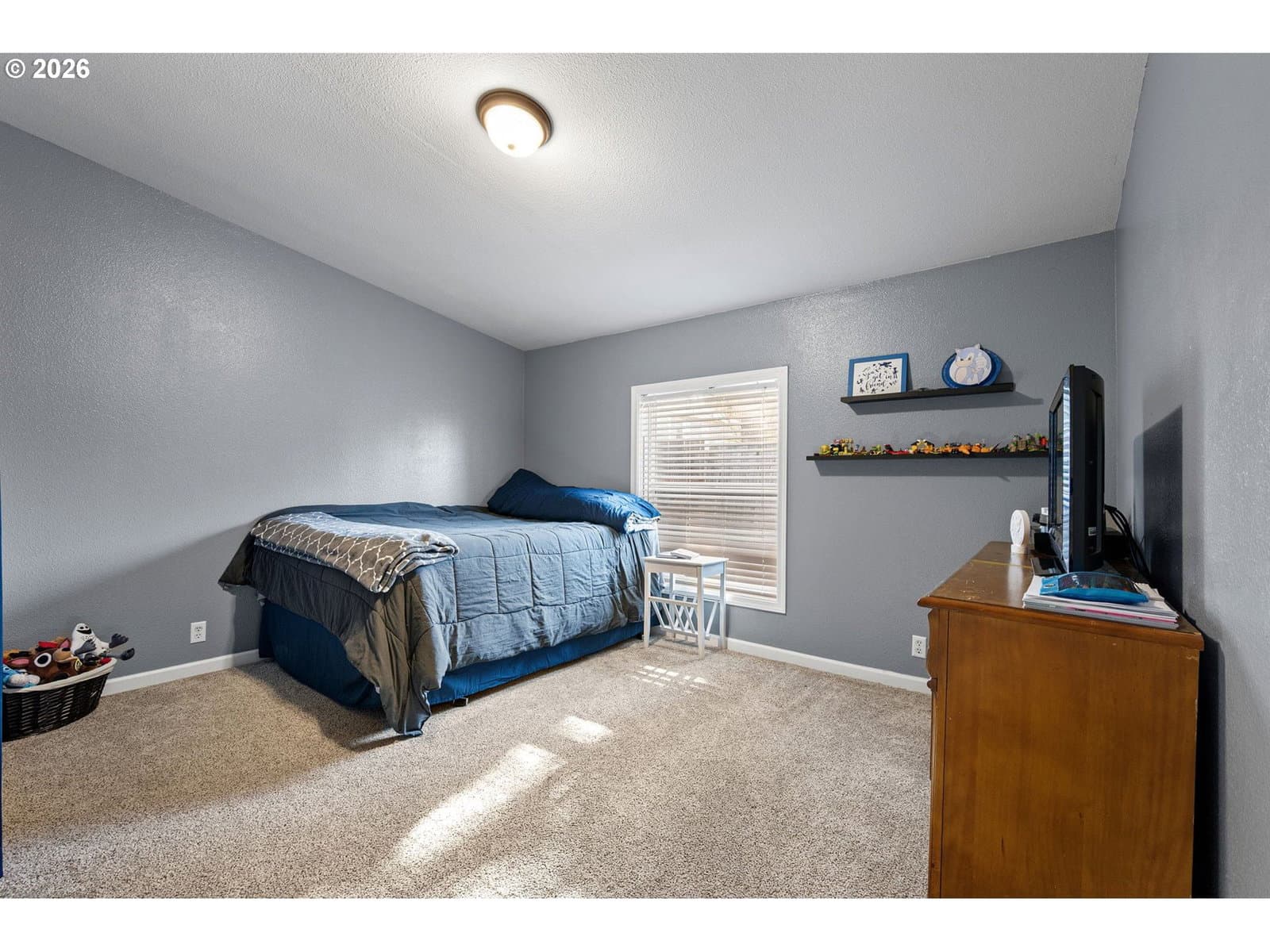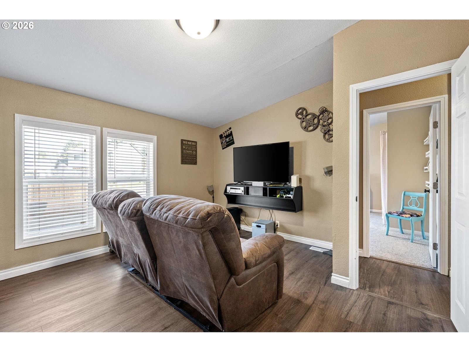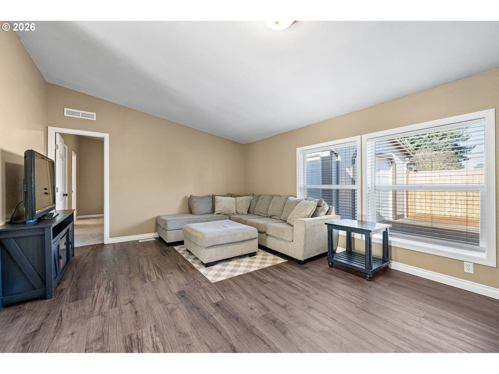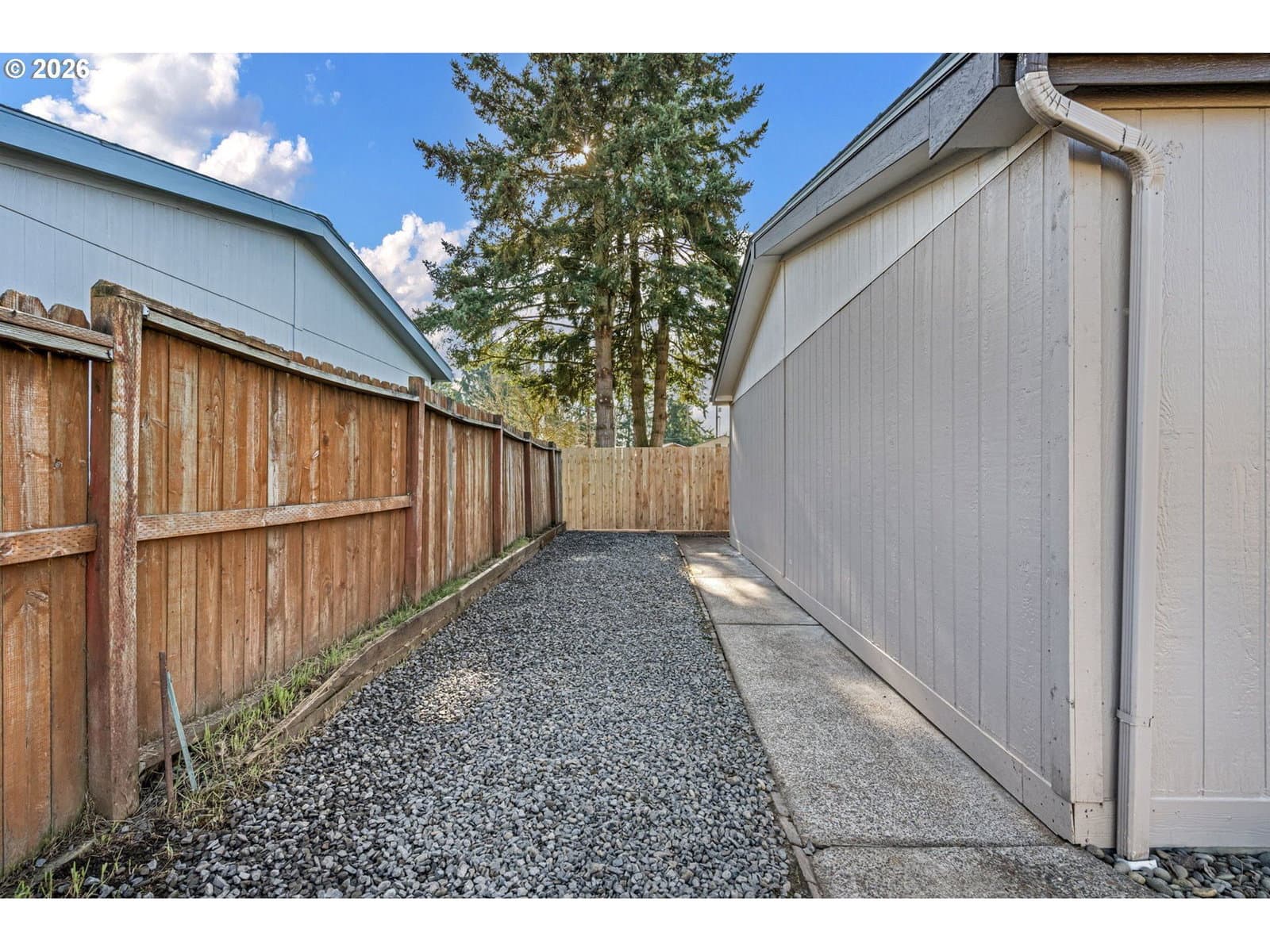 Welcome home to this comfortable, well-cared-for property tucked into a friendly neighborhood. The open floor plan and tall ceilings create a bright airy atmosphere throughout the home—perfect for both everyday living and entertaining. Just off the main living area is a flexible family room that works beautifully as a den, office, or extra hangout space. The kitchen flows into the living areas and features tons of counter space, a huge pantry, and all appliances included—perfect for everyday meals, homework time, or casual entertaining. The living room is cozy and inviting with an included TV stand and electric fireplace that adds both warmth and ambiance, while forced-air heating keeps the home comfortable year-round. Newer laminate flooring runs through the main living spaces, with nearly new carpet in the bedrooms. The spacious primary bedroom offers a large walk-in closet and direct access to the backyard patio—an easy way to step outside and unwind. Fresh paint throughout gives the home a clean, move-in-ready feel. The fully fenced backyard provides privacy and flexibility, with a low-maintenance yard, back deck and convenient garden bed just waiting for your veggie starts. FHA financing is welcome, and the home has been earthquake strapped—helping make the lending process smooth and stress-free. Tucked into a quiet cul-de-sac, the home enjoys minimal traffic and a strong sense of community. The driveway and side parking together can accommodate up to six vehicles—making it easy to host friends and family. With Madison Middle School, the newly opened Santa Clara Community Park, shopping, bus lines, grocery stores, and easy access to Junction City via River Road nearby, this location is ideal for convenient everyday living.