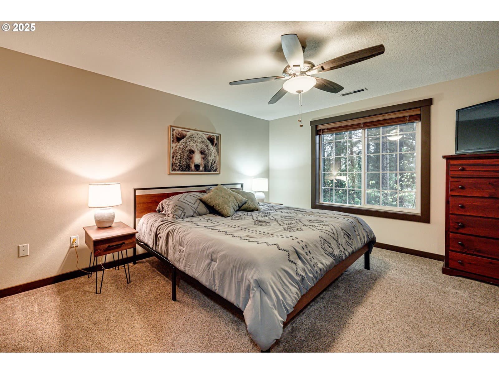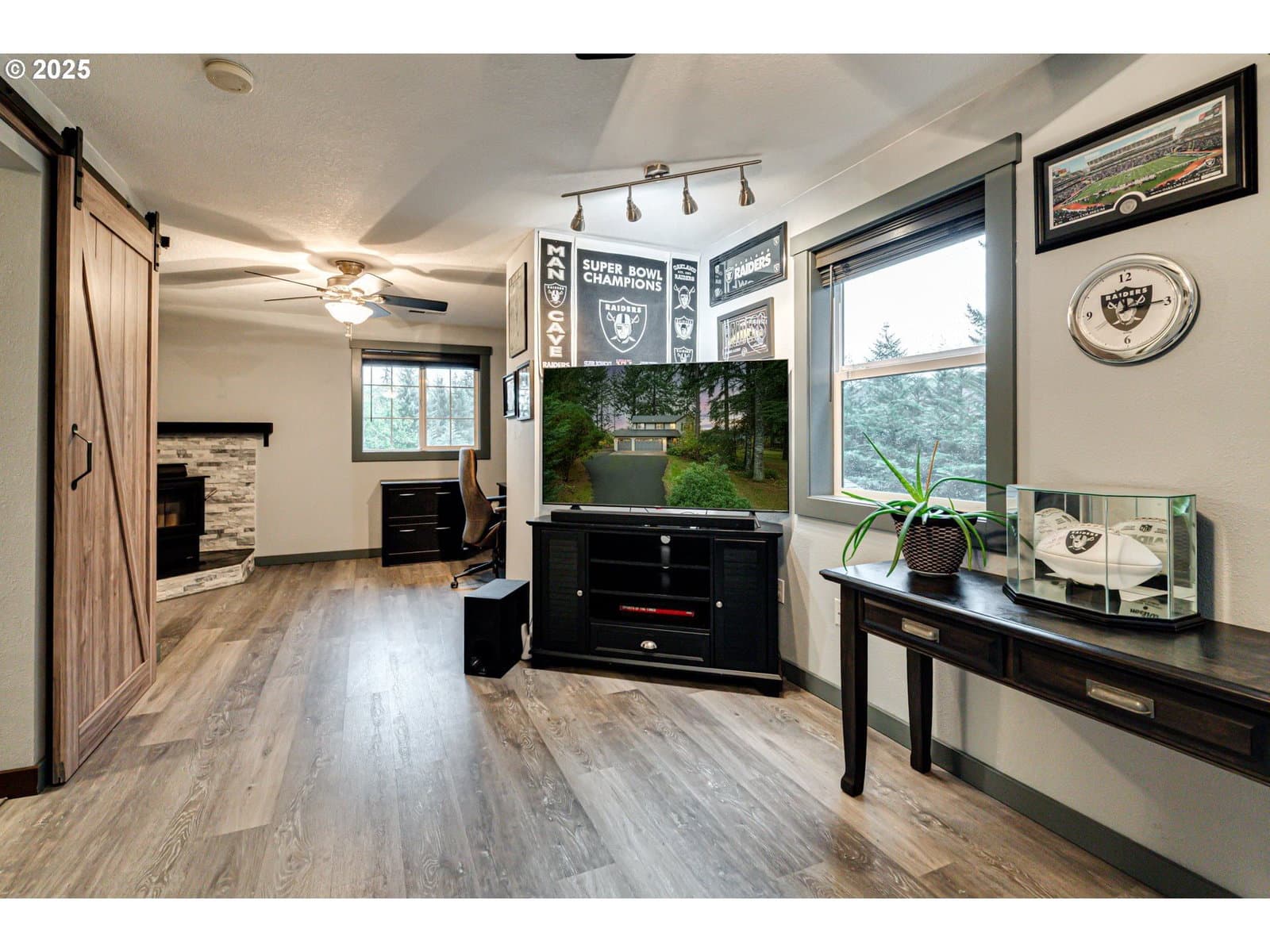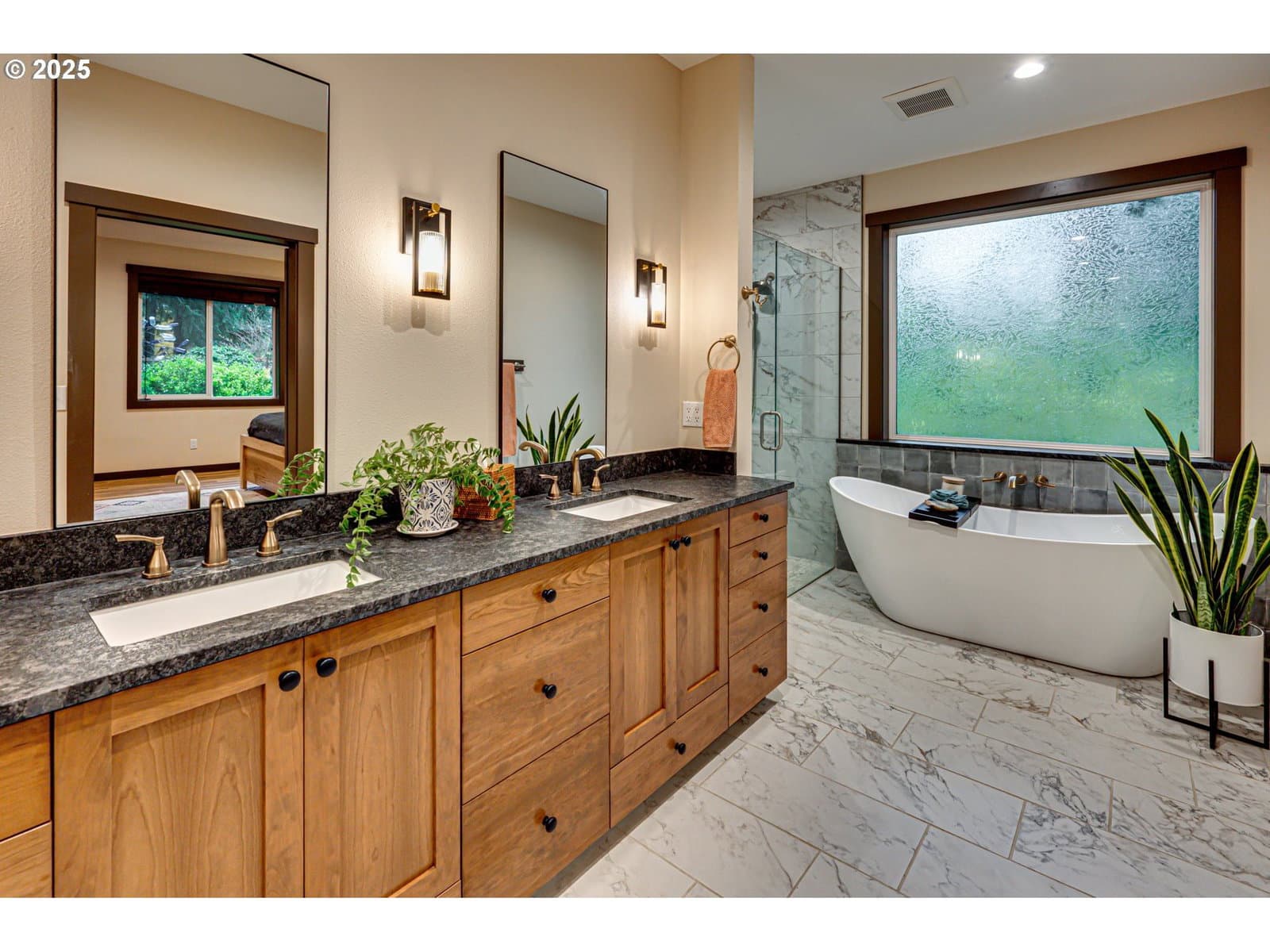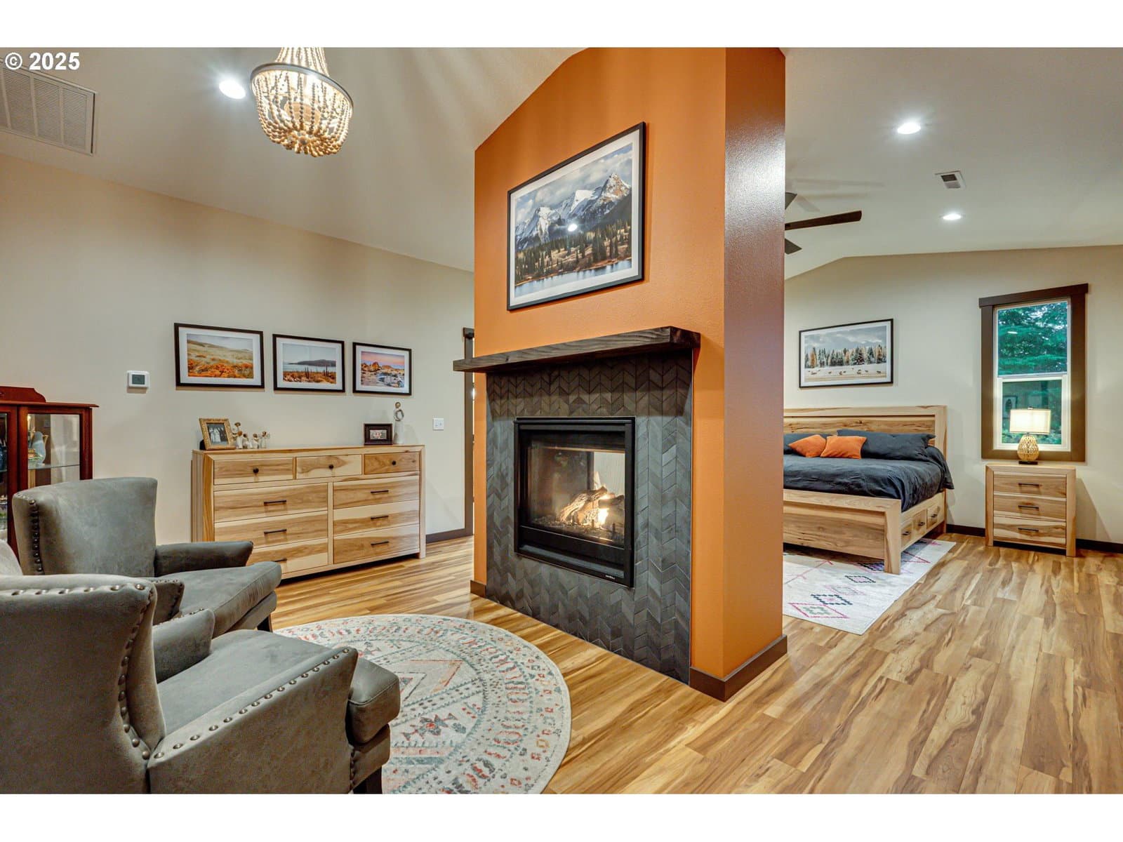 Welcome home! Beautifully maintained private acreage property with an open floor plan, LVP flooring, granite counters, and custom cabinets. The kitchen features stainless Frigidaire double ovens, convection microwave, and a farmhouse sink. Huge main-floor primary suite addition completed in 2023 with vaulted ceilings, dual-sided fireplace, heated tile floors, freestanding tub, and curbless shower. Upstairs offers four more bedrooms, including a second ensuite. Outside, enjoy the oversized covered patio, covered BBQ area, organic deer-proof gardens, 3-car garage, private well, and generator plug. Just 15 min to Battleground, and 40 minutes to PDX.