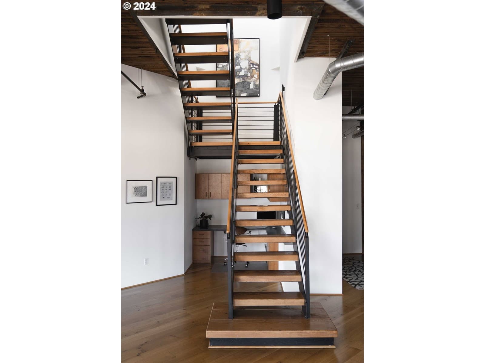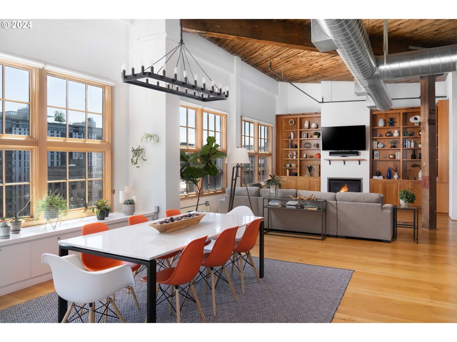 PRICE REDUCED $100,000!! Designed by Daniel Hudson Burnham, architect of New York’s Flatiron Building, the Marshall Wells Building remains one of the Pearl District’s most iconic addresses. This penthouse loft occupies the coveted northeast corner of the top floor. 14-foot ceilings and walls of windows frame Mt. Hood, the Steel, Broadway, and Fremont bridges, the skyline, and the Moda Center. Exposed brick and original timber beams anchor the space in its industrial past. A 2018 HVAC overhaul introduced a three-speed system, programmable thermostat, and refined ductwork, reducing energy costs. The primary bath was reimagined with heated tile floors, a soaking tub, and an expanded layout. The kitchen features upgraded appliances and under-cabinet LED lighting. Two garage parking spaces and an oversized storage unit with direct access offer rare convenience in the Pearl. Streetcar, galleries, parks, and coffee just outside. 3D tour and floorplan in photos.