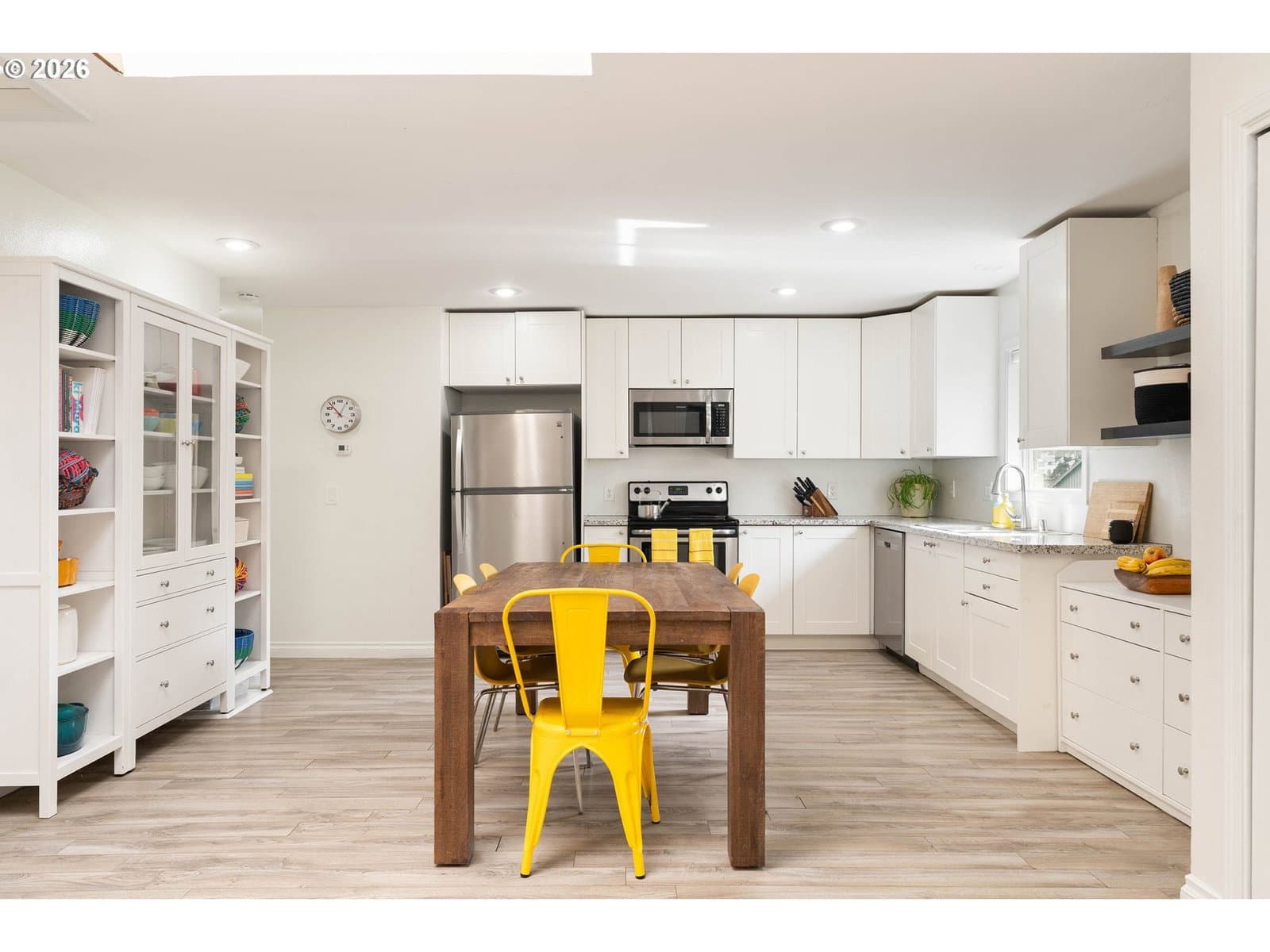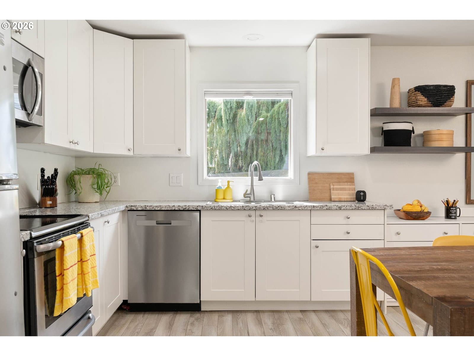 Joyful Mid-Century Ranch Filled with Light & Garden Magic-This sweet single-level home radiates warmth, character, and sunshine at every turn. Bathed in natural light, the expansive kitchen is truly the heart of the home — perfect for lively dinner parties and cozy brunches under the skylight. The inviting living space is NW cozy with an electric fireplace for effortless ambiance, while the flexible primary retreat offers peaceful garden views with room to create your ideal sanctuary — whether that’s a restful escape, reading nook, or inspiring home office.Step outside and discover a four-season garden full of surprises that changes beautifully throughout the year. A large free-standing garage and ample off-street parking add convenience and flexibility. 2025 updates include: new dishwasher, washing machine, and microwave; new flooring in all bedrooms; new sliding glass door; new fireplace insert and fresh exterior paint.Ideally located near Elk Rock, the Willamette River, Tryon Creek State Natural Area, and the charming community activities of Downtown Milwaukie. MAX Light Rail just two blocks away. Don’t miss out on everyday ease with weekend adventures right outside your door.