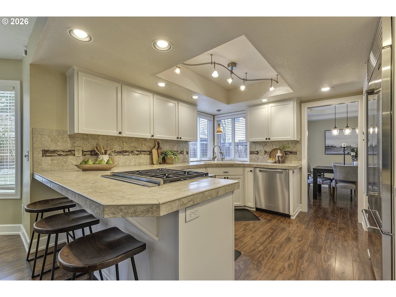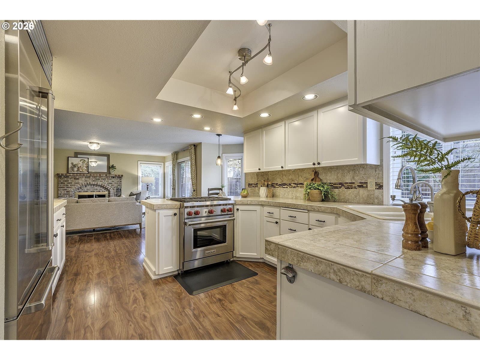 This beautiful 4-bdrm home is located on a cul-de-sac, in a sought-after neighborhood. Traditional floor plan features vaulted ceilings, large windows & architectural details. Thoughtful updates, an oversized garage & spacious backyard provide comfort & functionality. Living room w/fireplace opens to formal dining room. Kitchen w/eating bar & walk-in pantry is updated w/premium applcs including Sub-Zero refrigerator (2022), Wolf gas range (2021) & Miele dishwasher (2024). Dining nook has bay window & opens to family room w/brick fireplace & slider to backyard. Primary suite features double closets, (one is walk-in), & updated bathroom w/quartz cntrtps, dual sinks, tiled shower & free-standing tub. Fenced backyard has covered patio (2023), raised beds & sprinklers. 3-car garage. Ring doorbell. Simply safe alarm. Washer & dryer included. Gas water heater & gas furnace (2024). AC (2022). Located near schools, Jurgens park, shopping, dining & commuter transportation.