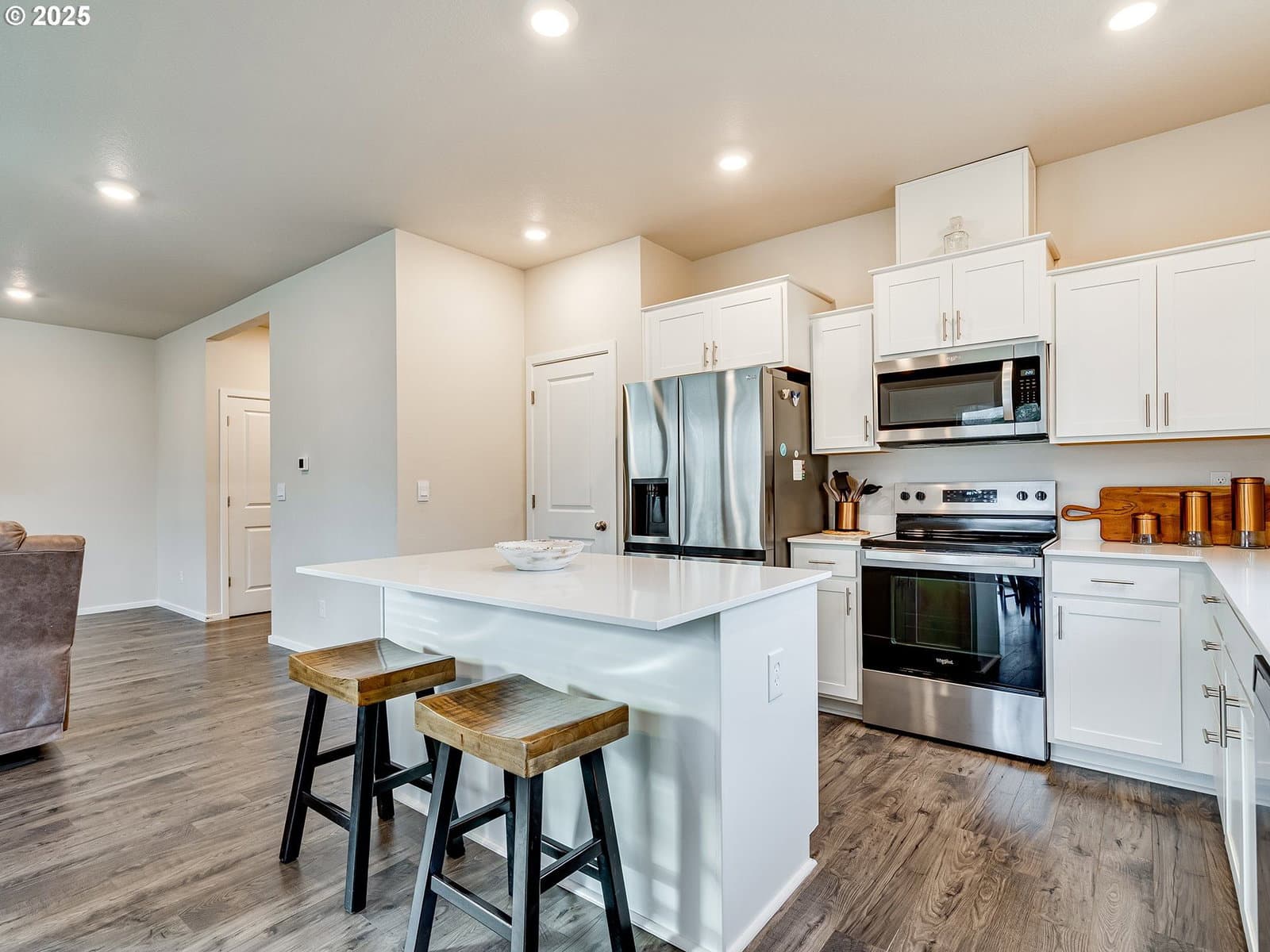 Welcome to this inviting, recently-built home where comfort meets convenience. The heart of the home is the spacious kitchen, featuring a large island ideal for entertaining, abundant counter space, bright cabinets, and a walk-in pantry. The living room feels expansive, with high ceilings and large windows streaming tons of natural light. The main floor also offers a versatile flex room that could be perfect as a home office, playroom, or cozy reading nook. Upstairs, there are 4 bedrooms including a full size bathroom and thoughtfully located laundry room. The primary bedroom includes a beautiful ensuite with quartz countertops, double sinks, walk-in shower and large walk-in closet. Step outside to enjoy a private patio overlooking a serene natural setting with mature trees and views of the neighboring farm. Perfectly situated near shopping, dining, minutes from PDX, and less than one hour from Timberline Lodge. Don't miss the chance to make this home yours!