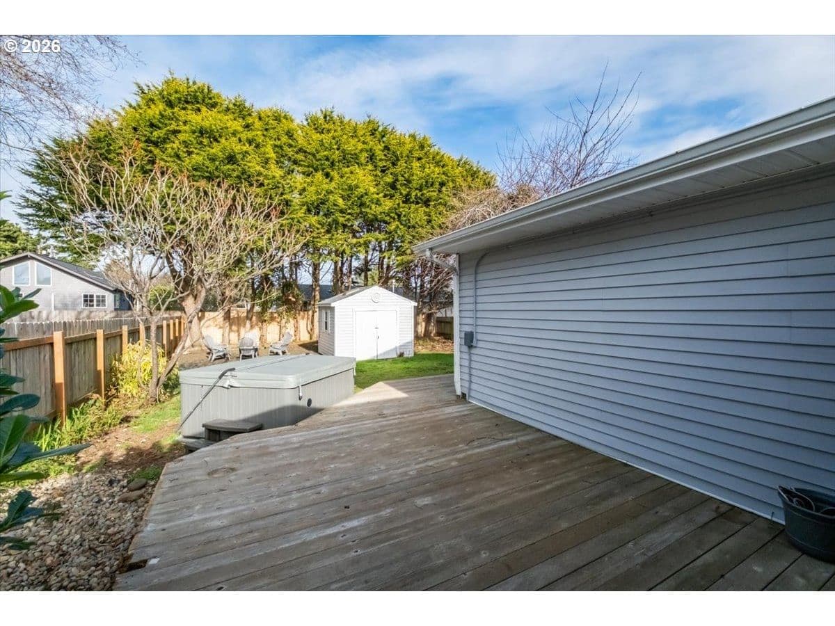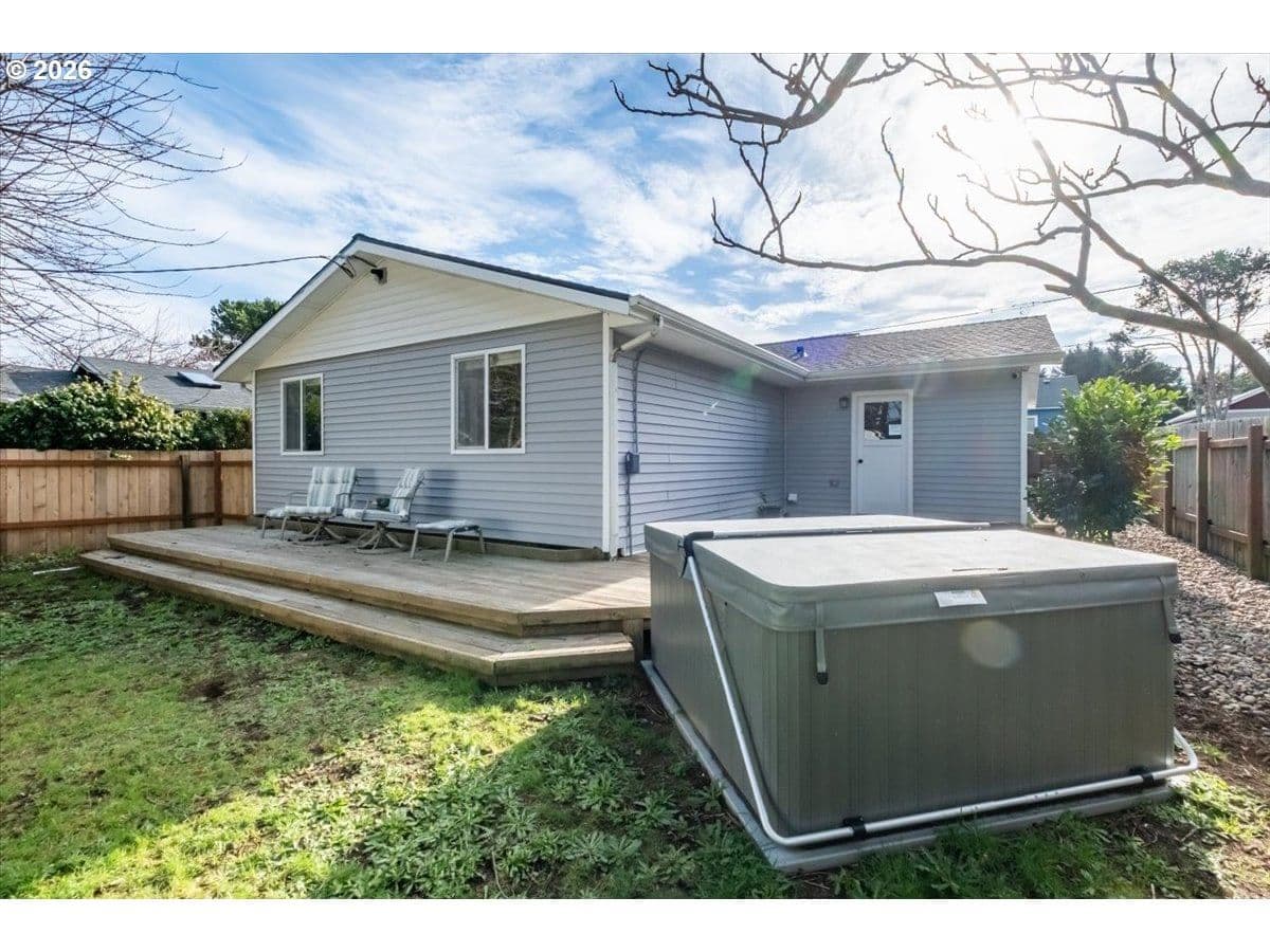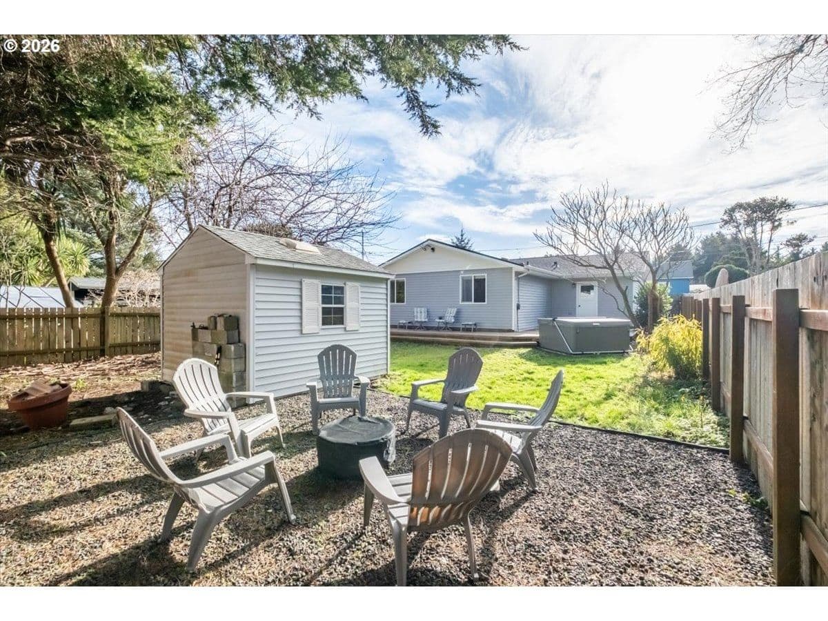 Completely remodeled three-bedroom beach house—welcome to your dream retreat on the stunning Oregon Coast. Ideal as a primary residence, second home, or long-term rental, this beautifully updated single-level home is located just blocks from the sandy shores and offers the perfect blend of modern comfort and coastal charm.Step inside to a bright, open-concept living space featuring a brand-new kitchen with sleek stainless-steel appliances, a profile microwave, elegant quartz countertops, and contemporary lighting creating a warm and inviting atmosphere. The stylishly updated bathroom showcases a new tub, designer tile surround, and modern vanity. Stay comfortable year-round with a newer forced-air electric furnace. Outside, relax and entertain in the fully fenced backyard with an expansive deck and brand-new hot tub. A dedicated fire-pit area offers the perfect setting to gather with friends and family while listening to the ocean roar. Additional features include a storage shed ideal for hobbies or beach gear, and an attached garage with laundry hookups, fresh paint, and new flooring. Walking distance to beach access! Opportunity to enjoy modern coastal living at an attractive price, your beach lifestyle awaits.