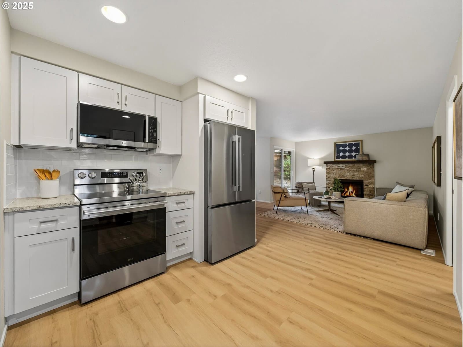 Welcome to this stunning single-story contemporary home, thoughtfully updated and quietly nestled on a private cul-de-sac. Fully renovated in 2025, this move-in ready gem features fresh interior and exterior paint, offering a clean and modern look throughout. Enjoy the comfort of a new HVAC system—perfect for keeping cool in summer and cozy all year round. The home showcases luxury vinyl plank flooring throughout the main living areas, with plush carpet in the bedrooms for added warmth and comfort. The remodeled kitchen is equipped with stainless steel appliances, including a freestanding refrigerator, induction cook top electric range, built-in microwave, and dishwasher. Shaker-style cabinetry with soft-close drawers and a deep stainless-steel sink with disposal add both style and function. Both the primary and guest bathrooms have been renovated with modern finishes, creating spa-like spaces for relaxation. The cozy gas fireplace in the family room provides the perfect focal point for gatherings or quiet evenings in. Step outside to enjoy private, fully fenced back and side yards—ideal for entertaining, gardening, or relaxing in peace. Located just minutes from the 25-acre Hyland Woods Park and scenic walking trails, and close to the Beaverton Farmers Market, downtown dining, shops, and cafés.
