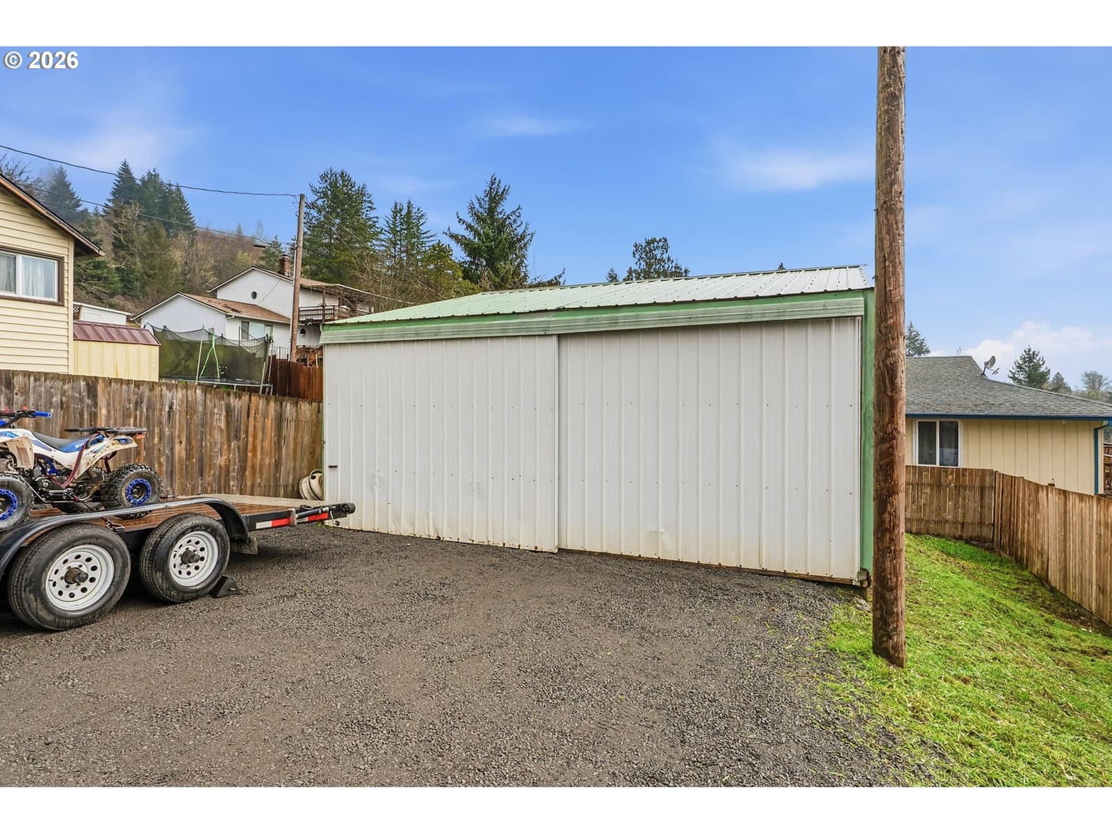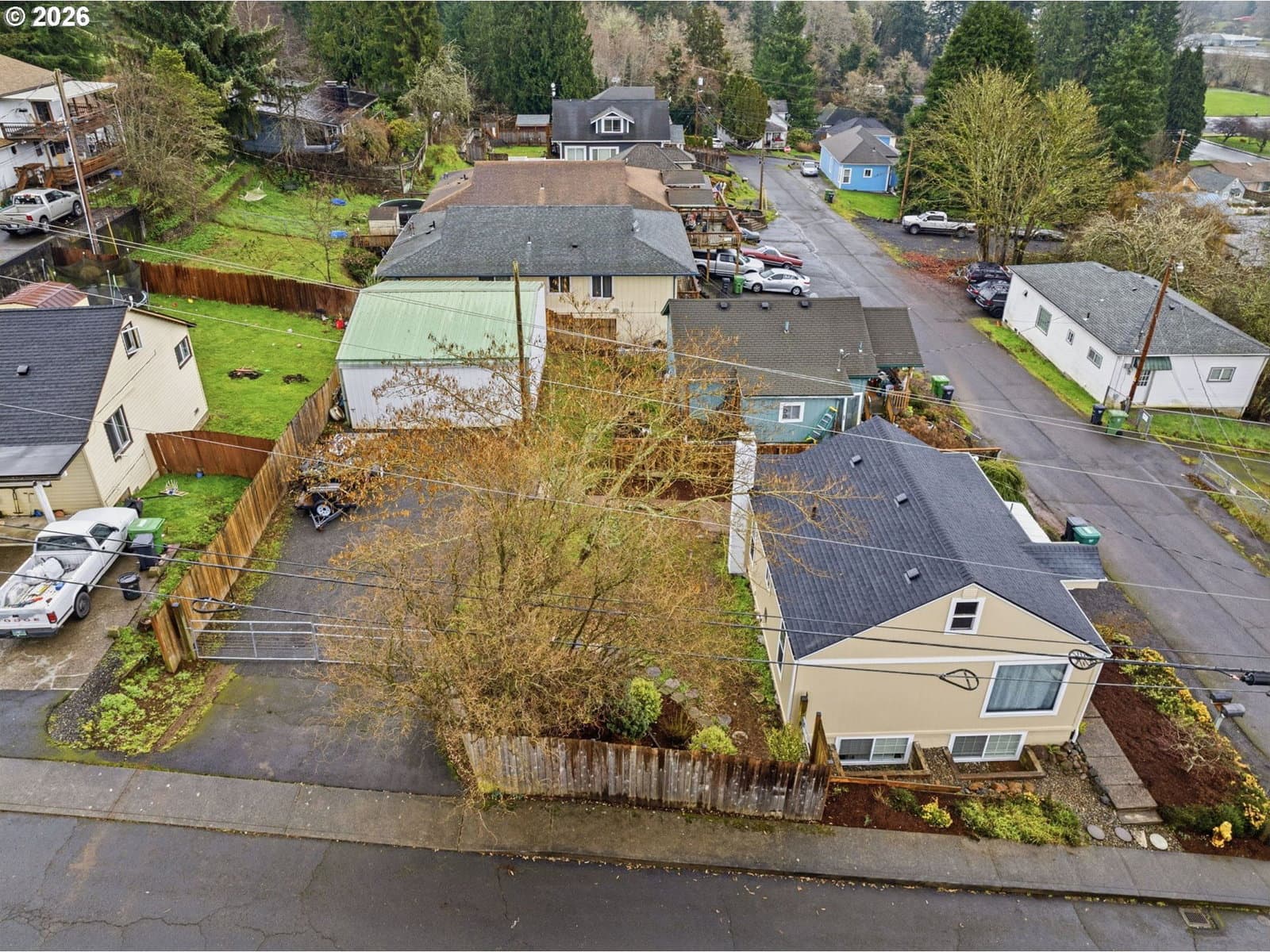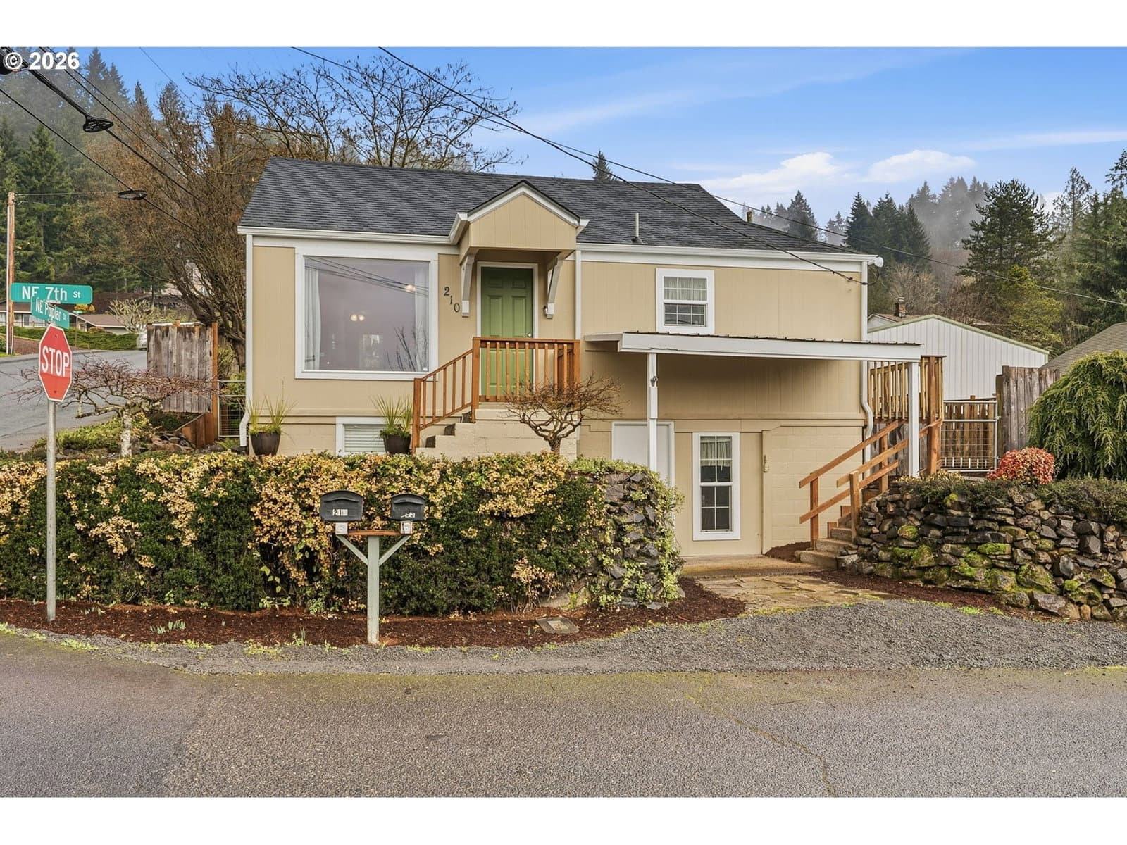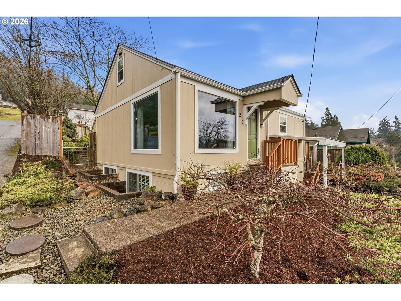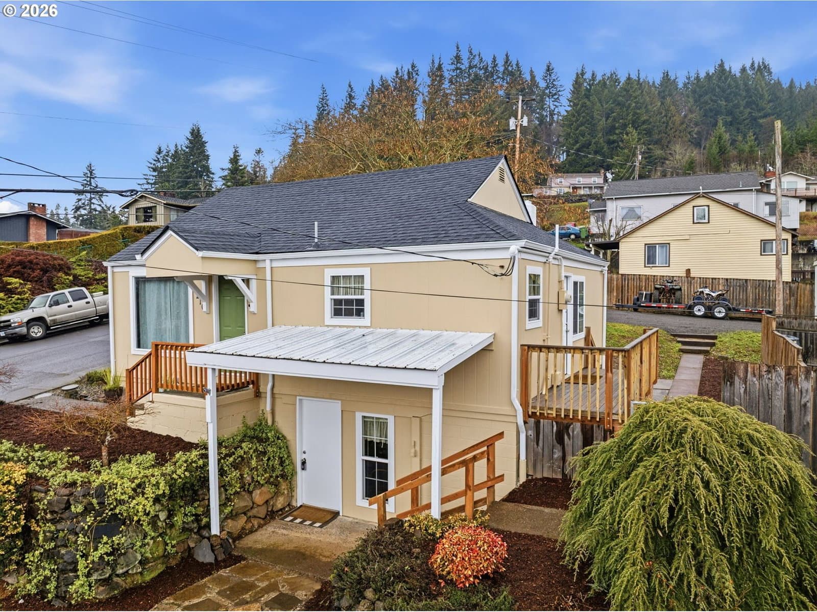 Perched on a corner lot in Clatskanie, 2bed+den, big Views, bay living-room windows framing valley, trees, and territorial/city views, plus unforgettable sunrises and sunsets. Brand-new composition roof + gutters (approx. 2 months old), fresh exterior paint, new porch railings, fresh landscaping + newly graveled driveway.Inside updates include new carpet, refreshed interior paint, and comfortable everyday features like wainscoting, ceiling fans, double-pane + storm windows, and high-speed cable internet. The finished basement with exterior entry adds flexibility for storage, hobbies, or extra living space.Enjoy an oversized detached garage/shop with 220Amp (a rare find in town), fenced yard, covered patio/deck/porch, plus RV/boat parking and storage. All this just blocks from local favorites—community pool, courts, playgrounds, and river/boat launch access.