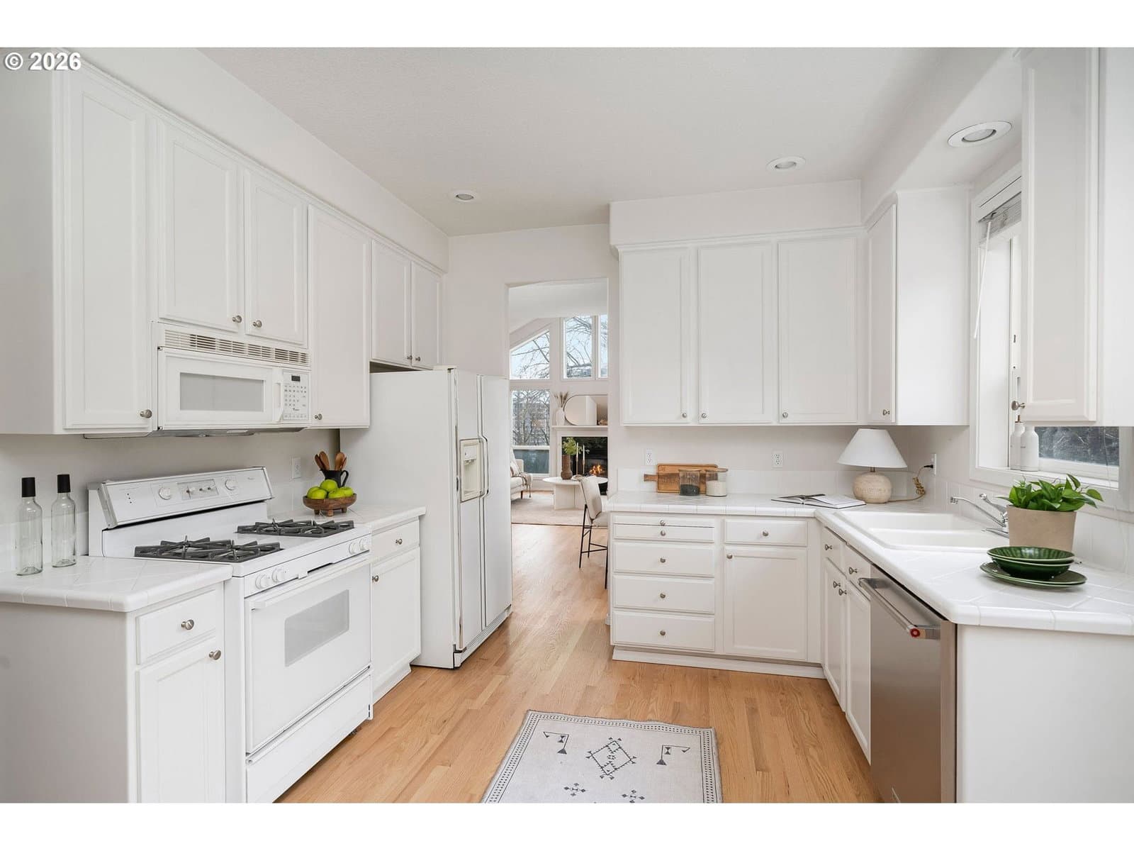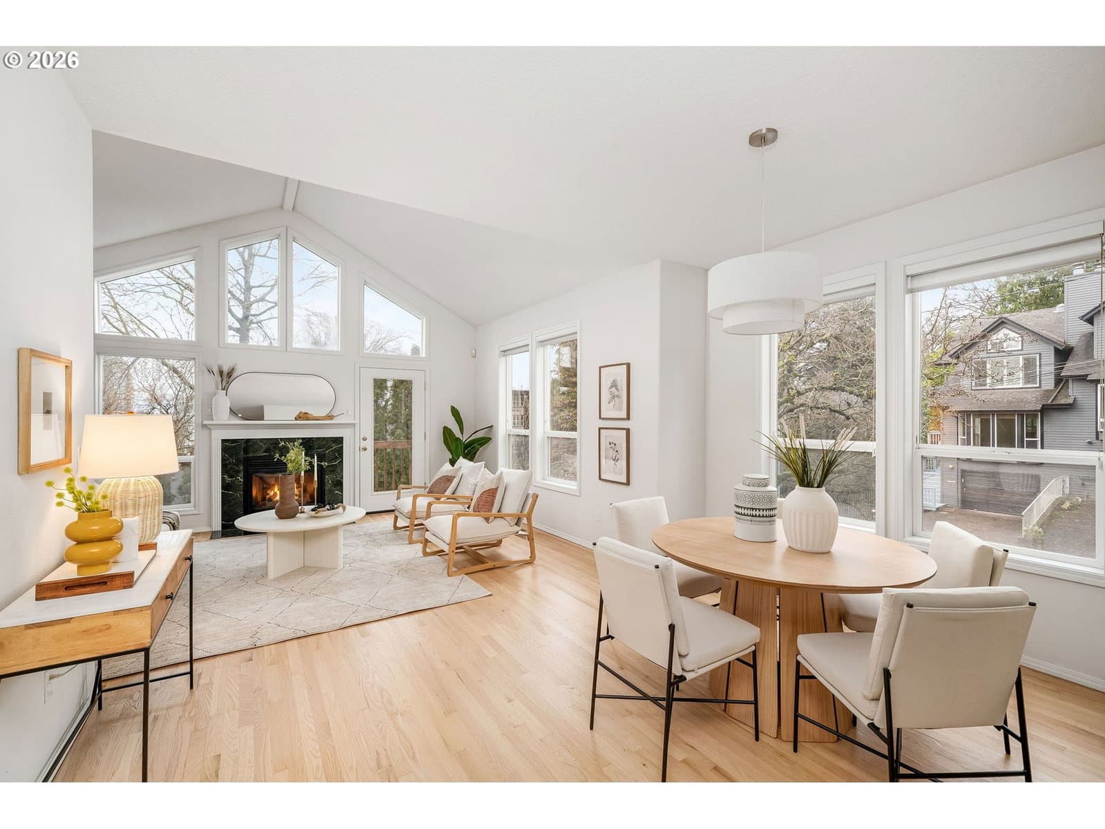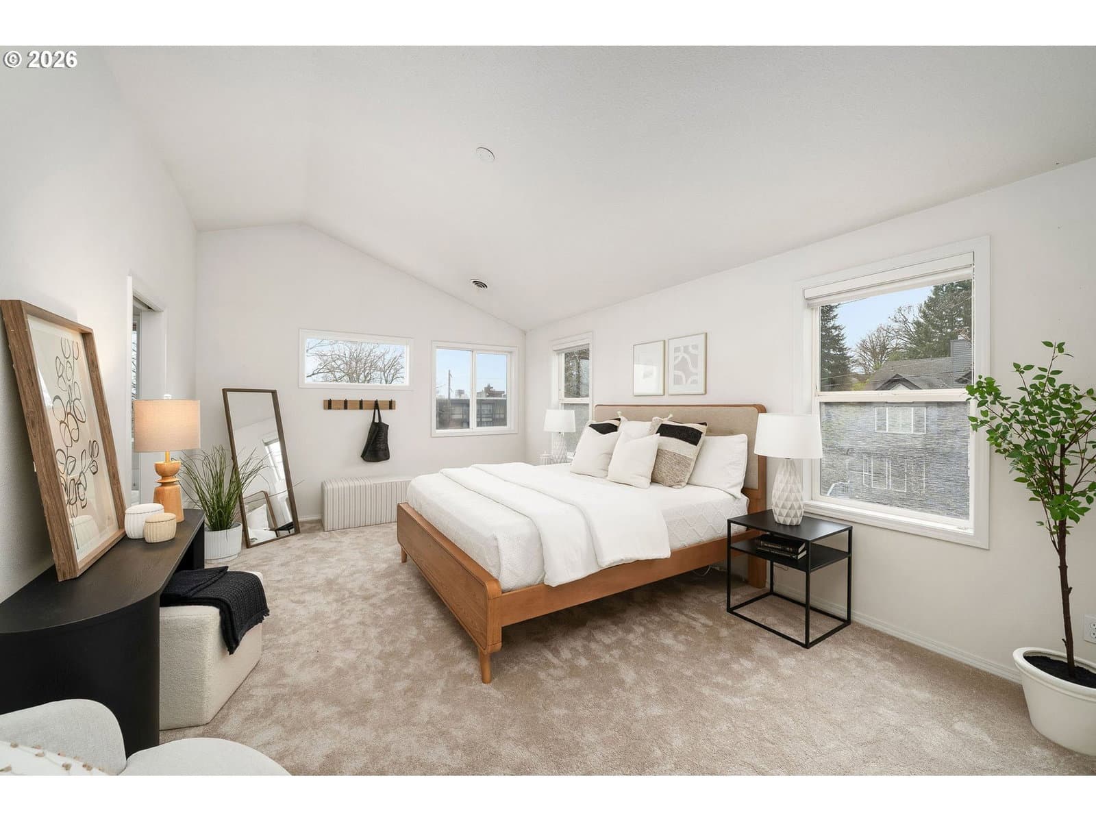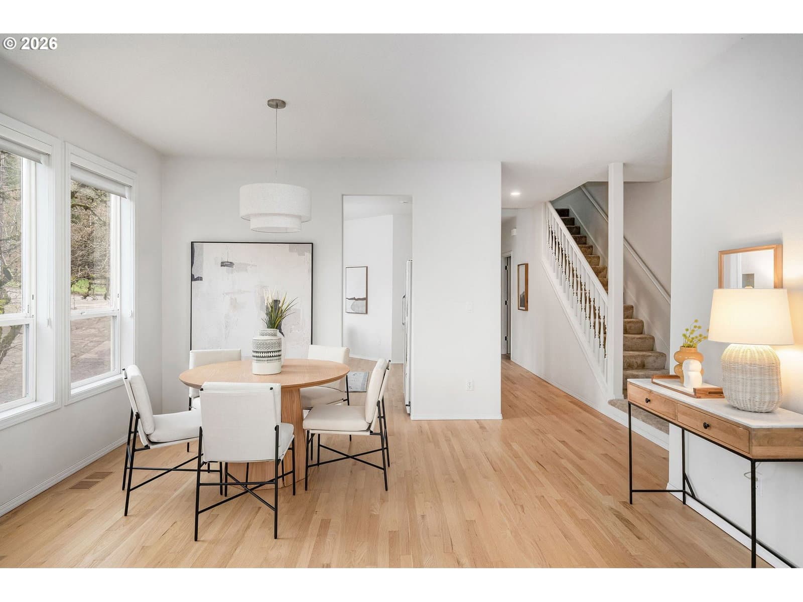 Sparkling clean townhome with gorgeous, freshly refinished real hardwood floors, new bathroom tile floors, and brand new carpeting. (booties provided!) Freshly painted kitchen cabinets, all appliances included. The kitchen has a beautiful nook for your breakfast and the dining room is just off the kitchen - both with new lighting. This bright, light and open townhome is so cheerful you just have to love it! Vast living room with big windows opens to a view deck and stairs to the garden. The upper floor is all primary suite, with terrific storage and large windows, a big bathroom and walk-in closet. Room for a desk or reading nook in the hallway. Downstairs, you'll enjoy outside access to the level brick patio and beautiful gardens. Two nice bedrooms, hall bath and laundry room complete the package. Under garage and in-garage storage make this house so livable! Lovingly purchased for its excellent proximity to Portland State Univ. and blocks to the tram, this centrally located home is perfect for OHSU or PSU workers, or anyone who loves being so close to downtown. NO HOA, just a maintenance agreement with the neighbor - you can rent or enjoy it all to yourself. Garden was professionally installed and the lush plants are a summer treat. What a terrific home! [Home Energy Score = 5. HES Report at https://rpt.greenbuildingregistry.com/hes/OR10238025]