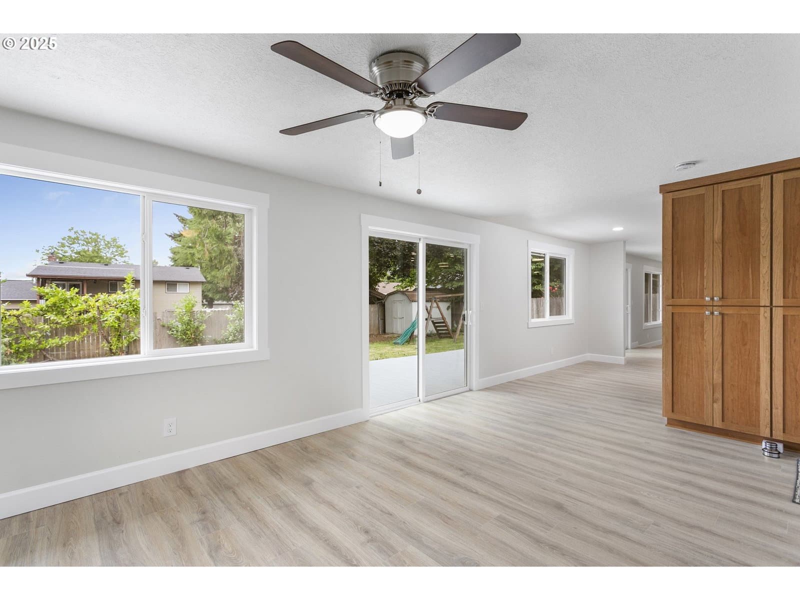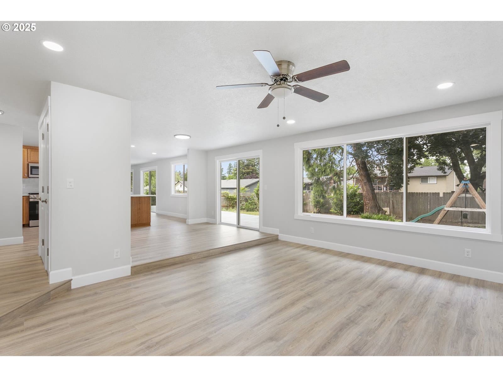 Stunning full interior remodel-like new. Features new vintage oak laminate flooring.Kitchen & bathrooms boast custom cabinetry With beautiful quartz counter tops done by local cabinet company. Fresh interior paint, all new : trim, modern 2 panel doors,updated lighting, & new hardware throughout. The kitchen is equipped w/ all new GE appliances including a new gas stove w/top griddle, new fridge,dishwasher and microwave included. Enjoy 2 living spaces that each feature sliding doors that open to a spacious deck and fully fenced yard -perfect for entertaining and plenty of room on the side for outdoor adventure toys.Ductless cooling & heating system. Both bathrooms completely remodeled including new bath, new shower, new toilets, etc. Don't miss this meticulously upgraded home!