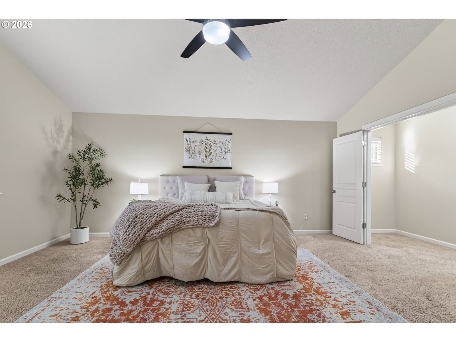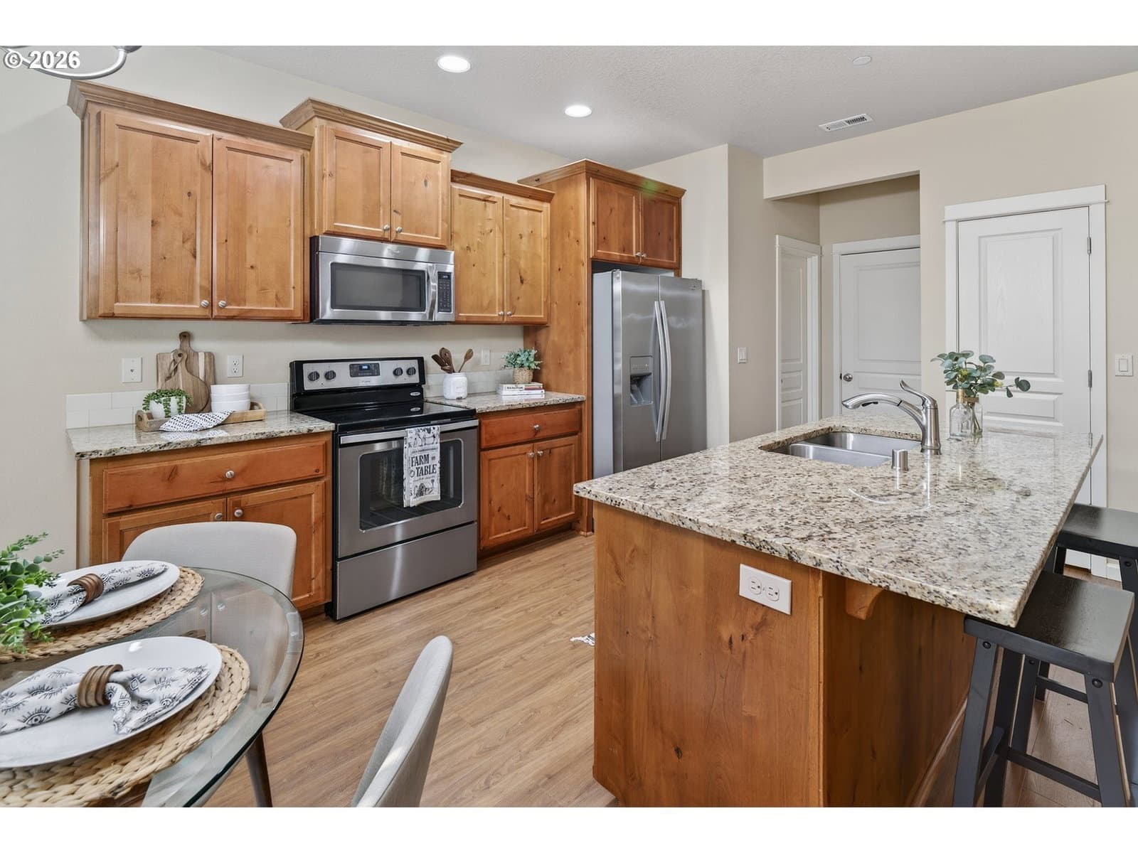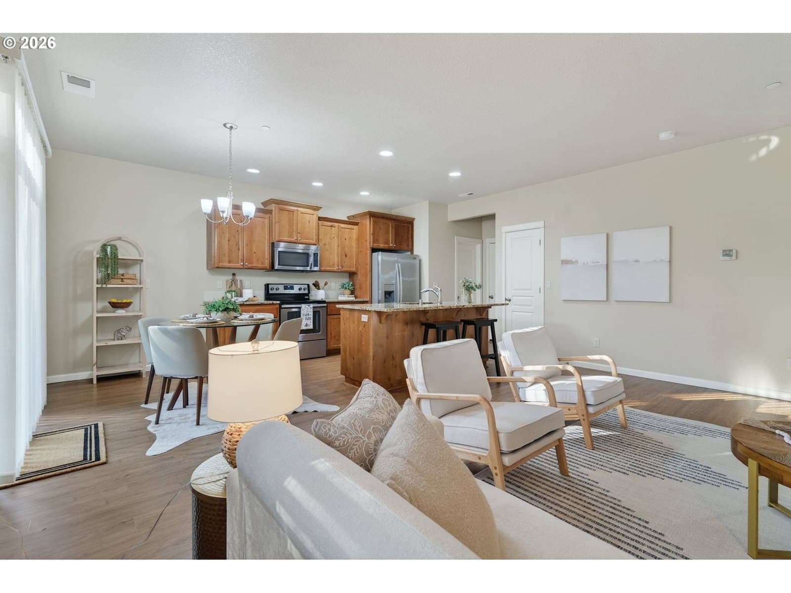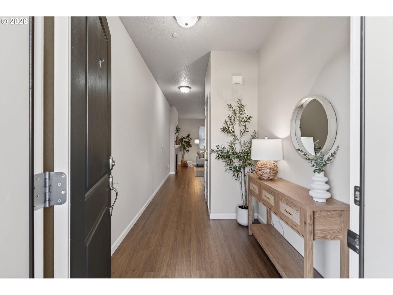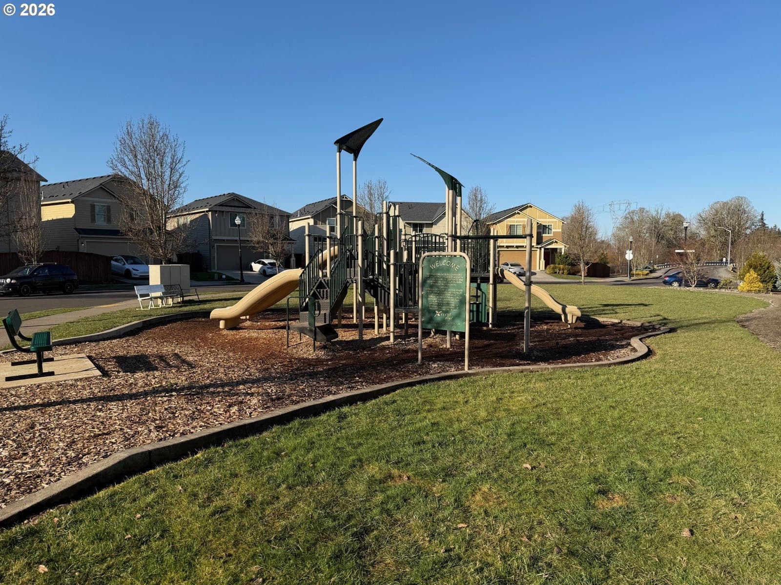 Welcome to this beautiful move-in ready 3 bedroom, 2 1/2 bathroom home. This well maintained home features an open great room floorplan that includes 9 ft ceilings, luxury vinyl plank flooring and a gas fireplace. The Kitchen features stainless steel appliances, pantry, refrigerator and a large island with granite countertop and eating bar. A dining area leads to a private backyard with a large concrete patio overlooking trees and open space behind. Upstairs you will find an oversize primary suite that has vaulted ceilings with fan. The Primary bath has double sinks and shower with new sliding doors and a large walk-in closet. There are two additional spacious bedrooms and an upstairs laundry room.The home has a 2 car garage and A/C for year round comfort The backyard is fenced and has a large concrete porch overlooking open space/field. No homes directly behind this home. All appliances stay with home including refrigerator and washer/dryer. This desirable neighborhood is centrally located and near shopping, entertainment and freeways. The neighborhood has a playground at the end of the block. HOA covers front yard landscaping and common areas.